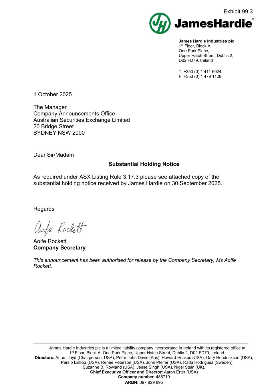 James Hardie Industries plc 1st Floor, Block A, One Park Place, Upper Hatch Street, Dublin 2, D02 FD79, Ireland T: +353 (0) 1 411 6924 F: +353 (0) 1 479 1128 James Hardie Industries plc is a limited liability company incorporated in Ireland with its registered office at 1st Floor, Block A, One Park Place, Upper Hatch Street, Dublin 2, D02 FD79, Ireland. Directors: Anne Lloyd (Chairperson, USA), Peter-John Davis (Aus), Howard Heckes (USA), Gary Hendrickson (USA), Persio Lisboa (USA), Renee Peterson (USA), John Pfeifer (USA), Rada Rodriguez (Sweden), Suzanne B. Rowland (USA), Jesse Singh (USA), Nigel Stein (UK). Chief Executive Officer and Director: Aaron Erter (USA) Company number: 485719 ARBN: 097 829 895 1 October 2025 The Manager Company Announcements Office Australian Securities Exchange Limited 20 Bridge Street SYDNEY NSW 2000 Dear Sir/Madam Substantial Holding Notice As required under ASX Listing Rule 3.17.3 please see attached copy of the substantial holding notice received by James Hardie on 30 September 2025. Regards Aoife Rockett Company Secretary This announcement has been authorised for release by the Company Secretary, Ms Aoife Rockett.