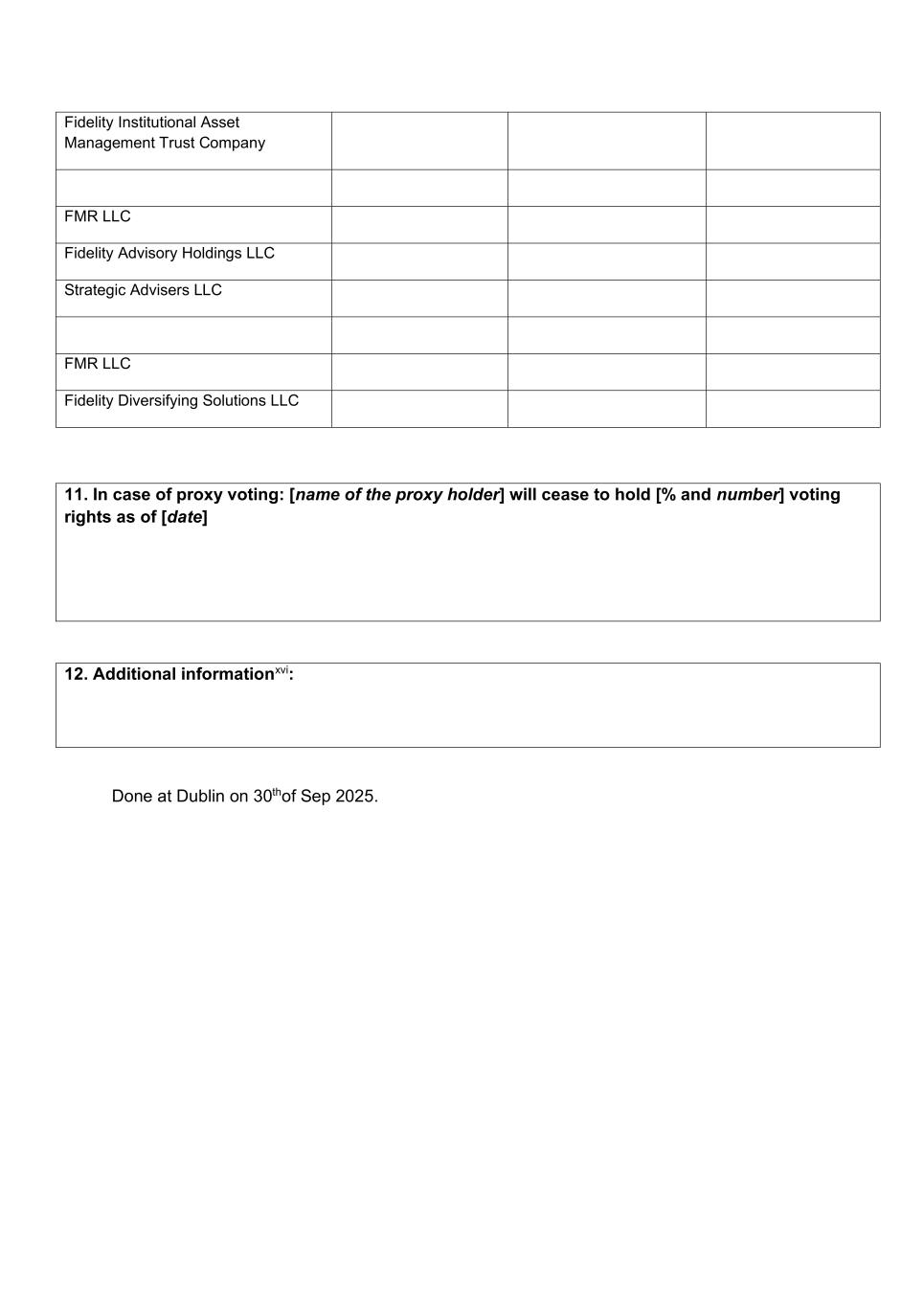 Fidelity Institutional Asset Management Trust Company FMR LLC Fidelity Advisory Holdings LLC Strategic Advisers LLC FMR LLC Fidelity Diversifying Solutions LLC 11. In case of proxy voting: [name of the proxy holder] will cease to hold [% and number] voting rights as of [date] 12. Additional informationxvi: Done at Dublin on 30thof Sep 2025.