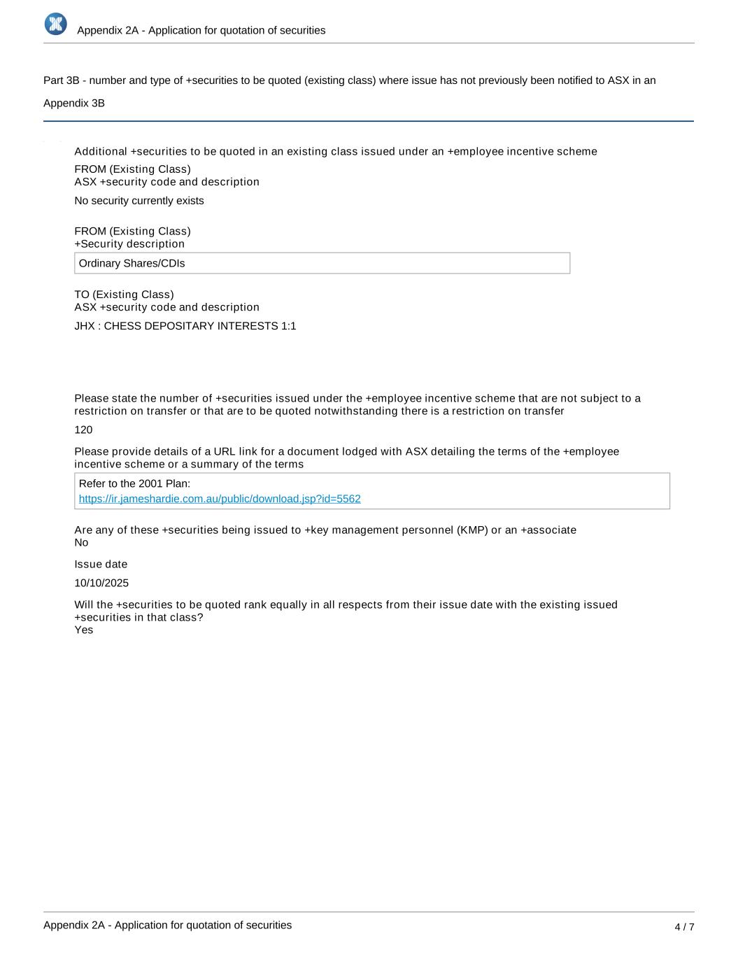 Appendix 2A - Application for quotation of securities Appendix 2A - Application for quotation of securities 4 / 7 Part 3B - number and type of +securities to be quoted (existing class) where issue has not previously been notified to ASX in an Appendix 3B Additional +securities to be quoted in an existing class issued under an +employee incentive scheme FROM (Existing Class) ASX +security code and description No security currently exists FROM (Existing Class) +Security description Ordinary Shares/CDIs TO (Existing Class) ASX +security code and description JHX : CHESS DEPOSITARY INTERESTS 1:1 Please state the number of +securities issued under the +employee incentive scheme that are not subject to a restriction on transfer or that are to be quoted notwithstanding there is a restriction on transfer 120 Please provide details of a URL link for a document lodged with ASX detailing the terms of the +employee incentive scheme or a summary of the terms Refer to the 2001 Plan: https://ir.jameshardie.com.au/public/download.jsp?id=5562 Are any of these +securities being issued to +key management personnel (KMP) or an +associate Issue date 10/10/2025 Will the +securities to be quoted rank equally in all respects from their issue date with the existing issued +securities in that class? Yes No