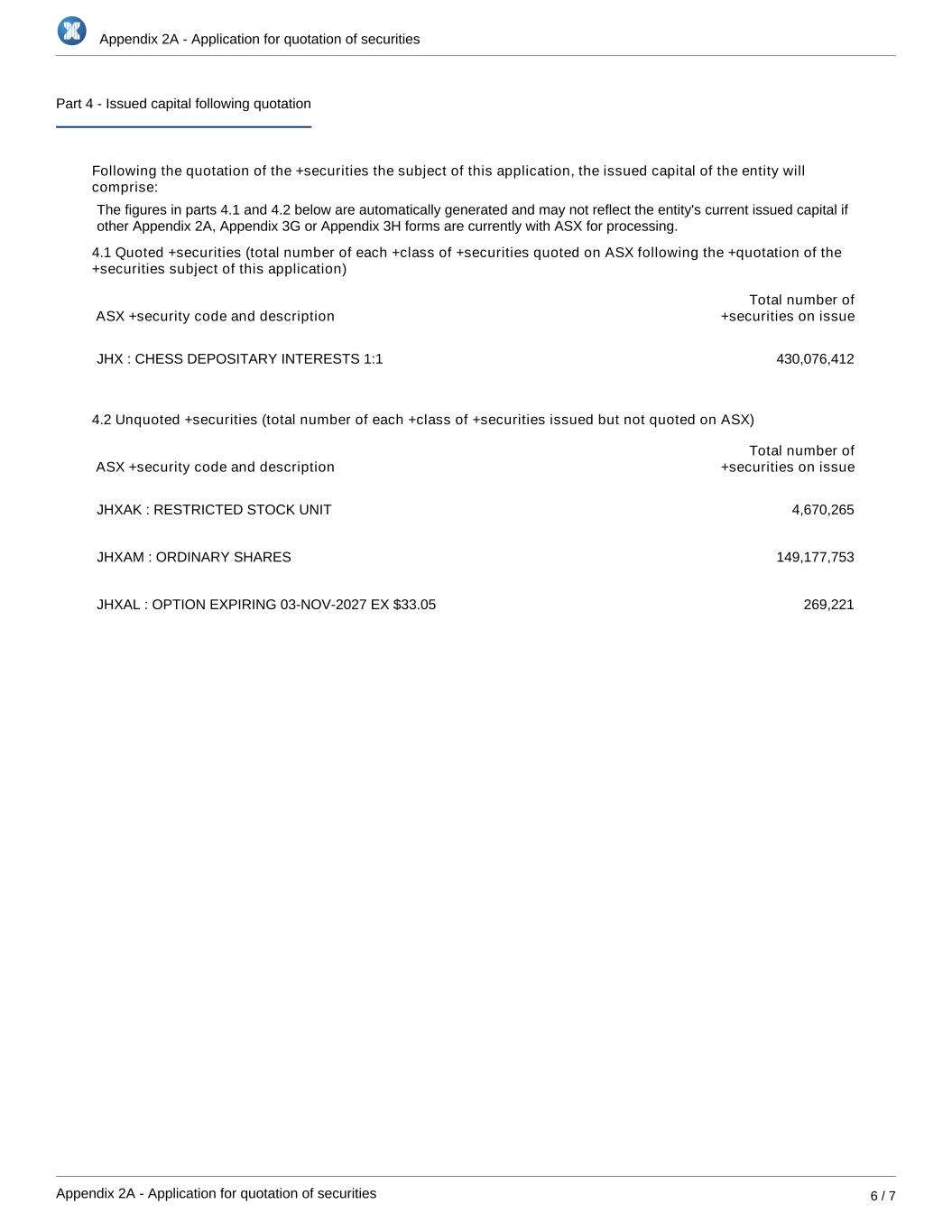 Appendix 2A - Application for quotation of securities Appendix 2A - Application for quotation of securities 6 / 7 Part 4 - Issued capital following quotation Following the quotation of the +securities the subject of this application, the issued capital of the entity will comprise: The figures in parts 4.1 and 4.2 below are automatically generated and may not reflect the entity's current issued capital if other Appendix 2A, Appendix 3G or Appendix 3H forms are currently with ASX for processing. 4.1 Quoted +securities (total number of each +class of +securities quoted on ASX following the +quotation of the +securities subject of this application) ASX +security code and description Total number of +securities on issue JHX : CHESS DEPOSITARY INTERESTS 1:1 430,076,412 4.2 Unquoted +securities (total number of each +class of +securities issued but not quoted on ASX) ASX +security code and description Total number of +securities on issue JHXAK : RESTRICTED STOCK UNIT 4,670,265 JHXAM : ORDINARY SHARES 149,177,753 JHXAL : OPTION EXPIRING 03-NOV-2027 EX $33.05 269,221