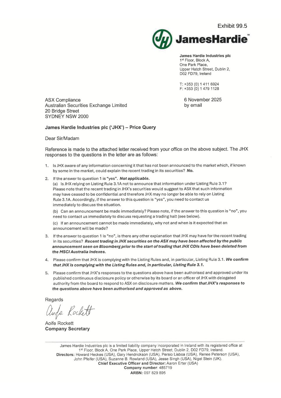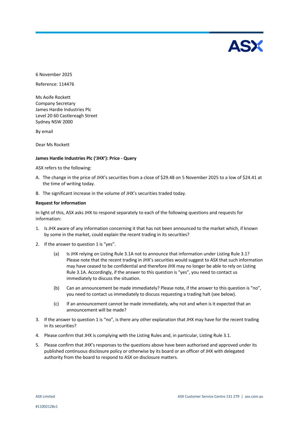 ASX Limited [[Listings]] ASX Customer Service Centre 131 279 | asx.com.au #11002128v1 6 November 2025 Reference: 114476 Ms Aoife Rockett Company Secretary James Hardie Industries Plc Level 20 60 Castlereagh Street Sydney NSW 2000 By email Dear Ms Rockett James Hardie Industries Plc (‘JHX’): Price - Query ASX refers to the following: A. The change in the price of JHX’s securities from a close of $29.48 on 5 November 2025 to a low of $24.41 at the time of writing today. B. The significant increase in the volume of JHX’s securities traded today. Request for information In light of this, ASX asks JHX to respond separately to each of the following questions and requests for information: 1. Is JHX aware of any information concerning it that has not been announced to the market which, if known by some in the market, could explain the recent trading in its securities? 2. If the answer to question 1 is “yes”. (a) Is JHX relying on Listing Rule 3.1A not to announce that information under Listing Rule 3.1? Please note that the recent trading in JHX’s securities would suggest to ASX that such information may have ceased to be confidential and therefore JHX may no longer be able to rely on Listing Rule 3.1A. Accordingly, if the answer to this question is “yes”, you need to contact us immediately to discuss the situation. (b) Can an announcement be made immediately? Please note, if the answer to this question is “no”, you need to contact us immediately to discuss requesting a trading halt (see below). (c) If an announcement cannot be made immediately, why not and when is it expected that an announcement will be made? 3. If the answer to question 1 is “no”, is there any other explanation that JHX may have for the recent trading in its securities? 4. Please confirm that JHX is complying with the Listing Rules and, in particular, Listing Rule 3.1. 5. Please confirm that JHX’s responses to the questions above have been authorised and approved under its published continuous disclosure policy or otherwise by its board or an officer of JHX with delegated authority from the board to respond to ASX on disclosure matters.