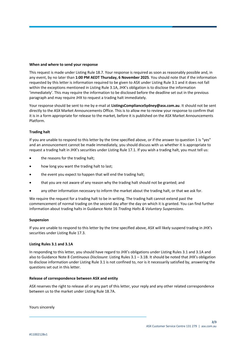 2/3 ASX Customer Service Centre 131 279 | asx.com.au #11002128v1 When and where to send your response This request is made under Listing Rule 18.7. Your response is required as soon as reasonably possible and, in any event, by no later than 1:00 PM AEDT Thursday, 6 November 2025. You should note that if the information requested by this letter is information required to be given to ASX under Listing Rule 3.1 and it does not fall within the exceptions mentioned in Listing Rule 3.1A, JHX’s obligation is to disclose the information ‘immediately’. This may require the information to be disclosed before the deadline set out in the previous paragraph and may require JHX to request a trading halt immediately. Your response should be sent to me by e-mail at ListingsComplianceSydney@asx.com.au. It should not be sent directly to the ASX Market Announcements Office. This is to allow me to review your response to confirm that it is in a form appropriate for release to the market, before it is published on the ASX Market Announcements Platform. Trading halt If you are unable to respond to this letter by the time specified above, or if the answer to question 1 is “yes” and an announcement cannot be made immediately, you should discuss with us whether it is appropriate to request a trading halt in JHX’s securities under Listing Rule 17.1. If you wish a trading halt, you must tell us: • the reasons for the trading halt; • how long you want the trading halt to last; • the event you expect to happen that will end the trading halt; • that you are not aware of any reason why the trading halt should not be granted; and • any other information necessary to inform the market about the trading halt, or that we ask for. We require the request for a trading halt to be in writing. The trading halt cannot extend past the commencement of normal trading on the second day after the day on which it is granted. You can find further information about trading halts in Guidance Note 16 Trading Halts & Voluntary Suspensions. Suspension If you are unable to respond to this letter by the time specified above, ASX will likely suspend trading in JHX’s securities under Listing Rule 17.3. Listing Rules 3.1 and 3.1A In responding to this letter, you should have regard to JHX’s obligations under Listing Rules 3.1 and 3.1A and also to Guidance Note 8 Continuous Disclosure: Listing Rules 3.1 – 3.1B. It should be noted that JHX’s obligation to disclose information under Listing Rule 3.1 is not confined to, nor is it necessarily satisfied by, answering the questions set out in this letter. Release of correspondence between ASX and entity ASX reserves the right to release all or any part of this letter, your reply and any other related correspondence between us to the market under Listing Rule 18.7A. Yours sincerely