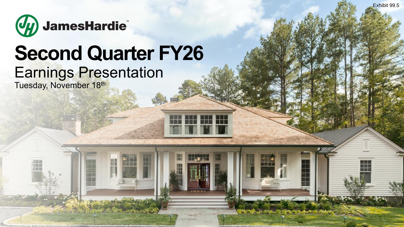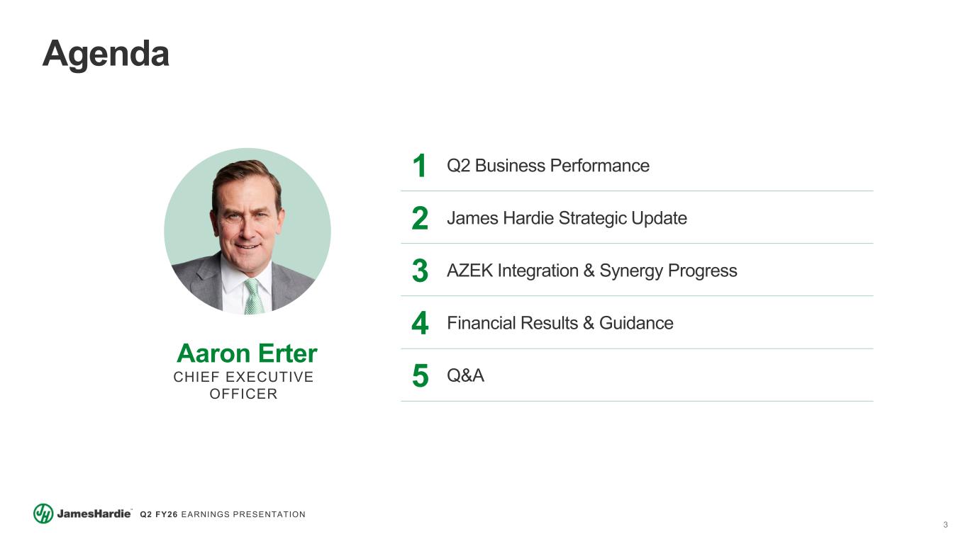 2 Q2 FY26 EARNINGS PRESENTATION Cautionary Note and Use of Non-GAAP Measures This Earnings Presentation contains forward looking statements within the meaning of the Private Securities Litigation Reform Act of 1995. James Hardie Industries plc (the “Company”) may from time to time make forward-looking statements in its periodic reports filed with or furnished to the Securities and Exchange Commission on Forms 20-F and 6-K, in its annual reports to shareholders, in media releases and other written materials and in oral statements made by the Company’s officers, directors or employees to analysts, institutional investors, representatives of the media and others. Words such as “believe,” “anticipate,” “plan,” “expect,” “intend,” “target,” “estimate,” “project,” “predict,” “forecast,” “guideline,” “aim,” “will,” “should,” “likely,” “continue,” “may,” “objective,” “outlook” and similar expressions are intended to identify forward-looking statements but are not the exclusive means of identifying such statements. These forward-looking statements are based upon management's current expectations, estimates, assumptions, beliefs and general good faith evaluation of information available at the time the forward-looking statements were made concerning future events and conditions. Readers are cautioned not to place undue reliance on any forward-looking statements or rely upon them as a guarantee of future performance or results or as an accurate indication of the times at or by which any such performance or results will be achieved. Forward-looking statements are necessarily subject to risks, uncertainties and other factors, many of which are unforeseeable and beyond the Company’s control. Many factors could cause actual results, performance or achievements to be materially different from those expressed or implied in this Earnings Presentation, including, among others, the risks and uncertainties set forth in Section 3 “Risk Factors” in James Hardie’s Annual Report on Form 20-F for the year ended March 31, 2025, which include, but are not necessarily limited to risks such as changes in general economic, political, governmental and business conditions globally and in the countries in which the Company does business; changes in interest rates; changes in inflation rates; changes in exchange rates; the level of construction generally; changes in cement demand and prices; changes in raw material and energy prices; changes in business strategy; the AZEK integration and anticipated benefits and various other factors. Should one or more of these risks or uncertainties materialize, or should underlying assumptions prove incorrect, actual results may vary materially from those described herein. James Hardie assumes no obligation to update or correct the information contained in this Earnings Presentation except as required by law. This Earnings Presentation includes financial measures that are not considered a measure of financial performance under generally accepted accounting principles in the United States (GAAP). These financial measures are designed to provide investors with an alternative method for assessing our performance from on-going operations, capital efficiency and profit generation. Management uses these financial measures for the same purposes. These financial measures are or may be non-GAAP financial measures as defined in the rules of the U.S. Securities and Exchange Commission and may exclude or include amounts that are included or excluded, as applicable, in the calculation of the most directly comparable financial measures calculated in accordance with GAAP. These non-GAAP financial measures should not be considered to be more meaningful than the equivalent GAAP measure. Management has included such measures to provide investors with an alternative method for assessing its operating results in a manner that is focused on the performance of its ongoing operations and excludes the impact of certain legacy items, such as asbestos adjustments, or significant non-recurring items, such as asset impairments, restructuring expenses, acquisition and pre-close financing related costs, as well as adjustments to tax expense. Additionally, management uses such non-GAAP financial measures for the same purposes. However, these non-GAAP financial measures are not prepared in accordance with GAAP, may not be reported by all of the Company’s competitors and may not be directly comparable to similarly titled measures of the Company’s competitors due to potential differences in the exact method of calculation. For additional information regarding the non-GAAP financial measures presented in this Earnings Presentation, including a reconciliation of each non-GAAP financial measure to the equivalent GAAP measure, see slides titled “Non-GAAP Financial Measures” included in this Earnings Presentation. This Earnings Presentation forms part of a package of information about the Company’s results. It should be read in conjunction with the other parts of this package, including the Management’s Analysis of Results, Condensed Consolidated Financial Statements and Earnings Release. All comparisons made are vs. the comparable period in the prior fiscal year and amounts presented are in US dollars, unless otherwise noted. Investor Contact Joe Ahlersmeyer, CFA Vice President, Investor Relations joe.ahlersmeyer@jameshardie.com
