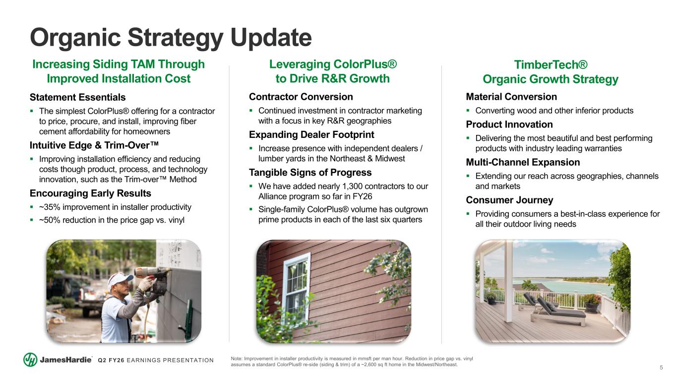 4 Q2 FY26 EARNINGS PRESENTATION 61% 5% 8% 26% James Hardie At A Glance James Hardie is a leading provider of exterior home and outdoor living solutions $5.3B FY25 REVENUE +11% 5-YEAR NORTH AMERICA REVENUE CAGR $1.4B FY25 ADJ. EBITDA 27.2% FY25 ADJ. EBITDA MARGIN Note: All financials and net sales breakdowns are based on the James Hardie 2025 fiscal year, are inclusive of AZEK Residential net sales and Adjusted EBITDA over the corresponding period, and exclude net sales and EBITDA associated with the exited James Hardie Philippines business. Breakdown percentages might not add up to 100% due to rounding. North America “NA” is reflective of the combined North America segments, Siding & Trim (S&T) and Deck, Rail & Accessories (DR&A). 81% 9% 9% Total Net Sales by Geography North America ANZ Europe NA Net Sales by Product Category Fiber Cement Exteriors NA Net Sales by End-Market 40% New Construction 60% Repair & Remodel PVC Exteriors Fiber Cement Interiors Deck, Rail & Accessories DR&A S&T DR&A S&T