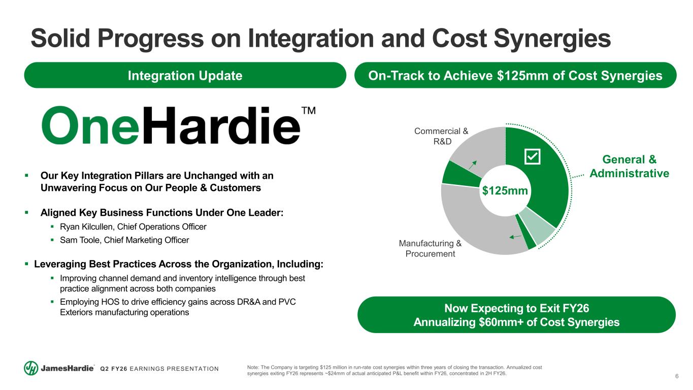 5 Q2 FY26 EARNINGS PRESENTATION Organic Strategy Update Increasing Siding TAM Through Improved Installation Cost Leveraging ColorPlus® to Drive R&R Growth TimberTech® Organic Growth Strategy Statement Essentials  The simplest ColorPlus® offering for a contractor to price, procure, and install, improving fiber cement affordability for homeowners Intuitive Edge & Trim-Over  Improving installation efficiency and reducing costs though product, process, and technology innovation, such as the Trim-over Method Encouraging Early Results  ~35% improvement in installer productivity  ~50% reduction in the price gap vs. vinyl Note: Improvement in installer productivity is measured in mmsft per man hour. Reduction in price gap vs. vinyl assumes a standard ColorPlus® re-side (siding & trim) of a ~2,600 sq ft home in the Midwest/Northeast. Contractor Conversion  Continued investment in contractor marketing with a focus in key R&R geographies Expanding Dealer Footprint  Increase presence with independent dealers / lumber yards in the Northeast & Midwest Tangible Signs of Progress  We have added nearly 1,300 contractors to our Alliance program so far in FY26  Single-family ColorPlus® volume has outgrown prime products in each of the last six quarters Material Conversion  Converting wood and other inferior products Product Innovation  Delivering the most beautiful and best performing products with industry leading warranties Multi-Channel Expansion  Extending our reach across geographies, channels and markets Consumer Journey  Providing consumers a best-in-class experience for all their outdoor living needs