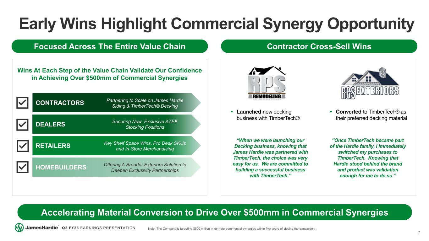 6 Q2 FY26 EARNINGS PRESENTATION Solid Progress on Integration and Cost Synergies On-Track to Achieve $125mm of Cost Synergies Now Expecting to Exit FY26 Annualizing $60mm+ of Cost Synergies Note: The Company is targeting $125 million in run-rate cost synergies within three years of closing the transaction. Annualized cost synergies exiting FY26 represents ~$24mm of actual anticipated P&L benefit within FY26, concentrated in 2H FY26. Manufacturing & Procurement Commercial & R&D General & Administrative $125mm Integration Update  Our Key Integration Pillars are Unchanged with an Unwavering Focus on Our People & Customers  Aligned Key Business Functions Under One Leader:  Ryan Kilcullen, Chief Operations Officer  Sam Toole, Chief Marketing Officer  Leveraging Best Practices Across the Organization, Including:  Improving channel demand and inventory intelligence through best practice alignment across both companies  Employing HOS to drive efficiency gains across DR&A and PVC Exteriors manufacturing operations