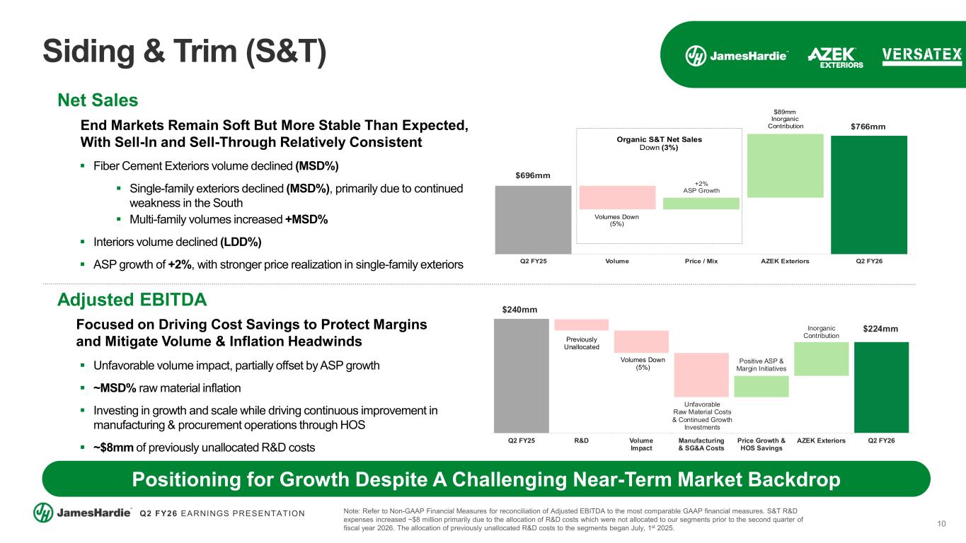 9 Q2 FY26 EARNINGS PRESENTATION Organic Business Results Note: Adjusted EBITDA and Adjusted EBITDA Margin are non-GAAP financial measures. Refer to Non-GAAP Financial Measures for reconciliation of to the most comparable GAAP financial measures. Net Sales $345mm +5% Adjusted EBITDA $89mm +10% Adjusted EBITDA Margin 25.7% +100bps Net Sales $947mm (1%) Adjusted EBITDA $241mm (8%) Adjusted EBITDA Margin 25.4% (200bps)