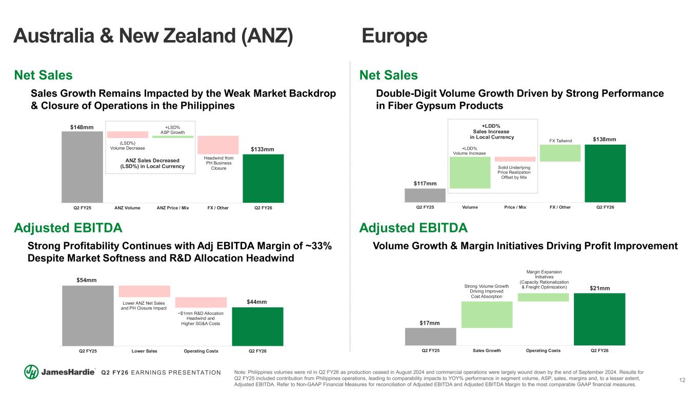 11 Q2 FY26 EARNINGS PRESENTATION Net Sales Net Sales and Sell-Through Increased +MSD%, with Sell-Through Growth Consistent Sequentially  Q2 Net Sales of $256mm, up +6%  Solid price / mix benefit and volumes up modestly vs prior year  Strong performance continued for our premium decking, railing, accessories and pergolas offerings Deck, Rail & Accessories (DR&A) DR&A Positioned To Continue Delivering Above Market Growth And Margin Expansion Adjusted EBITDA Strong DR&A Margin Performance, With Runway For Continued Expansion Through Recycling Initiatives  Q2 Adjusted EBITDA of $79mm, with an Adjusted EBITDA margin of ~31%  Favorability driven by price and volume growth along with further progress against cost- savings initiatives  Continued investment in marketing initiatives to drive material conversion and profitable share gain Note: All Deck, Rail & Accessories growth comparisons correspond to the quarter ended September 30, 2024, prior to the acquisition of AZEK by James Hardie, unless otherwise stated. Refer to Non-GAAP Financial Measures for reconciliation of Adjusted EBITDA to the most comparable GAAP financial measures.