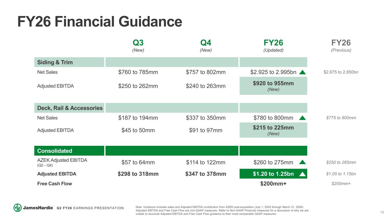 12 Q2 FY26 EARNINGS PRESENTATION $148mm ANZ Sales Decreased (LSD%) in Local Currency $133mm (LSD%) Volume Decrease +LSD% ASP Growth Headwind from PH Business Closure Q2 FY25 ANZ Volume ANZ Price / Mix FX / Other Q2 FY26 $117mm +LDD% Sales Increase in Local Currency $138mm +LDD% Volume Increase Solid Underlying Price Realization Offset by Mix FX Tailwind Q2 FY25 Volume Price / Mix FX / Other Q2 FY26 $17mm $21mmStrong Volume Growth Driving Improved Cost Absorption Margin Expansion Initiatives (Capacity Rationalization & Freight Optimization) Q2 FY25 Sales Growth Operating Costs Q2 FY26 $54mm $44mmLower ANZ Net Sales and PH Closure Impact ~$1mm R&D Allocation Headwind and Higher SG&A Costs Q2 FY25 Lower Sales Operating Costs Q2 FY26 Australia & New Zealand (ANZ) Europe Net Sales Sales Growth Remains Impacted by the Weak Market Backdrop & Closure of Operations in the Philippines Adjusted EBITDA Strong Profitability Continues with Adj EBITDA Margin of ~33% Despite Market Softness and R&D Allocation Headwind Net Sales Double-Digit Volume Growth Driven by Strong Performance in Fiber Gypsum Products Adjusted EBITDA Volume Growth & Margin Initiatives Driving Profit Improvement Note: Philippines volumes were nil in Q2 FY26 as production ceased in August 2024 and commercial operations were largely wound down by the end of September 2024. Results for Q2 FY25 included contribution from Philippines operations, leading to comparability impacts to YOY% performance in segment volume, ASP, sales, margins and, to a lesser extent, Adjusted EBITDA. Refer to Non-GAAP Financial Measures for reconciliation of Adjusted EBITDA and Adjusted EBITDA Margin to the most comparable GAAP financial measures.