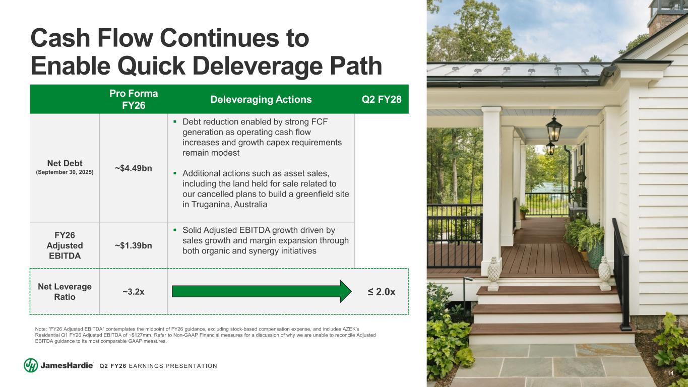 13 Q2 FY26 EARNINGS PRESENTATION FY26 Financial Guidance Note: Guidance includes sales and Adjusted EBITDA contribution from AZEK post-acquisition (July 1, 2025 through March 31, 2026). Adjusted EBITDA and Free Cash Flow are non-GAAP measures. Refer to Non-GAAP Financial measures for a discussion of why we are unable to reconcile Adjusted EBITDA and Free Cash Flow guidance to their most comparable GAAP measures. Q3 (New) Q4 (New) FY26 (Updated) FY26 (Previous) Deck, Rail & Accessories Net Sales $187 to 194mm $337 to 350mm $780 to 800mm $775 to 800mm Adjusted EBITDA $45 to 50mm $91 to 97mm $215 to 225mm (New) Consolidated AZEK Adjusted EBITDA (Q2 – Q4) $57 to 64mm $114 to 122mm $260 to 275mm $250 to 265mm Adjusted EBITDA $298 to 318mm $347 to 378mm $1.20 to 1.25bn $1.05 to 1.15bn Free Cash Flow $200mm+ $200mm+ Siding & Trim Net Sales $760 to 785mm $757 to 802mm $2.925 to 2.995bn $2.675 to 2.850bn Adjusted EBITDA $250 to 262mm $240 to 263mm $920 to 955mm (New)