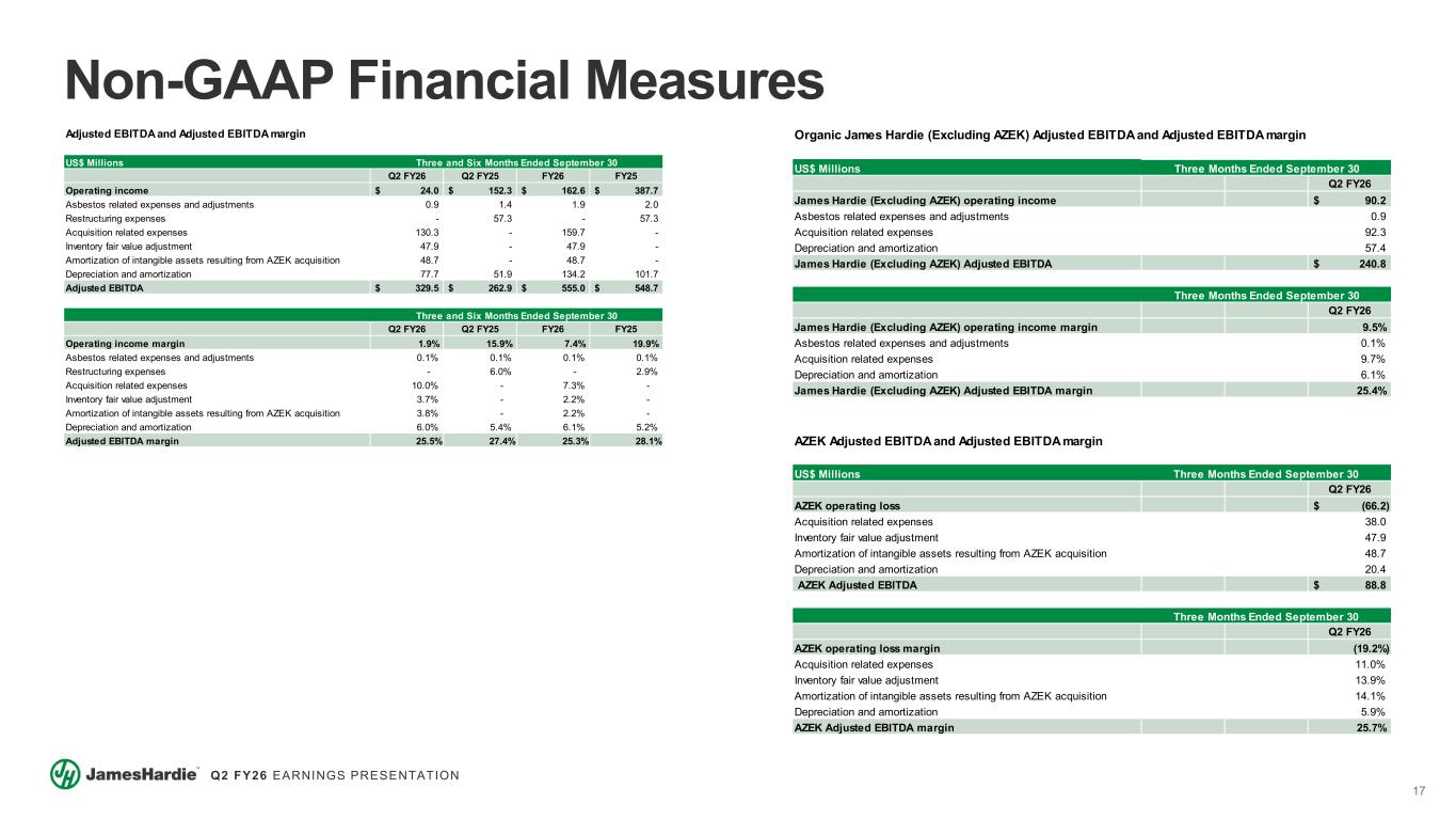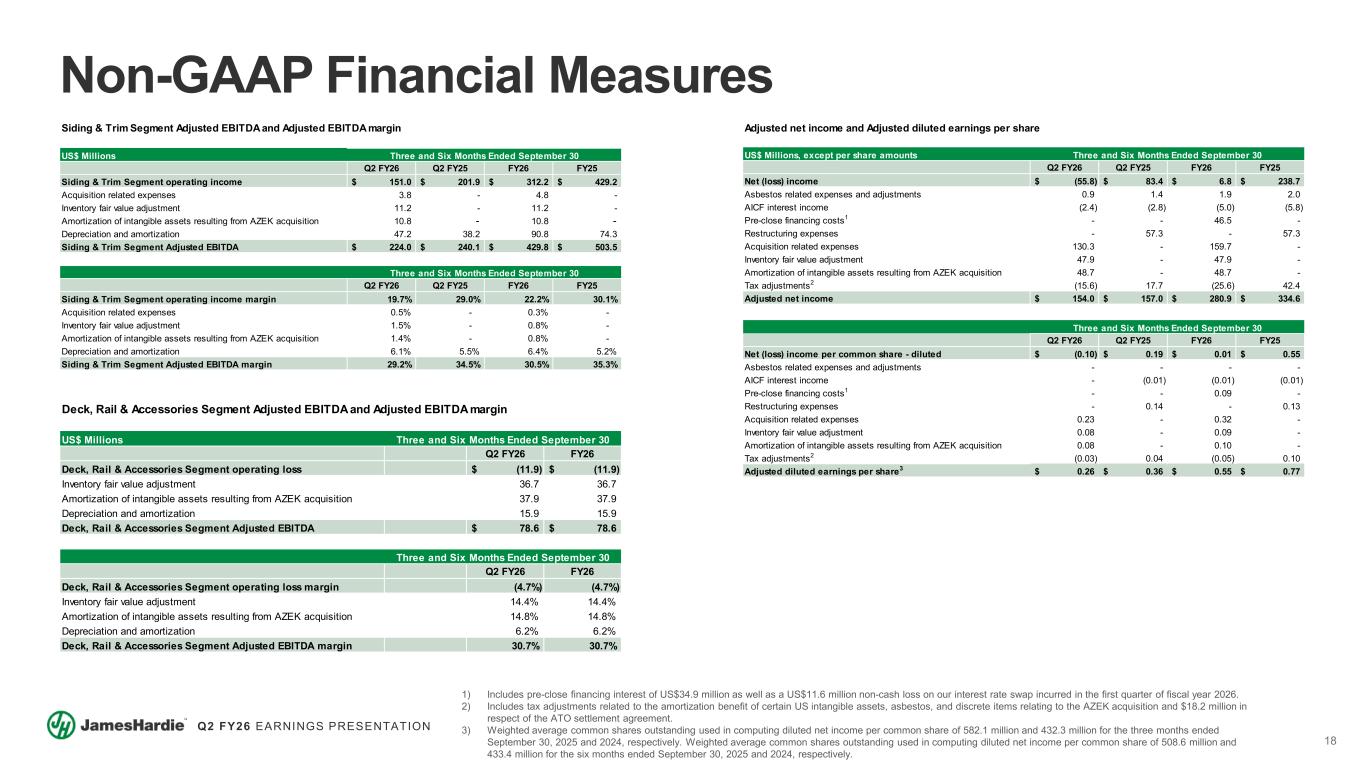 17 Q2 FY26 EARNINGS PRESENTATION US$ Millions Q2 FY26 Q2 FY25 FY26 FY25 Operating income 24.0$ 152.3$ 162.6$ 387.7$ Asbestos related expenses and adjustments 0.9 1.4 1.9 2.0 Restructuring expenses - 57.3 - 57.3 Acquisition related expenses 130.3 - 159.7 - Inventory fair value adjustment 47.9 - 47.9 - Amortization of intangible assets resulting from AZEK acquisition 48.7 - 48.7 - Depreciation and amortization 77.7 51.9 134.2 101.7 Adjusted EBITDA 329.5$ 262.9$ 555.0$ 548.7$ Q2 FY26 Q2 FY25 FY26 FY25 Operating income margin 1.9% 15.9% 7.4% 19.9% Asbestos related expenses and adjustments 0.1% 0.1% 0.1% 0.1% Restructuring expenses - 6.0% - 2.9% Acquisition related expenses 10.0% - 7.3% - Inventory fair value adjustment 3.7% - 2.2% - Amortization of intangible assets resulting from AZEK acquisition 3.8% - 2.2% - Depreciation and amortization 6.0% 5.4% 6.1% 5.2% Adjusted EBITDA margin 25.5% 27.4% 25.3% 28.1% Adjusted EBITDA and Adjusted EBITDA margin Three and Six Months Ended September 30 Three and Six Months Ended September 30 Non-GAAP Financial Measures US$ Millions Q2 FY26 James Hardie (Excluding AZEK) operating income 90.2$ Asbestos related expenses and adjustments 0.9 Acquisition related expenses 92.3 Depreciation and amortization 57.4 James Hardie (Excluding AZEK) Adjusted EBITDA 240.8$ Q2 FY26 James Hardie (Excluding AZEK) operating income margin 9.5% Asbestos related expenses and adjustments 0.1% Acquisition related expenses 9.7% Depreciation and amortization 6.1% James Hardie (Excluding AZEK) Adjusted EBITDA margin 25.4% Three Months Ended September 30 Organic James Hardie (Excluding AZEK) Adjusted EBITDA and Adjusted EBITDA margin Three Months Ended September 30 US$ Millions Q2 FY26 AZEK operating loss (66.2)$ Acquisition related expenses 38.0 Inventory fair value adjustment 47.9 Amortization of intangible assets resulting from AZEK acquisition 48.7 Depreciation and amortization 20.4 AZEK Adjusted EBITDA 88.8$ Q2 FY26 AZEK operating loss margin (19.2%) Acquisition related expenses 11.0% Inventory fair value adjustment 13.9% Amortization of intangible assets resulting from AZEK acquisition 14.1% Depreciation and amortization 5.9% AZEK Adjusted EBITDA margin 25.7% Three Months Ended September 30 Three Months Ended September 30 AZEK Adjusted EBITDA and Adjusted EBITDA margin