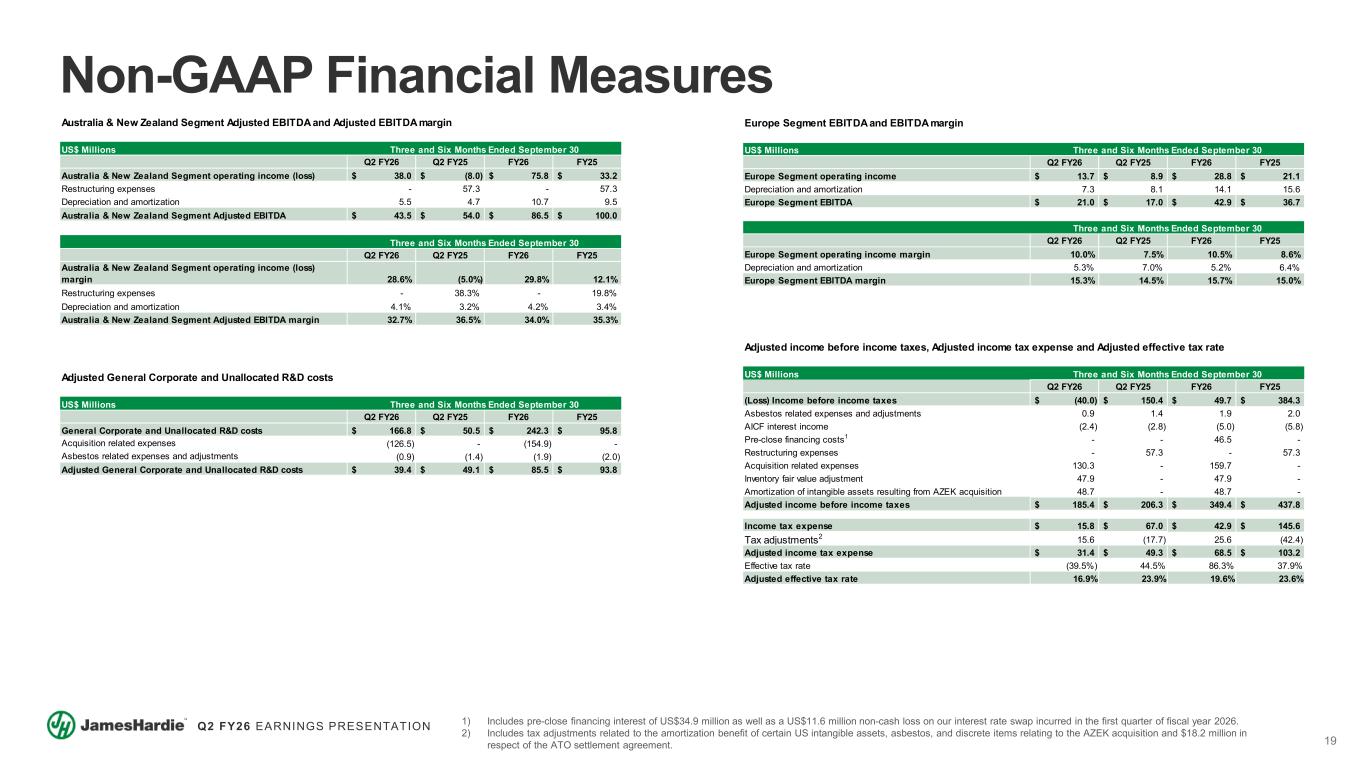 18 Q2 FY26 EARNINGS PRESENTATION US$ Millions Q2 FY26 Q2 FY25 FY26 FY25 Siding & Trim Segment operating income 151.0$ 201.9$ 312.2$ 429.2$ Acquisition related expenses 3.8 - 4.8 - Inventory fair value adjustment 11.2 - 11.2 - Amortization of intangible assets resulting from AZEK acquisition 10.8 - 10.8 - Depreciation and amortization 47.2 38.2 90.8 74.3 Siding & Trim Segment Adjusted EBITDA 224.0$ 240.1$ 429.8$ 503.5$ Q2 FY26 Q2 FY25 FY26 FY25 Siding & Trim Segment operating income margin 19.7% 29.0% 22.2% 30.1% Acquisition related expenses 0.5% - 0.3% - Inventory fair value adjustment 1.5% - 0.8% - Amortization of intangible assets resulting from AZEK acquisition 1.4% - 0.8% - Depreciation and amortization 6.1% 5.5% 6.4% 5.2% Siding & Trim Segment Adjusted EBITDA margin 29.2% 34.5% 30.5% 35.3% Three and Six Months Ended September 30 Siding & Trim Segment Adjusted EBITDA and Adjusted EBITDA margin Three and Six Months Ended September 30 Adjusted net income and Adjusted diluted earnings per share US$ Millions, except per share amounts Q2 FY26 Q2 FY25 FY26 FY25 Net (loss) income (55.8)$ 83.4$ 6.8$ 238.7$ Asbestos related expenses and adjustments 0.9 1.4 1.9 2.0 AICF interest income (2.4) (2.8) (5.0) (5.8) Pre-close financing costs1 - - 46.5 - Restructuring expenses - 57.3 - 57.3 Acquisition related expenses 130.3 - 159.7 - Inventory fair value adjustment 47.9 - 47.9 - Amortization of intangible assets resulting from AZEK acquisition 48.7 - 48.7 - Tax adjustments2 (15.6) 17.7 (25.6) 42.4 Adjusted net income 154.0$ 157.0$ 280.9$ 334.6$ Q2 FY26 Q2 FY25 FY26 FY25 Net (loss) income per common share - diluted (0.10)$ 0.19$ 0.01$ 0.55$ Asbestos related expenses and adjustments - - - - AICF interest income - (0.01) (0.01) (0.01) Pre-close financing costs1 - - 0.09 - Restructuring expenses - 0.14 - 0.13 Acquisition related expenses 0.23 - 0.32 - Inventory fair value adjustment 0.08 - 0.09 - Amortization of intangible assets resulting from AZEK acquisition 0.08 - 0.10 - Tax adjustments2 (0.03) 0.04 (0.05) 0.10 Adjusted diluted earnings per share3 0.26$ 0.36$ 0.55$ 0.77$ Three and Six Months Ended September 30 Three and Six Months Ended September 30 Non-GAAP Financial Measures 1) Includes pre-close financing interest of US$34.9 million as well as a US$11.6 million non-cash loss on our interest rate swap incurred in the first quarter of fiscal year 2026. 2) Includes tax adjustments related to the amortization benefit of certain US intangible assets, asbestos, and discrete items relating to the AZEK acquisition and $18.2 million in respect of the ATO settlement agreement. 3) Weighted average common shares outstanding used in computing diluted net income per common share of 582.1 million and 432.3 million for the three months ended September 30, 2025 and 2024, respectively. Weighted average common shares outstanding used in computing diluted net income per common share of 508.6 million and 433.4 million for the six months ended September 30, 2025 and 2024, respectively. US$ Millions Q2 FY26 FY26 Deck, Rail & Accessories Segment operating loss (11.9)$ (11.9)$ Inventory fair value adjustment 36.7 36.7 Amortization of intangible assets resulting from AZEK acquisition 37.9 37.9 Depreciation and amortization 15.9 15.9 Deck, Rail & Accessories Segment Adjusted EBITDA 78.6$ 78.6$ Q2 FY26 FY26 Deck, Rail & Accessories Segment operating loss margin (4.7%) (4.7%) Inventory fair value adjustment 14.4% 14.4% Amortization of intangible assets resulting from AZEK acquisition 14.8% 14.8% Depreciation and amortization 6.2% 6.2% Deck, Rail & Accessories Segment Adjusted EBITDA margin 30.7% 30.7% Three and Six Months Ended September 30 Three and Six Months Ended September 30 Deck, Rail & Accessories Segment Adjusted EBITDA and Adjusted EBITDA margin