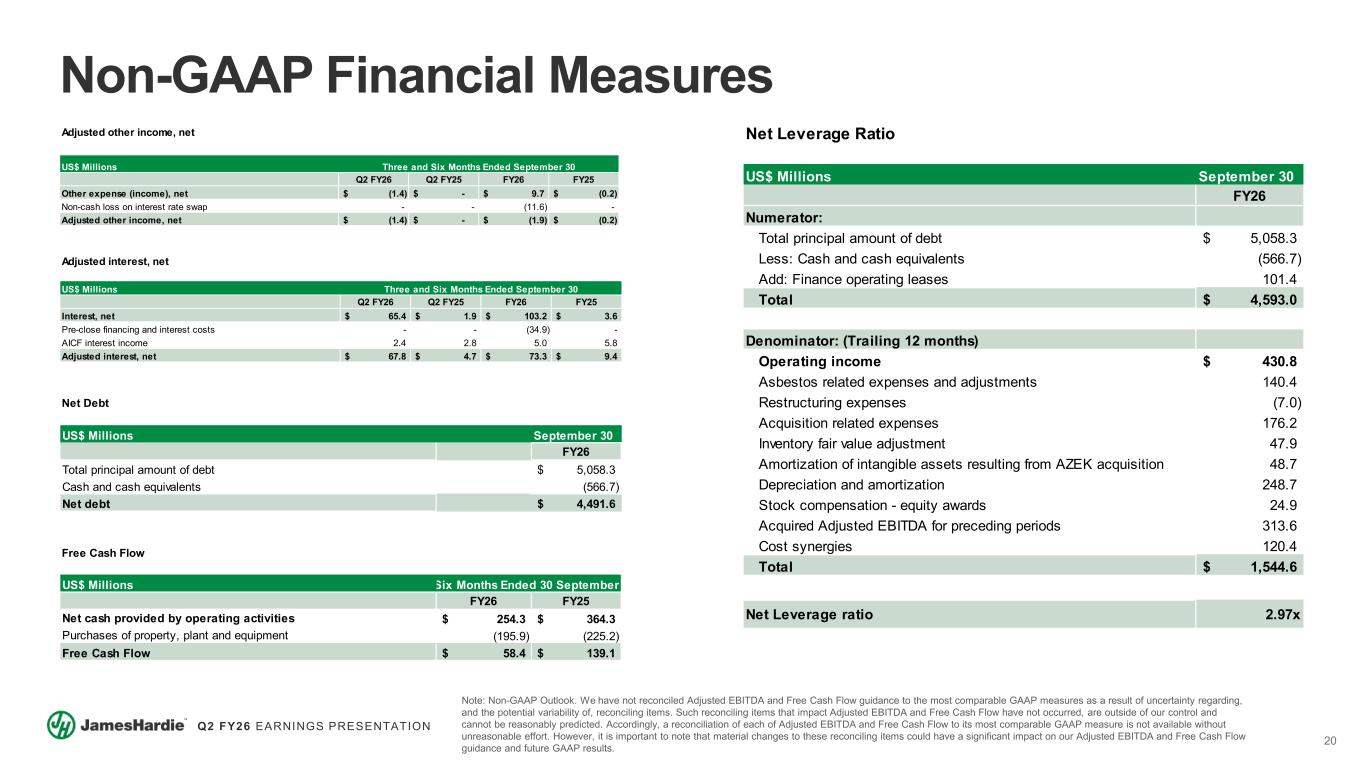 19 Q2 FY26 EARNINGS PRESENTATION US$ Millions Q2 FY26 Q2 FY25 FY26 FY25 (Loss) Income before income taxes (40.0)$ 150.4$ 49.7$ 384.3$ Asbestos related expenses and adjustments 0.9 1.4 1.9 2.0 AICF interest income (2.4) (2.8) (5.0) (5.8) Pre-close financing costs1 - - 46.5 - Restructuring expenses - 57.3 - 57.3 Acquisition related expenses 130.3 - 159.7 - Inventory fair value adjustment 47.9 - 47.9 - Amortization of intangible assets resulting from AZEK acquisition 48.7 - 48.7 - Adjusted income before income taxes 185.4$ 206.3$ 349.4$ 437.8$ Income tax expense 15.8$ 67.0$ 42.9$ 145.6$ Tax adjustments2 15.6 (17.7) 25.6 (42.4) Adjusted income tax expense 31.4$ 49.3$ 68.5$ 103.2$ Effective tax rate (39.5%) 44.5% 86.3% 37.9% Adjusted effective tax rate 16.9% 23.9% 19.6% 23.6% Three and Six Months Ended September 30 Adjusted income before income taxes, Adjusted income tax expense and Adjusted effective tax rate US$ Millions Q2 FY26 Q2 FY25 FY26 FY25 General Corporate and Unallocated R&D costs 166.8$ 50.5$ 242.3$ 95.8$ Acquisition related expenses (126.5) - (154.9) - Asbestos related expenses and adjustments (0.9) (1.4) (1.9) (2.0) Adjusted General Corporate and Unallocated R&D costs 39.4$ 49.1$ 85.5$ 93.8$ Three and Six Months Ended September 30 Adjusted General Corporate and Unallocated R&D costs US$ Millions Q2 FY26 Q2 FY25 FY26 FY25 Europe Segment operating income 13.7$ 8.9$ 28.8$ 21.1$ Depreciation and amortization 7.3 8.1 14.1 15.6 Europe Segment EBITDA 21.0$ 17.0$ 42.9$ 36.7$ Q2 FY26 Q2 FY25 FY26 FY25 Europe Segment operating income margin 10.0% 7.5% 10.5% 8.6% Depreciation and amortization 5.3% 7.0% 5.2% 6.4% Europe Segment EBITDA margin 15.3% 14.5% 15.7% 15.0% Europe Segment EBITDA and EBITDA margin Three and Six Months Ended September 30 Three and Six Months Ended September 30 US$ Millions Q2 FY26 Q2 FY25 FY26 FY25 Australia & New Zealand Segment operating income (loss) 38.0$ (8.0)$ 75.8$ 33.2$ Restructuring expenses - 57.3 - 57.3 Depreciation and amortization 5.5 4.7 10.7 9.5 Australia & New Zealand Segment Adjusted EBITDA 43.5$ 54.0$ 86.5$ 100.0$ Q2 FY26 Q2 FY25 FY26 FY25 Australia & New Zealand Segment operating income (loss) margin 28.6% (5.0%) 29.8% 12.1% Restructuring expenses - 38.3% - 19.8% Depreciation and amortization 4.1% 3.2% 4.2% 3.4% Australia & New Zealand Segment Adjusted EBITDA margin 32.7% 36.5% 34.0% 35.3% Australia & New Zealand Segment Adjusted EBITDA and Adjusted EBITDA margin Three and Six Months Ended September 30 Three and Six Months Ended September 30 Non-GAAP Financial Measures 1) Includes pre-close financing interest of US$34.9 million as well as a US$11.6 million non-cash loss on our interest rate swap incurred in the first quarter of fiscal year 2026. 2) Includes tax adjustments related to the amortization benefit of certain US intangible assets, asbestos, and discrete items relating to the AZEK acquisition and $18.2 million in respect of the ATO settlement agreement.