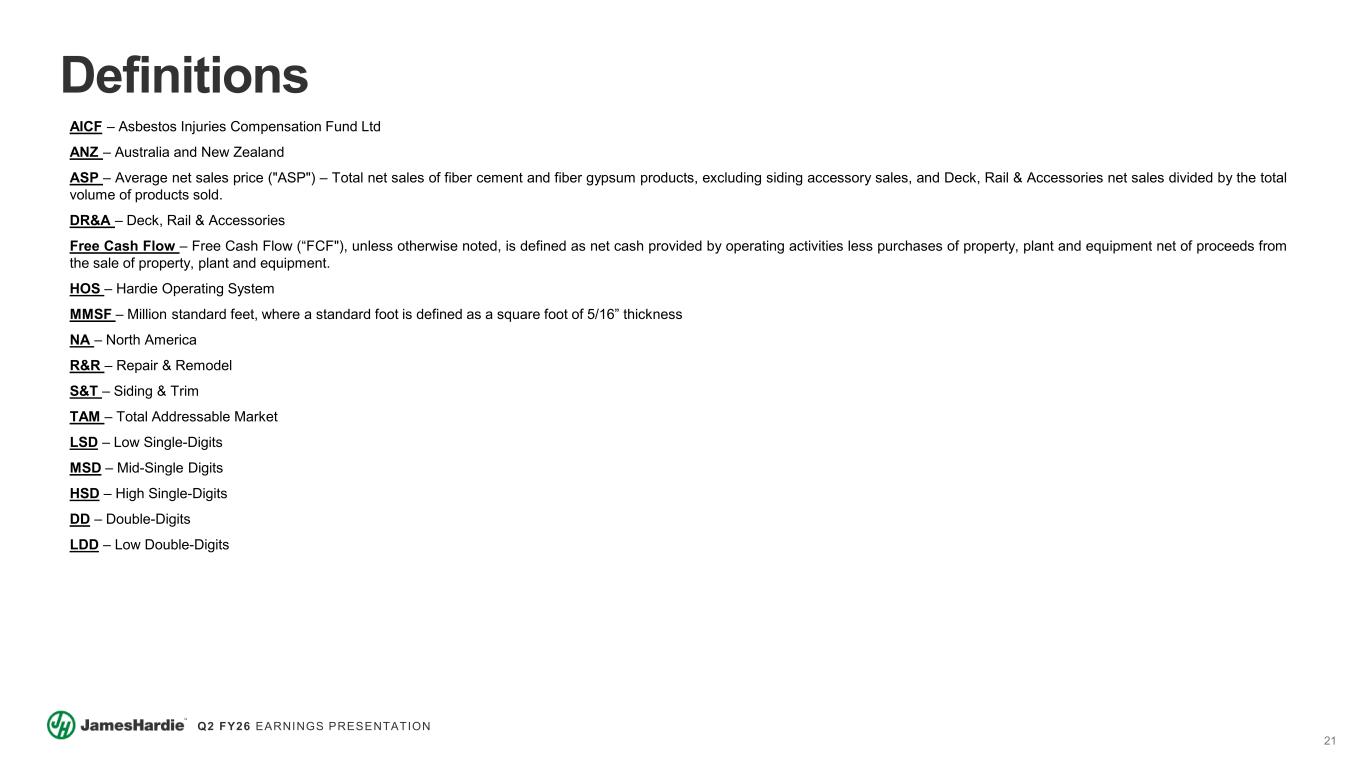 20 Q2 FY26 EARNINGS PRESENTATION US$ Millions FY26 FY25 Net cash provided by operating activities 254.3$ 364.3$ Purchases of property, plant and equipment (195.9) (225.2) Free Cash Flow 58.4$ 139.1$ Six Months Ended 30 September US$ Millions September 30 FY26 Total principal amount of debt 5,058.3$ Cash and cash equivalents (566.7) Net debt 4,491.6$ Net Leverage Ratio US$ Millions September 30 FY26 Numerator: Total principal amount of debt 5,058.3$ Less: Cash and cash equivalents (566.7) Add: Finance operating leases 101.4 Total 4,593.0$ Denominator: (Trailing 12 months) Operating income 430.8$ Asbestos related expenses and adjustments 140.4 Restructuring expenses (7.0) Acquisition related expenses 176.2 Inventory fair value adjustment 47.9 Amortization of intangible assets resulting from AZEK acquisition 48.7 Depreciation and amortization 248.7 Stock compensation - equity awards 24.9 Acquired Adjusted EBITDA for preceding periods 313.6 Cost synergies 120.4 Total 1,544.6$ Net Leverage ratio 2.97x Non-GAAP Financial Measures Note: Non-GAAP Outlook. We have not reconciled Adjusted EBITDA and Free Cash Flow guidance to the most comparable GAAP measures as a result of uncertainty regarding, and the potential variability of, reconciling items. Such reconciling items that impact Adjusted EBITDA and Free Cash Flow have not occurred, are outside of our control and cannot be reasonably predicted. Accordingly, a reconciliation of each of Adjusted EBITDA and Free Cash Flow to its most comparable GAAP measure is not available without unreasonable effort. However, it is important to note that material changes to these reconciling items could have a significant impact on our Adjusted EBITDA and Free Cash Flow guidance and future GAAP results. US$ Millions Q2 FY26 Q2 FY25 FY26 FY25 Other expense (income), net (1.4)$ -$ 9.7$ (0.2)$ Non-cash loss on interest rate swap - - (11.6) - Adjusted other income, net (1.4)$ -$ (1.9)$ (0.2)$ Adjusted other income, net Three and Six Months Ended September 30 US$ Millions Q2 FY26 Q2 FY25 FY26 FY25 Interest, net 65.4$ 1.9$ 103.2$ 3.6$ Pre-close financing and interest costs - - (34.9) - AICF interest income 2.4 2.8 5.0 5.8 Adjusted interest, net 67.8$ 4.7$ 73.3$ 9.4$ Adjusted interest, net Three and Six Months Ended September 30 Net Debt Free Cash Flow