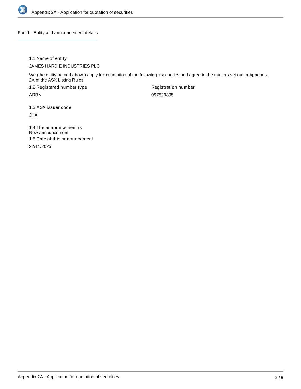 Appendix 2A - Application for quotation of securities Appendix 2A - Application for quotation of securities 2 / 6 Part 1 - Entity and announcement details 1.1 Name of entity JAMES HARDIE INDUSTRIES PLC We (the entity named above) apply for +quotation of the following +securities and agree to the matters set out in Appendix 2A of the ASX Listing Rules. 1.2 Registered number type ARBN Registration number 097829895 1.3 ASX issuer code JHX 1.4 The announcement is 1.5 Date of this announcement 22/11/2025 New announcement