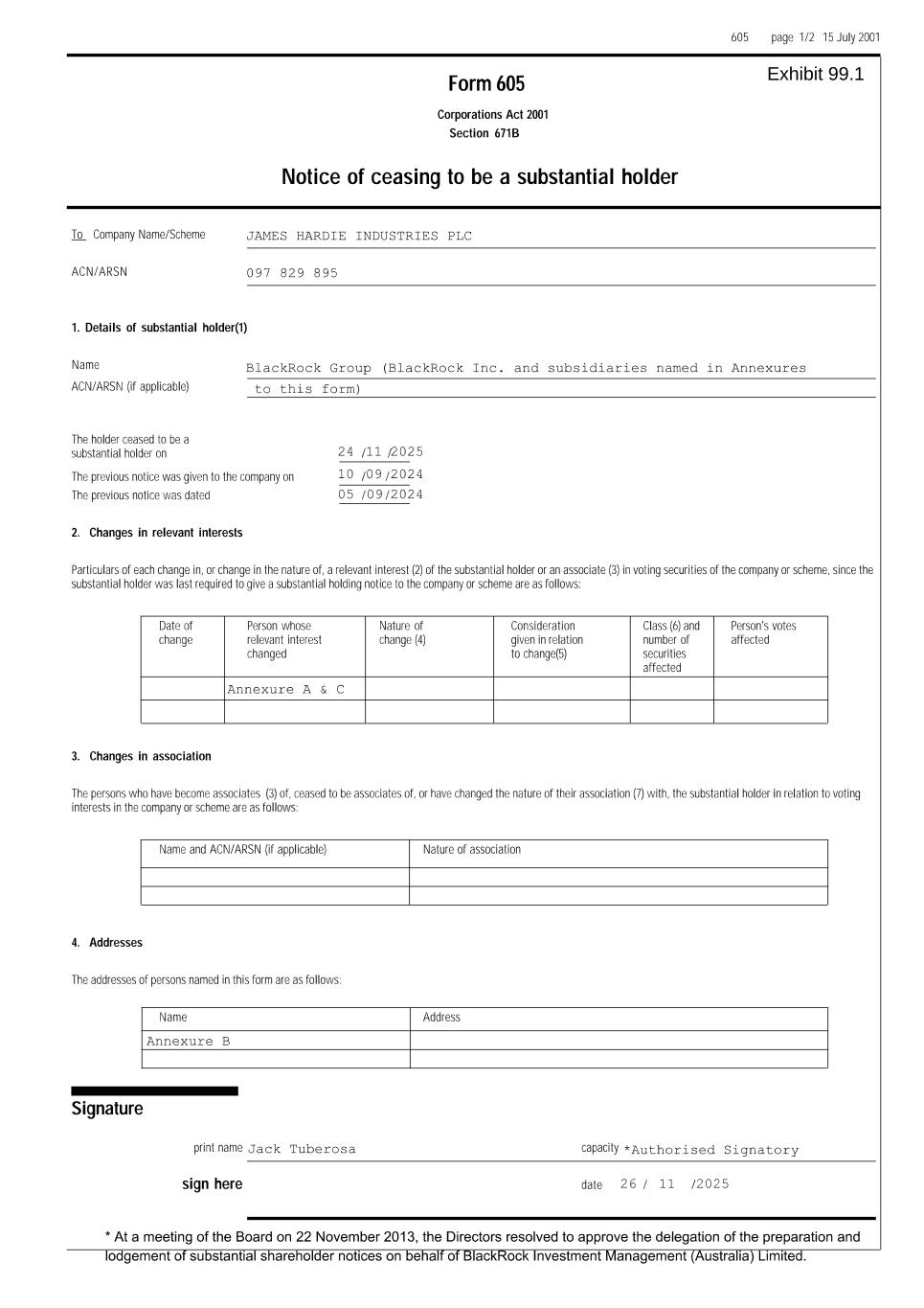 Annexure A This is Annexure A of 148 pages referred to in form 605 Notice of ceasing to be a substantial shareholder 26-Nov-25 Date 2. Changes in relevant interests 06-Sep-24 BlackRock Fund Advisors in specie n/a AUD CDI 1:1 1,770 1,770 06-Sep-24 BlackRock Fund Advisors in specie n/a AUD CDI 1:1 1,176 1,176 06-Sep-24 BlackRock Advisors, LLC on mkt sell 54.08 AUD CDI 1:1 -4,465 -4,465 06-Sep-24 BlackRock Institutional Trust Company, National Association on mkt sell 54.08 AUD CDI 1:1 -510 -510 06-Sep-24 BlackRock Advisors, LLC on mkt sell 54.08 AUD CDI 1:1 -39 -39 06-Sep-24 BlackRock Advisors, LLC on mkt sell 54.08 AUD CDI 1:1 -1,089 -1,089 06-Sep-24 BlackRock Investment Management, LLC on mkt sell 54.08 AUD CDI 1:1 -694 -694 06-Sep-24 BlackRock (Singapore) Limited on mkt sell 54.08 AUD CDI 1:1 -3,949 -3,949 06-Sep-24 BlackRock Investment Management (Australia) Limited on mkt sell 54.08 AUD CDI 1:1 -37 -37 06-Sep-24 BlackRock Investment Management, LLC on mkt sell 54.08 AUD CDI 1:1 -537 -537 06-Sep-24 BlackRock Advisors (UK) Limited on mkt buy 54.08 AUD CDI 1:1 194 194 06-Sep-24 BlackRock Advisors (UK) Limited on mkt sell 54.08 AUD CDI 1:1 -1,020 -1,020 06-Sep-24 BlackRock Advisors (UK) Limited on mkt sell 54.08 AUD CDI 1:1 -87 -87 06-Sep-24 BlackRock Advisors (UK) Limited on mkt sell 54.08 AUD CDI 1:1 -174 -174 06-Sep-24 BlackRock Institutional Trust Company, National Association on mkt sell 54.08 AUD CDI 1:1 -3,810 -3,810 06-Sep-24 BlackRock Investment Management (UK) Limited on mkt sell 54.08 AUD CDI 1:1 -1,245 -1,245 06-Sep-24 BlackRock Investment Management (Australia) Limited on mkt sell 54.08 AUD CDI 1:1 -166 -166 06-Sep-24 BlackRock Investment Management (Australia) Limited on mkt buy 54.08 AUD CDI 1:1 1,129 1,129 06-Sep-24 BlackRock Investment Management (UK) Limited on mkt sell 54.08 AUD CDI 1:1 -980 -980 06-Sep-24 BlackRock Investment Management (UK) Limited on mkt sell 54.08 AUD CDI 1:1 -112 -112 06-Sep-24 BlackRock Financial Management, Inc. on mkt sell 54.08 AUD CDI 1:1 -1,366 -1,366 06-Sep-24 BlackRock Investment Management (UK) Limited on mkt sell 54.08 AUD CDI 1:1 -1,461 -1,461 06-Sep-24 BlackRock Investment Management (UK) Limited on mkt sell 54.08 AUD CDI 1:1 -1,891 -1,891 06-Sep-24 BlackRock Financial Management, Inc. on mkt sell 54.08 AUD CDI 1:1 -1,631 -1,631 06-Sep-24 BlackRock Advisors (UK) Limited collateral transfer n/a AUD CDI 1:1 997,338 997,338 06-Sep-24 APERIO GROUP LLC in specie n/a USD ADR 1:1 4 4 06-Sep-24 APERIO GROUP LLC in specie n/a USD ADR 1:1 940 940 09-Sep-24 BlackRock Fund Advisors in specie n/a AUD CDI 1:1 -14,833 -14,833 09-Sep-24 BlackRock Fund Advisors in specie n/a AUD CDI 1:1 -8,545 -8,545 09-Sep-24 BlackRock Advisors (UK) Limited on mkt sell 53.61 AUD CDI 1:1 -3,246 -3,246 09-Sep-24 BlackRock Advisors (UK) Limited on mkt sell 53.61 AUD CDI 1:1 -3,246 -3,246 09-Sep-24 BlackRock Advisors (UK) Limited on mkt sell 53.61 AUD CDI 1:1 -234 -234 09-Sep-24 BlackRock Advisors (UK) Limited on mkt buy 53.61 AUD CDI 1:1 1,072 1,072 09-Sep-24 BlackRock Advisors (UK) Limited on mkt sell 53.61 AUD CDI 1:1 -277 -277 09-Sep-24 BlackRock Capital Management, Inc. on mkt buy 53.61 AUD CDI 1:1 130 130 09-Sep-24 BlackRock Financial Management, Inc. on mkt sell 53.61 AUD CDI 1:1 -556 -556 09-Sep-24 BlackRock Investment Management (UK) Limited on mkt buy 53.61 AUD CDI 1:1 5,126 5,126 09-Sep-24 BlackRock Investment Management (UK) Limited on mkt sell 53.61 AUD CDI 1:1 -944 -944 09-Sep-24 BlackRock Institutional Trust Company, National Association on mkt sell 53.61 AUD CDI 1:1 -7,072 -7,072 09-Sep-24 APERIO GROUP LLC in specie n/a USD ADR 1:1 116 116 Jack Tuberosa, Authorised Signatory JAMES HARDIE INDUSTRIES PLC (JHX) Date of Change Person whose relevant interest changed Nature of change (4) / Consideration given in relation to change (5) Class (6) and number of securities affected Person's votes affected CCY JHX page 1 of 148