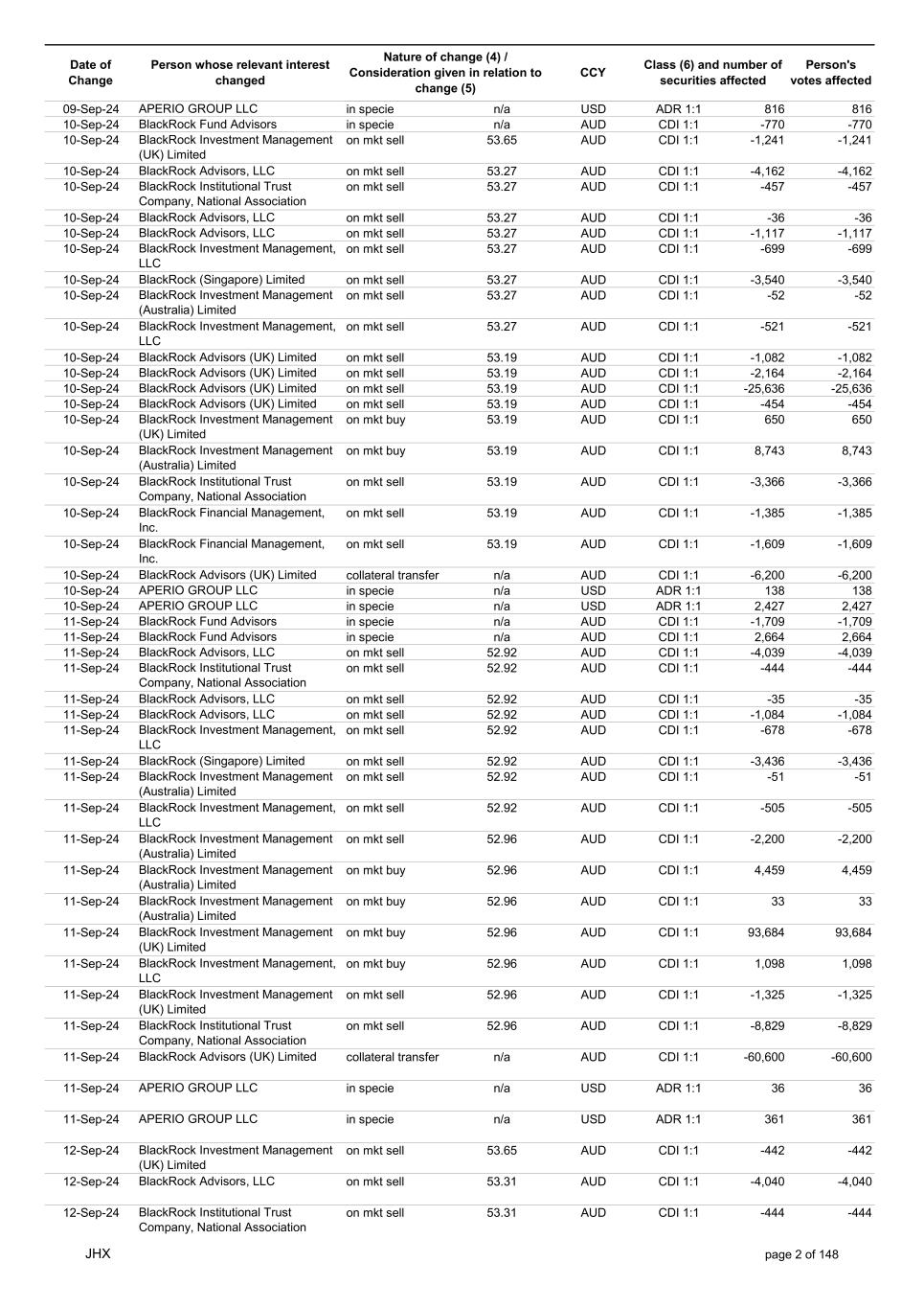 Date of Change Person whose relevant interest changed Nature of change (4) / Consideration given in relation to change (5) Class (6) and number of securities affected Person's votes affected CCY 20-Sep-24 BlackRock Investment Management (UK) Limited on mkt sell 57.89 AUD CDI 1:1 -1,449 -1,449 20-Sep-24 BlackRock Investment Management (Australia) Limited on mkt sell 57.89 AUD CDI 1:1 -583 -583 20-Sep-24 BlackRock Investment Management (Australia) Limited on mkt sell 57.89 AUD CDI 1:1 -697 -697 20-Sep-24 BlackRock Financial Management, Inc. on mkt sell 57.89 AUD CDI 1:1 -537 -537 20-Sep-24 BlackRock Fund Advisors in specie n/a AUD CDI 1:1 11,963 11,963 20-Sep-24 APERIO GROUP LLC in specie n/a USD ADR 1:1 -781 -781 20-Sep-24 APERIO GROUP LLC in specie n/a USD ADR 1:1 261 261 22-Sep-24 BlackRock Advisors (UK) Limited collateral transfer n/a AUD CDI 1:1 -132,100 -132,100 23-Sep-24 BlackRock Fund Advisors in specie n/a AUD CDI 1:1 -1,540 -1,540 23-Sep-24 BlackRock Investment Management (Australia) Limited on mkt sell 57.05 AUD CDI 1:1 -8,303 -8,303 23-Sep-24 BlackRock Investment Management on mkt sell 57.05 AUD CDI 1:1 -1,748 -1,748 23-Sep-24 BlackRock Investment Management on mkt sell 57.05 AUD CDI 1:1 -3,496 -3,496 23-Sep-24 BlackRock Investment Management (Australia) Limited on mkt buy 57.05 AUD CDI 1:1 8,740 8,740 23-Sep-24 BlackRock Advisors (UK) Limited on mkt buy 57.05 AUD CDI 1:1 171 171 23-Sep-24 BlackRock Advisors (UK) Limited on mkt buy 57.05 AUD CDI 1:1 192 192 23-Sep-24 BlackRock Advisors (UK) Limited on mkt sell 57.05 AUD CDI 1:1 -203 -203 23-Sep-24 BlackRock Advisors (UK) Limited on mkt buy 57.05 AUD CDI 1:1 277 277 23-Sep-24 BlackRock Capital Management, Inc. on mkt buy 57.05 AUD CDI 1:1 389 389 23-Sep-24 BlackRock Advisors (UK) Limited on mkt sell 57.05 AUD CDI 1:1 -1,202 -1,202 23-Sep-24 BlackRock Financial Management, Inc. on mkt buy 57.05 AUD CDI 1:1 802 802 23-Sep-24 BlackRock Institutional Trust Company, National Association on mkt sell 57.05 AUD CDI 1:1 -920 -920 23-Sep-24 BlackRock Advisors (UK) Limited collateral transfer n/a AUD CDI 1:1 338,239 338,239 23-Sep-24 APERIO GROUP LLC in specie n/a USD ADR 1:1 38 38 23-Sep-24 APERIO GROUP LLC in specie n/a USD ADR 1:1 806 806 24-Sep-24 BlackRock Fund Advisors in specie n/a AUD CDI 1:1 384 384 24-Sep-24 BlackRock Advisors, LLC on mkt sell 56.37 AUD CDI 1:1 -2,536 -2,536 24-Sep-24 BlackRock Institutional Trust Company, National Association on mkt sell 56.37 AUD CDI 1:1 -201 -201 24-Sep-24 BlackRock Advisors, LLC on mkt sell 56.37 AUD CDI 1:1 -587 -587 24-Sep-24 BlackRock Investment Management, LLC on mkt sell 56.37 AUD CDI 1:1 -374 -374 24-Sep-24 BlackRock (Singapore) Limited on mkt sell 56.37 AUD CDI 1:1 -1,542 -1,542 24-Sep-24 BlackRock Investment Management (Australia) Limited on mkt sell 56.37 AUD CDI 1:1 -32 -32 24-Sep-24 BlackRock Investment Management, LLC on mkt sell 56.37 AUD CDI 1:1 -276 -276 24-Sep-24 BlackRock Investment Management (Australia) Limited on mkt buy 56.65 AUD CDI 1:1 6,118 6,118 24-Sep-24 BlackRock Advisors (UK) Limited on mkt sell 56.65 AUD CDI 1:1 -36 -36 24-Sep-24 BlackRock Advisors (UK) Limited on mkt buy 56.65 AUD CDI 1:1 96 96 24-Sep-24 BlackRock Advisors (UK) Limited on mkt buy 56.65 AUD CDI 1:1 550 550 24-Sep-24 BlackRock Advisors (UK) Limited on mkt buy 56.65 AUD CDI 1:1 126 126 24-Sep-24 BlackRock Advisors (UK) Limited on mkt sell 56.65 AUD CDI 1:1 -678 -678 24-Sep-24 BlackRock Advisors (UK) Limited on mkt sell 56.65 AUD CDI 1:1 -174 -174 24-Sep-24 BlackRock Investment Management (UK) Limited on mkt buy 56.65 AUD CDI 1:1 629 629 JHX page 6 of 148