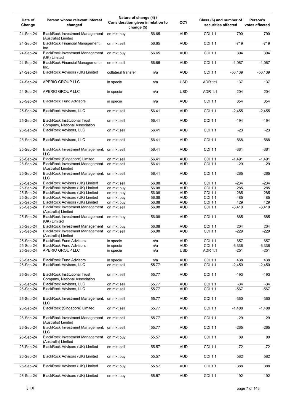 Date of Change Person whose relevant interest changed Nature of change (4) / Consideration given in relation to change (5) Class (6) and number of securities affected Person's votes affected CCY 12-Sep-24 BlackRock Advisors, LLC on mkt sell 53.31 AUD CDI 1:1 -34 -34 12-Sep-24 BlackRock Advisors, LLC on mkt sell 53.31 AUD CDI 1:1 -1,084 -1,084 12-Sep-24 BlackRock Investment Management, LLC on mkt sell 53.31 AUD CDI 1:1 -678 -678 12-Sep-24 BlackRock (Singapore) Limited on mkt sell 53.31 AUD CDI 1:1 -3,436 -3,436 12-Sep-24 BlackRock Investment Management (Australia) Limited on mkt sell 53.31 AUD CDI 1:1 -51 -51 12-Sep-24 BlackRock Investment Management, LLC on mkt sell 53.31 AUD CDI 1:1 -505 -505 12-Sep-24 BlackRock Investment Management (Australia) Limited on mkt buy 53.27 AUD CDI 1:1 4,400 4,400 12-Sep-24 BlackRock Advisors (UK) Limited on mkt buy 53.27 AUD CDI 1:1 291 291 12-Sep-24 BlackRock Advisors (UK) Limited on mkt buy 53.27 AUD CDI 1:1 388 388 12-Sep-24 BlackRock Advisors (UK) Limited on mkt buy 53.27 AUD CDI 1:1 485 485 12-Sep-24 BlackRock Advisors (UK) Limited on mkt buy 53.27 AUD CDI 1:1 1,067 1,067 12-Sep-24 BlackRock Advisors (UK) Limited on mkt sell 53.27 AUD CDI 1:1 -96 -96 12-Sep-24 BlackRock Advisors (UK) Limited on mkt sell 53.27 AUD CDI 1:1 -216 -216 12-Sep-24 BlackRock Fund Advisors in specie n/a AUD CDI 1:1 1,240 1,240 12-Sep-24 BlackRock Advisors (UK) Limited collateral transfer n/a AUD CDI 1:1 -916,306 -916,306 12-Sep-24 APERIO GROUP LLC in specie n/a USD ADR 1:1 29 29 12-Sep-24 APERIO GROUP LLC in specie n/a USD ADR 1:1 2,355 2,355 13-Sep-24 BlackRock Fund Advisors in specie n/a AUD CDI 1:1 220 220 13-Sep-24 BlackRock Investment Management (UK) Limited on mkt sell 53.55 AUD CDI 1:1 -4,337 -4,337 13-Sep-24 BlackRock Institutional Trust Company, National Association on mkt sell 53.21 AUD CDI 1:1 -1,775 -1,775 13-Sep-24 BlackRock Advisors (UK) Limited on mkt sell 53.21 AUD CDI 1:1 -558 -558 13-Sep-24 BlackRock Investment Management (Australia) Limited on mkt buy 53.21 AUD CDI 1:1 4,957 4,957 13-Sep-24 BlackRock Advisors, LLC on mkt sell 53.21 AUD CDI 1:1 -30 -30 13-Sep-24 BlackRock Investment Management (Australia) Limited on mkt buy 53.21 AUD CDI 1:1 4,358 4,358 13-Sep-24 BlackRock Investment Management (Australia) Limited on mkt buy 53.21 AUD CDI 1:1 313 313 13-Sep-24 BlackRock Financial Management, Inc. on mkt sell 53.21 AUD CDI 1:1 -1,366 -1,366 13-Sep-24 BlackRock Financial Management, Inc. on mkt sell 53.21 AUD CDI 1:1 -2,176 -2,176 13-Sep-24 BlackRock Investment Management, LLC on mkt sell 53.21 AUD CDI 1:1 -2,623 -2,623 13-Sep-24 BlackRock Institutional Trust Company, National Association on mkt sell 53.21 AUD CDI 1:1 -287 -287 13-Sep-24 BlackRock Investment Management, LLC on mkt sell 53.21 AUD CDI 1:1 -592 -592 13-Sep-24 BlackRock Financial Management, Inc. on mkt sell 53.21 AUD CDI 1:1 -2,422 -2,422 13-Sep-24 BlackRock Institutional Trust Company, National Association on mkt sell 53.21 AUD CDI 1:1 -423 -423 13-Sep-24 APERIO GROUP LLC in specie n/a USD ADR 1:1 21 21 13-Sep-24 APERIO GROUP LLC in specie n/a USD ADR 1:1 -1,793 -1,793 16-Sep-24 BlackRock Fund Advisors in specie n/a AUD CDI 1:1 1,917 1,917 16-Sep-24 BlackRock Advisors (UK) Limited on mkt buy 53.22 AUD CDI 1:1 1,079 1,079 16-Sep-24 BlackRock Advisors (UK) Limited on mkt sell 53.22 AUD CDI 1:1 -1,079 -1,079 16-Sep-24 BlackRock Advisors (UK) Limited on mkt sell 53.22 AUD CDI 1:1 -1,079 -1,079 16-Sep-24 BlackRock Advisors (UK) Limited on mkt buy 53.22 AUD CDI 1:1 194 194 JHX page 3 of 148