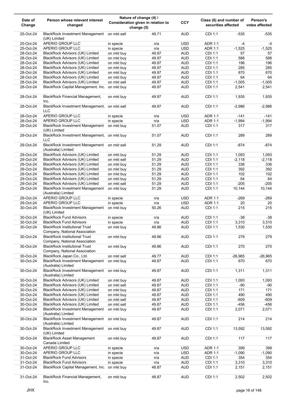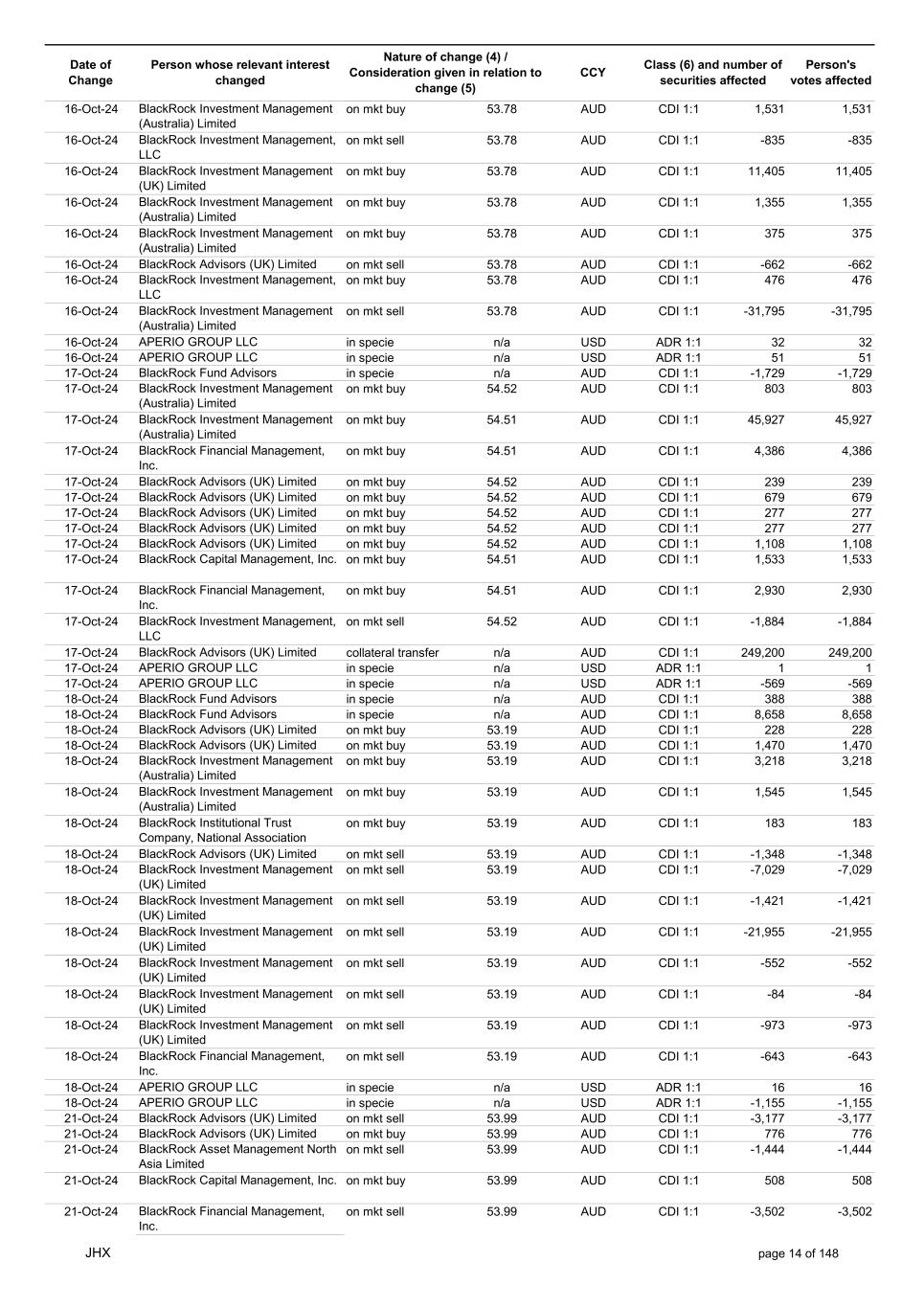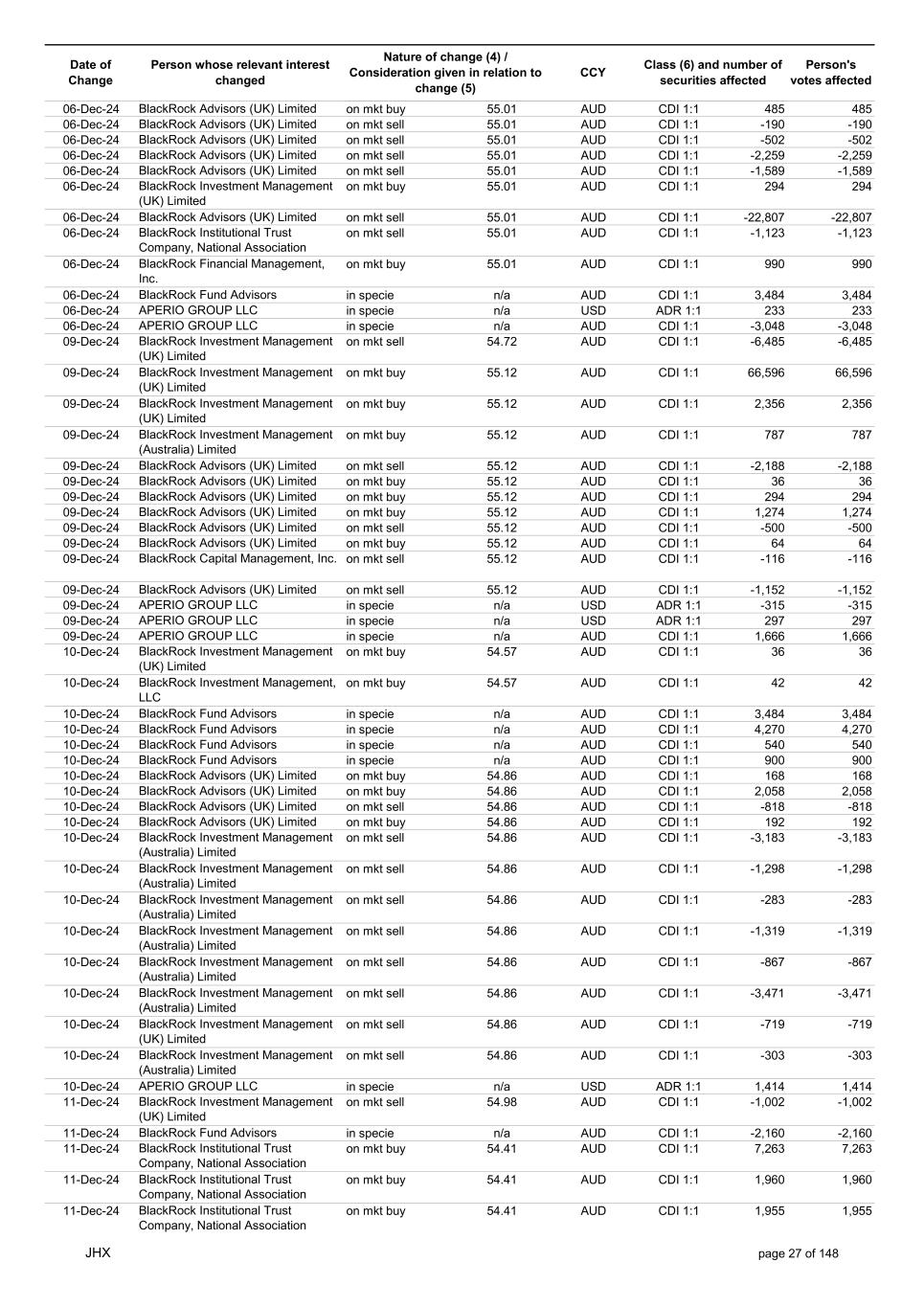 Date of Change Person whose relevant interest changed Nature of change (4) / Consideration given in relation to change (5) Class (6) and number of securities affected Person's votes affected CCY 30-Sep-24 BlackRock Advisors (UK) Limited on mkt sell 57.43 AUD CDI 1:1 -38,899 -38,899 30-Sep-24 BlackRock Fund Advisors on mkt sell 57.43 AUD CDI 1:1 -115,654 -115,654 30-Sep-24 BlackRock Investment Management (UK) Limited on mkt sell 57.43 AUD CDI 1:1 -16,164 -16,164 30-Sep-24 BlackRock Investment Management (Australia) Limited on mkt buy 57.43 AUD CDI 1:1 4,370 4,370 30-Sep-24 BlackRock Advisors (UK) Limited on mkt sell 57.43 AUD CDI 1:1 -3,228 -3,228 30-Sep-24 BlackRock Advisors (UK) Limited on mkt buy 57.43 AUD CDI 1:1 192 192 30-Sep-24 BlackRock Advisors (UK) Limited on mkt sell 57.43 AUD CDI 1:1 -441 -441 30-Sep-24 BlackRock Investment Management (UK) Limited on mkt buy 57.43 AUD CDI 1:1 658 658 30-Sep-24 BlackRock Investment Management (UK) Limited on mkt buy 57.43 AUD CDI 1:1 214 214 30-Sep-24 BlackRock Investment Management (Australia) Limited on mkt sell 57.43 AUD CDI 1:1 -295 -295 30-Sep-24 BlackRock Financial Management, Inc. on mkt sell 57.43 AUD CDI 1:1 -1,416 -1,416 30-Sep-24 BlackRock Fund Advisors on mkt buy 57.43 AUD CDI 1:1 2,157 2,157 30-Sep-24 BlackRock Fund Advisors on mkt buy 57.43 AUD CDI 1:1 1,658 1,658 30-Sep-24 BlackRock Institutional Trust Company, National Association on mkt buy 57.43 AUD CDI 1:1 4,731 4,731 30-Sep-24 BlackRock Institutional Trust Company, National Association on mkt sell 57.43 AUD CDI 1:1 -540 -540 30-Sep-24 BlackRock Fund Advisors on mkt sell 57.43 AUD CDI 1:1 -5,419 -5,419 30-Sep-24 BlackRock Institutional Trust Company, National Association on mkt buy 57.43 AUD CDI 1:1 1,228 1,228 30-Sep-24 APERIO GROUP LLC in specie n/a USD ADR 1:1 42 42 30-Sep-24 APERIO GROUP LLC in specie n/a USD ADR 1:1 3,449 3,449 01-Oct-24 BlackRock Fund Advisors in specie n/a AUD CDI 1:1 35 35 01-Oct-24 BlackRock Advisors (UK) Limited on mkt buy 56.42 AUD CDI 1:1 2,186 2,186 01-Oct-24 BlackRock Advisors (UK) Limited on mkt buy 56.42 AUD CDI 1:1 228 228 01-Oct-24 BlackRock Investment Management (Australia) Limited on mkt buy 56.42 AUD CDI 1:1 725 725 01-Oct-24 BlackRock Investment Management (Australia) Limited on mkt buy 56.42 AUD CDI 1:1 882 882 01-Oct-24 BlackRock Investment Management (Australia) Limited on mkt buy 56.42 AUD CDI 1:1 1,239 1,239 01-Oct-24 BlackRock Institutional Trust Company, National Association on mkt buy 56.42 AUD CDI 1:1 3,397 3,397 01-Oct-24 BlackRock Fund Advisors on mkt buy 56.42 AUD CDI 1:1 1,834 1,834 01-Oct-24 BlackRock Institutional Trust Company, National Association on mkt sell 56.42 AUD CDI 1:1 -4,722 -4,722 01-Oct-24 BlackRock Institutional Trust Company, National Association on mkt sell 56.42 AUD CDI 1:1 -1,280 -1,280 01-Oct-24 APERIO GROUP LLC in specie n/a USD ADR 1:1 123 123 02-Oct-24 BlackRock Fund Advisors in specie n/a AUD CDI 1:1 1,290 1,290 02-Oct-24 BlackRock Investment Management (UK) Limited on mkt sell 55.91 AUD CDI 1:1 -1,888 -1,888 02-Oct-24 BlackRock Advisors (UK) Limited on mkt buy 55.42 AUD CDI 1:1 1,096 1,096 02-Oct-24 BlackRock Advisors (UK) Limited on mkt buy 55.42 AUD CDI 1:1 1,096 1,096 02-Oct-24 BlackRock Advisors (UK) Limited on mkt buy 55.42 AUD CDI 1:1 1,096 1,096 02-Oct-24 BlackRock Advisors (UK) Limited on mkt buy 55.42 AUD CDI 1:1 2,192 2,192 JHX page 9 of 148