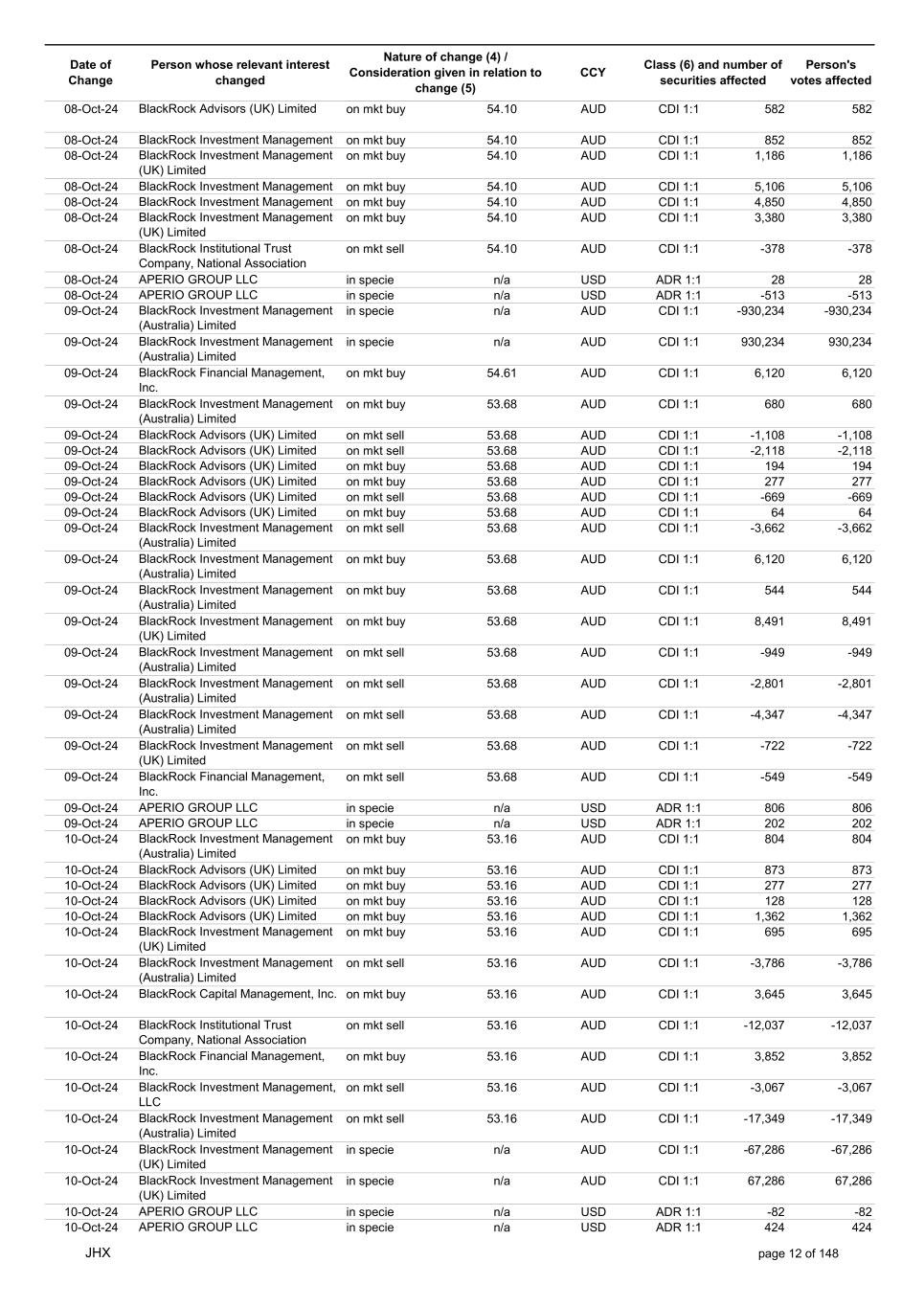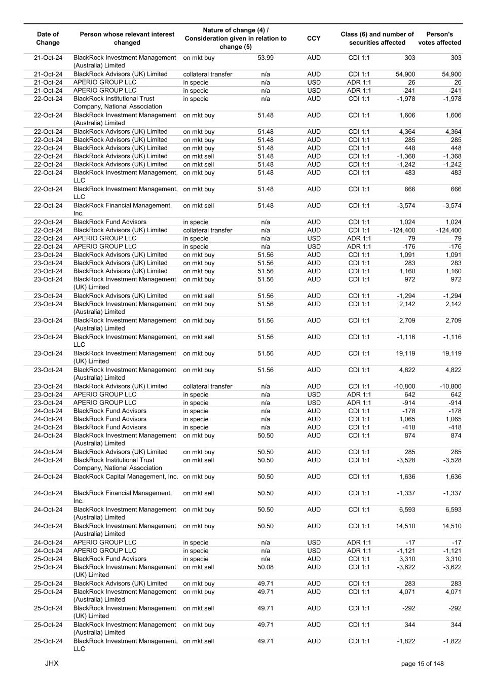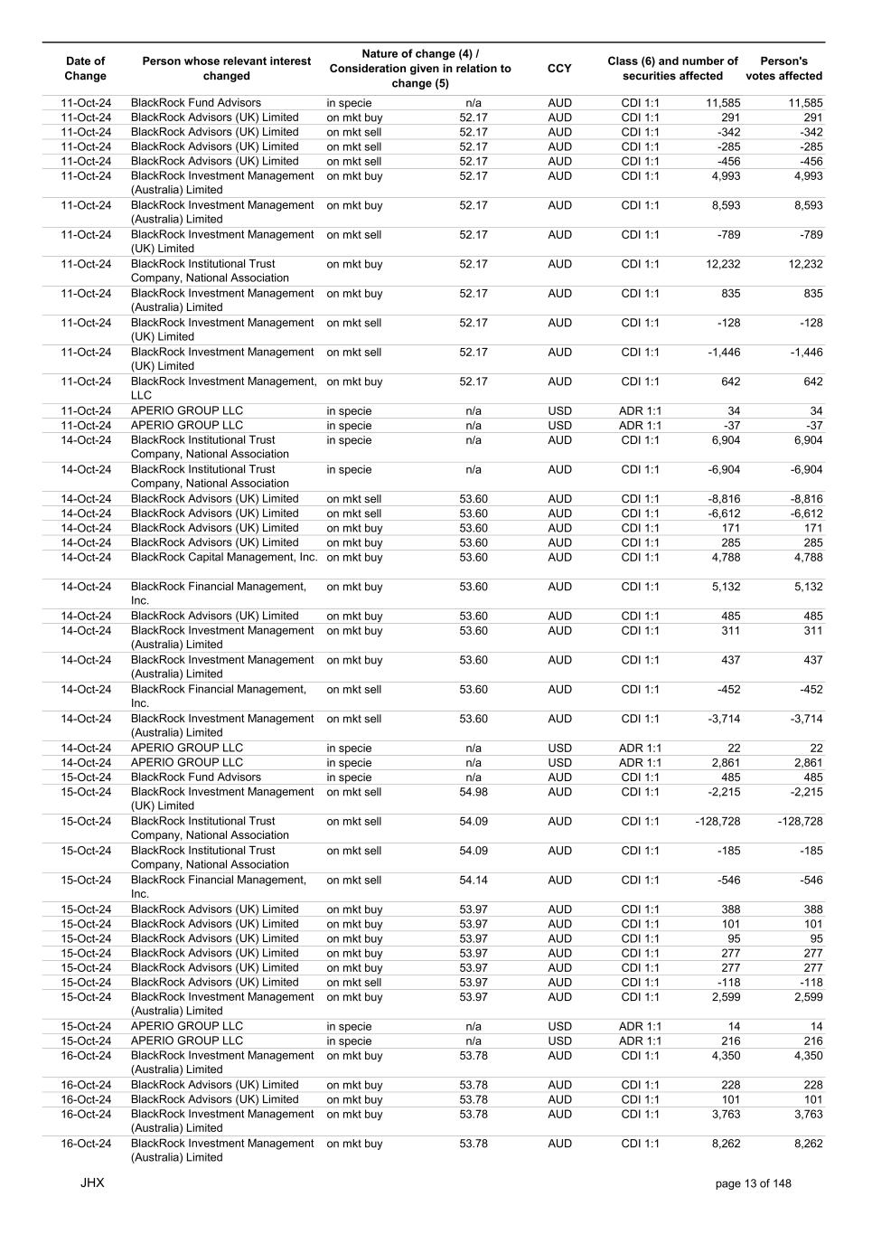 Date of Change Person whose relevant interest changed Nature of change (4) / Consideration given in relation to change (5) Class (6) and number of securities affected Person's votes affected CCY 30-Sep-24 BlackRock Advisors (UK) Limited on mkt sell 57.43 AUD CDI 1:1 -38,899 -38,899 30-Sep-24 BlackRock Fund Advisors on mkt sell 57.43 AUD CDI 1:1 -115,654 -115,654 30-Sep-24 BlackRock Investment Management (UK) Limited on mkt sell 57.43 AUD CDI 1:1 -16,164 -16,164 30-Sep-24 BlackRock Investment Management (Australia) Limited on mkt buy 57.43 AUD CDI 1:1 4,370 4,370 30-Sep-24 BlackRock Advisors (UK) Limited on mkt sell 57.43 AUD CDI 1:1 -3,228 -3,228 30-Sep-24 BlackRock Advisors (UK) Limited on mkt buy 57.43 AUD CDI 1:1 192 192 30-Sep-24 BlackRock Advisors (UK) Limited on mkt sell 57.43 AUD CDI 1:1 -441 -441 30-Sep-24 BlackRock Investment Management (UK) Limited on mkt buy 57.43 AUD CDI 1:1 658 658 30-Sep-24 BlackRock Investment Management (UK) Limited on mkt buy 57.43 AUD CDI 1:1 214 214 30-Sep-24 BlackRock Investment Management (Australia) Limited on mkt sell 57.43 AUD CDI 1:1 -295 -295 30-Sep-24 BlackRock Financial Management, Inc. on mkt sell 57.43 AUD CDI 1:1 -1,416 -1,416 30-Sep-24 BlackRock Fund Advisors on mkt buy 57.43 AUD CDI 1:1 2,157 2,157 30-Sep-24 BlackRock Fund Advisors on mkt buy 57.43 AUD CDI 1:1 1,658 1,658 30-Sep-24 BlackRock Institutional Trust Company, National Association on mkt buy 57.43 AUD CDI 1:1 4,731 4,731 30-Sep-24 BlackRock Institutional Trust Company, National Association on mkt sell 57.43 AUD CDI 1:1 -540 -540 30-Sep-24 BlackRock Fund Advisors on mkt sell 57.43 AUD CDI 1:1 -5,419 -5,419 30-Sep-24 BlackRock Institutional Trust Company, National Association on mkt buy 57.43 AUD CDI 1:1 1,228 1,228 30-Sep-24 APERIO GROUP LLC in specie n/a USD ADR 1:1 42 42 30-Sep-24 APERIO GROUP LLC in specie n/a USD ADR 1:1 3,449 3,449 01-Oct-24 BlackRock Fund Advisors in specie n/a AUD CDI 1:1 35 35 01-Oct-24 BlackRock Advisors (UK) Limited on mkt buy 56.42 AUD CDI 1:1 2,186 2,186 01-Oct-24 BlackRock Advisors (UK) Limited on mkt buy 56.42 AUD CDI 1:1 228 228 01-Oct-24 BlackRock Investment Management (Australia) Limited on mkt buy 56.42 AUD CDI 1:1 725 725 01-Oct-24 BlackRock Investment Management (Australia) Limited on mkt buy 56.42 AUD CDI 1:1 882 882 01-Oct-24 BlackRock Investment Management (Australia) Limited on mkt buy 56.42 AUD CDI 1:1 1,239 1,239 01-Oct-24 BlackRock Institutional Trust Company, National Association on mkt buy 56.42 AUD CDI 1:1 3,397 3,397 01-Oct-24 BlackRock Fund Advisors on mkt buy 56.42 AUD CDI 1:1 1,834 1,834 01-Oct-24 BlackRock Institutional Trust Company, National Association on mkt sell 56.42 AUD CDI 1:1 -4,722 -4,722 01-Oct-24 BlackRock Institutional Trust Company, National Association on mkt sell 56.42 AUD CDI 1:1 -1,280 -1,280 01-Oct-24 APERIO GROUP LLC in specie n/a USD ADR 1:1 123 123 02-Oct-24 BlackRock Fund Advisors in specie n/a AUD CDI 1:1 1,290 1,290 02-Oct-24 BlackRock Investment Management (UK) Limited on mkt sell 55.91 AUD CDI 1:1 -1,888 -1,888 02-Oct-24 BlackRock Advisors (UK) Limited on mkt buy 55.42 AUD CDI 1:1 1,096 1,096 02-Oct-24 BlackRock Advisors (UK) Limited on mkt buy 55.42 AUD CDI 1:1 1,096 1,096 02-Oct-24 BlackRock Advisors (UK) Limited on mkt buy 55.42 AUD CDI 1:1 1,096 1,096 02-Oct-24 BlackRock Advisors (UK) Limited on mkt buy 55.42 AUD CDI 1:1 2,192 2,192 JHX page 9 of 148