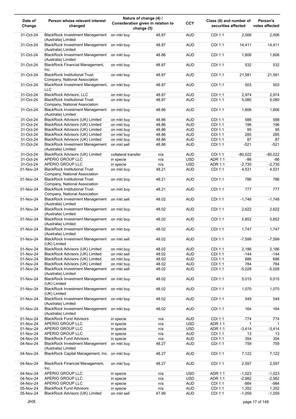 Date of Change Person whose relevant interest changed Nature of change (4) / Consideration given in relation to change (5) Class (6) and number of securities affected Person's votes affected CCY 02-Oct-24 BlackRock Advisors (UK) Limited on mkt buy 55.42 AUD CDI 1:1 294 294 02-Oct-24 BlackRock Advisors (UK) Limited on mkt buy 55.42 AUD CDI 1:1 1,176 1,176 02-Oct-24 BlackRock Advisors (UK) Limited on mkt buy 55.42 AUD CDI 1:1 281 281 02-Oct-24 BlackRock Advisors (UK) Limited on mkt sell 55.42 AUD CDI 1:1 -454 -454 02-Oct-24 BlackRock Investment Management (Australia) Limited on mkt sell 55.42 AUD CDI 1:1 -3,252 -3,252 02-Oct-24 BlackRock Institutional Trust Company, National Association on mkt sell 55.42 AUD CDI 1:1 -18,546 -18,546 02-Oct-24 BlackRock Investment Management (Australia) Limited on mkt sell 55.42 AUD CDI 1:1 -1,097 -1,097 02-Oct-24 BlackRock Investment Management (Australia) Limited on mkt buy 55.42 AUD CDI 1:1 3,854 3,854 02-Oct-24 BlackRock Investment Management (Australia) Limited on mkt buy 55.42 AUD CDI 1:1 849 849 02-Oct-24 BlackRock Investment Management (Australia) Limited on mkt buy 55.42 AUD CDI 1:1 1,567 1,567 02-Oct-24 BlackRock Financial Management, Inc. on mkt sell 55.42 AUD CDI 1:1 -1,307 -1,307 02-Oct-24 BlackRock Advisors (UK) Limited on mkt buy 55.42 AUD CDI 1:1 6,012 6,012 02-Oct-24 BlackRock Investment Management, LLC on mkt buy 55.42 AUD CDI 1:1 437 437 02-Oct-24 BlackRock Fund Advisors on mkt sell 55.42 AUD CDI 1:1 -4,877 -4,877 02-Oct-24 BlackRock Investment Management (Australia) Limited on mkt buy 55.42 AUD CDI 1:1 340 340 02-Oct-24 BlackRock Investment Management (Australia) Limited on mkt buy 55.42 AUD CDI 1:1 477 477 02-Oct-24 BlackRock Financial Management, Inc. on mkt sell 55.42 AUD CDI 1:1 -711 -711 02-Oct-24 APERIO GROUP LLC in specie n/a USD ADR 1:1 132 132 02-Oct-24 APERIO GROUP LLC in specie n/a USD ADR 1:1 862 862 03-Oct-24 BlackRock Investment Management (Australia) Limited on mkt buy 55.33 AUD CDI 1:1 4,807 4,807 03-Oct-24 BlackRock Advisors (UK) Limited on mkt buy 55.33 AUD CDI 1:1 2,196 2,196 03-Oct-24 BlackRock Advisors (UK) Limited on mkt buy 55.33 AUD CDI 1:1 54 54 03-Oct-24 BlackRock Advisors (UK) Limited on mkt buy 55.33 AUD CDI 1:1 128 128 03-Oct-24 BlackRock Advisors (UK) Limited on mkt buy 55.33 AUD CDI 1:1 231 231 03-Oct-24 BlackRock Capital Management, Inc. on mkt sell 55.33 AUD CDI 1:1 -1,426 -1,426 03-Oct-24 BlackRock Financial Management, Inc. on mkt sell 55.33 AUD CDI 1:1 -10,822 -10,822 03-Oct-24 BlackRock Investment Management (Australia) Limited on mkt sell 55.33 AUD CDI 1:1 -2,695 -2,695 03-Oct-24 APERIO GROUP LLC in specie n/a USD ADR 1:1 642 642 04-Oct-24 BlackRock Investment Management (UK) Limited on mkt sell 54.75 AUD CDI 1:1 -6,228 -6,228 04-Oct-24 BlackRock Investment Management (Australia) Limited on mkt buy 55.33 AUD CDI 1:1 3,933 3,933 04-Oct-24 BlackRock Advisors (UK) Limited on mkt buy 55.33 AUD CDI 1:1 270 270 04-Oct-24 BlackRock Advisors (UK) Limited on mkt sell 55.33 AUD CDI 1:1 -13,858 -13,858 04-Oct-24 BlackRock Advisors (UK) Limited on mkt buy 55.33 AUD CDI 1:1 171 171 04-Oct-24 BlackRock Advisors (UK) Limited on mkt buy 55.33 AUD CDI 1:1 686 686 04-Oct-24 BlackRock Advisors (UK) Limited on mkt buy 55.33 AUD CDI 1:1 3,370 3,370 04-Oct-24 BlackRock Investment Management (Australia) Limited on mkt buy 55.33 AUD CDI 1:1 5,987 5,987 JHX page 10 of 148
