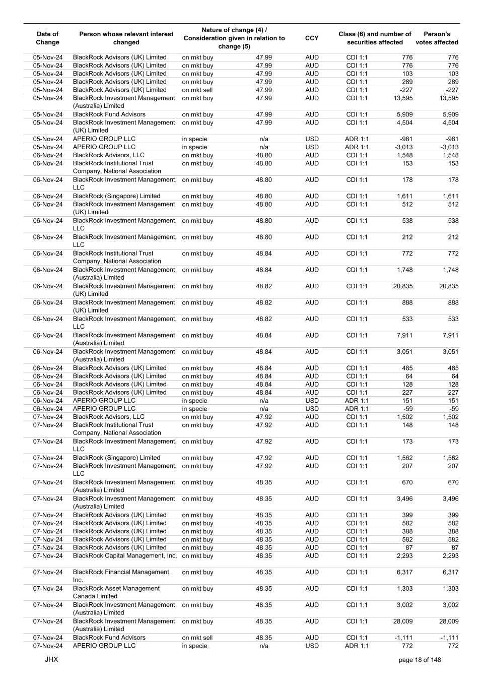 Date of Change Person whose relevant interest changed Nature of change (4) / Consideration given in relation to change (5) Class (6) and number of securities affected Person's votes affected CCY 07-Nov-24 APERIO GROUP LLC in specie n/a USD ADR 1:1 -2,757 -2,757 07-Nov-24 APERIO GROUP LLC in specie n/a AUD CDI 1:1 19 19 08-Nov-24 BlackRock Advisors, LLC on mkt buy 48.69 AUD CDI 1:1 1,483 1,483 08-Nov-24 BlackRock Institutional Trust Company, National Association on mkt buy 48.69 AUD CDI 1:1 145 145 08-Nov-24 BlackRock Advisors, LLC on mkt buy 48.69 AUD CDI 1:1 50 50 08-Nov-24 BlackRock Investment Management, LLC on mkt buy 48.69 AUD CDI 1:1 169 169 08-Nov-24 BlackRock (Singapore) Limited on mkt buy 48.69 AUD CDI 1:1 1,542 1,542 08-Nov-24 BlackRock Investment Management, LLC on mkt buy 48.69 AUD CDI 1:1 203 203 08-Nov-24 BlackRock Fund Advisors in specie n/a AUD CDI 1:1 2,136 2,136 08-Nov-24 BlackRock Fund Advisors in specie n/a AUD CDI 1:1 1,296 1,296 08-Nov-24 BlackRock Institutional Trust Company, National Association on mkt buy 48.58 AUD CDI 1:1 4,524 4,524 08-Nov-24 BlackRock Institutional Trust Company, National Association on mkt buy 48.58 AUD CDI 1:1 746 746 08-Nov-24 BlackRock Institutional Trust Company, National Association on mkt buy 48.58 AUD CDI 1:1 738 738 08-Nov-24 BlackRock Investment Management (Australia) Limited on mkt buy 48.47 AUD CDI 1:1 803 803 08-Nov-24 BlackRock Investment Management (Australia) Limited on mkt buy 48.47 AUD CDI 1:1 5,593 5,593 08-Nov-24 BlackRock Investment Management (UK) Limited on mkt sell 48.47 AUD CDI 1:1 -6,628 -6,628 08-Nov-24 BlackRock Advisors (UK) Limited on mkt buy 48.47 AUD CDI 1:1 388 388 08-Nov-24 BlackRock Advisors (UK) Limited on mkt buy 48.47 AUD CDI 1:1 485 485 08-Nov-24 BlackRock Advisors (UK) Limited on mkt buy 48.47 AUD CDI 1:1 25 25 08-Nov-24 BlackRock Advisors (UK) Limited on mkt sell 48.47 AUD CDI 1:1 -345 -345 08-Nov-24 BlackRock Investment Management (UK) Limited on mkt buy 48.47 AUD CDI 1:1 8,542 8,542 08-Nov-24 BlackRock Institutional Trust Company, National Association on mkt sell 48.47 AUD CDI 1:1 -13,028 -13,028 08-Nov-24 BlackRock Investment Management (UK) Limited on mkt sell 48.47 AUD CDI 1:1 -698 -698 08-Nov-24 BlackRock Fund Advisors in specie n/a AUD CDI 1:1 23,496 23,496 08-Nov-24 APERIO GROUP LLC in specie n/a USD ADR 1:1 -240 -240 08-Nov-24 APERIO GROUP LLC in specie n/a USD ADR 1:1 1,235 1,235 10-Nov-24 BlackRock Advisors (UK) Limited collateral transfer n/a AUD CDI 1:1 -88,878 -88,878 11-Nov-24 BlackRock Fund Advisors in specie n/a AUD CDI 1:1 1,062 1,062 11-Nov-24 BlackRock Fund Advisors in specie n/a AUD CDI 1:1 19,161 19,161 11-Nov-24 BlackRock Fund Advisors in specie n/a AUD CDI 1:1 2,129 2,129 11-Nov-24 BlackRock Fund Advisors in specie n/a AUD CDI 1:1 1,062 1,062 11-Nov-24 BlackRock Fund Advisors in specie n/a AUD CDI 1:1 253 253 11-Nov-24 BlackRock Advisors (UK) Limited on mkt buy 50.00 AUD CDI 1:1 291 291 11-Nov-24 BlackRock Advisors (UK) Limited on mkt buy 50.00 AUD CDI 1:1 194 194 11-Nov-24 BlackRock Advisors (UK) Limited on mkt buy 50.00 AUD CDI 1:1 776 776 11-Nov-24 BlackRock Advisors (UK) Limited on mkt buy 50.00 AUD CDI 1:1 256 256 11-Nov-24 BlackRock Advisors (UK) Limited on mkt buy 50.00 AUD CDI 1:1 227 227 11-Nov-24 BlackRock Advisors (UK) Limited on mkt buy 50.00 AUD CDI 1:1 908 908 11-Nov-24 BlackRock Advisors (UK) Limited on mkt buy 50.00 AUD CDI 1:1 27 27 11-Nov-24 BlackRock Capital Management, Inc. on mkt buy 50.00 AUD CDI 1:1 3,887 3,887 11-Nov-24 BlackRock Financial Management, Inc. on mkt buy 50.00 AUD CDI 1:1 4,791 4,791 11-Nov-24 BlackRock Advisors (UK) Limited collateral transfer n/a AUD CDI 1:1 211,478 211,478 11-Nov-24 APERIO GROUP LLC in specie n/a USD ADR 1:1 -158 -158 11-Nov-24 APERIO GROUP LLC in specie n/a USD ADR 1:1 -2,481 -2,481 12-Nov-24 BlackRock Advisors, LLC on mkt buy 50.07 AUD CDI 1:1 2,457 2,457 12-Nov-24 BlackRock Institutional Trust Company, National Association on mkt buy 50.07 AUD CDI 1:1 289 289 12-Nov-24 BlackRock Advisors, LLC on mkt buy 50.07 AUD CDI 1:1 37 37 12-Nov-24 BlackRock Advisors, LLC on mkt buy 50.07 AUD CDI 1:1 603 603 12-Nov-24 BlackRock Investment Management, LLC on mkt buy 50.07 AUD CDI 1:1 398 398 12-Nov-24 BlackRock (Singapore) Limited on mkt buy 50.07 AUD CDI 1:1 2,226 2,226 12-Nov-24 BlackRock Investment Management (UK) Limited on mkt buy 50.07 AUD CDI 1:1 177 177 12-Nov-24 BlackRock Investment Management, LLC on mkt buy 50.07 AUD CDI 1:1 185 185 12-Nov-24 BlackRock Investment Management, LLC on mkt buy 50.07 AUD CDI 1:1 300 300 12-Nov-24 BlackRock Fund Advisors in specie n/a AUD CDI 1:1 2,129 2,129 JHX page 19 of 148