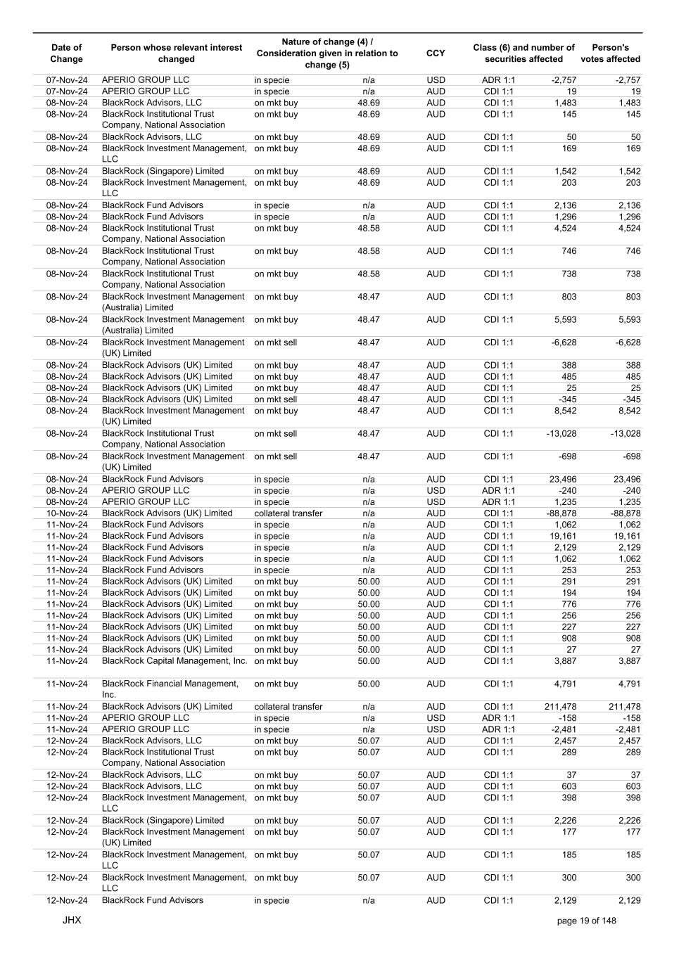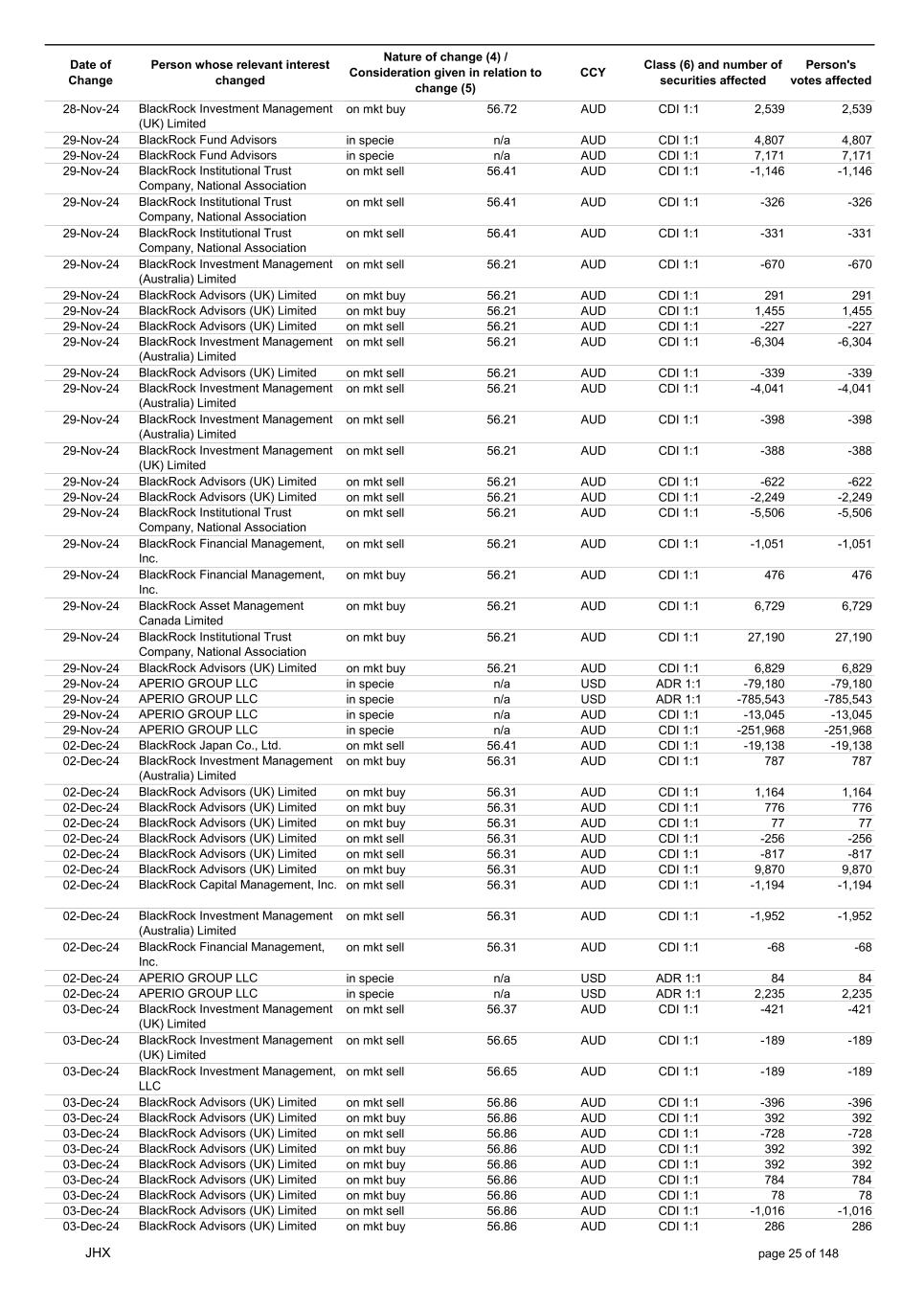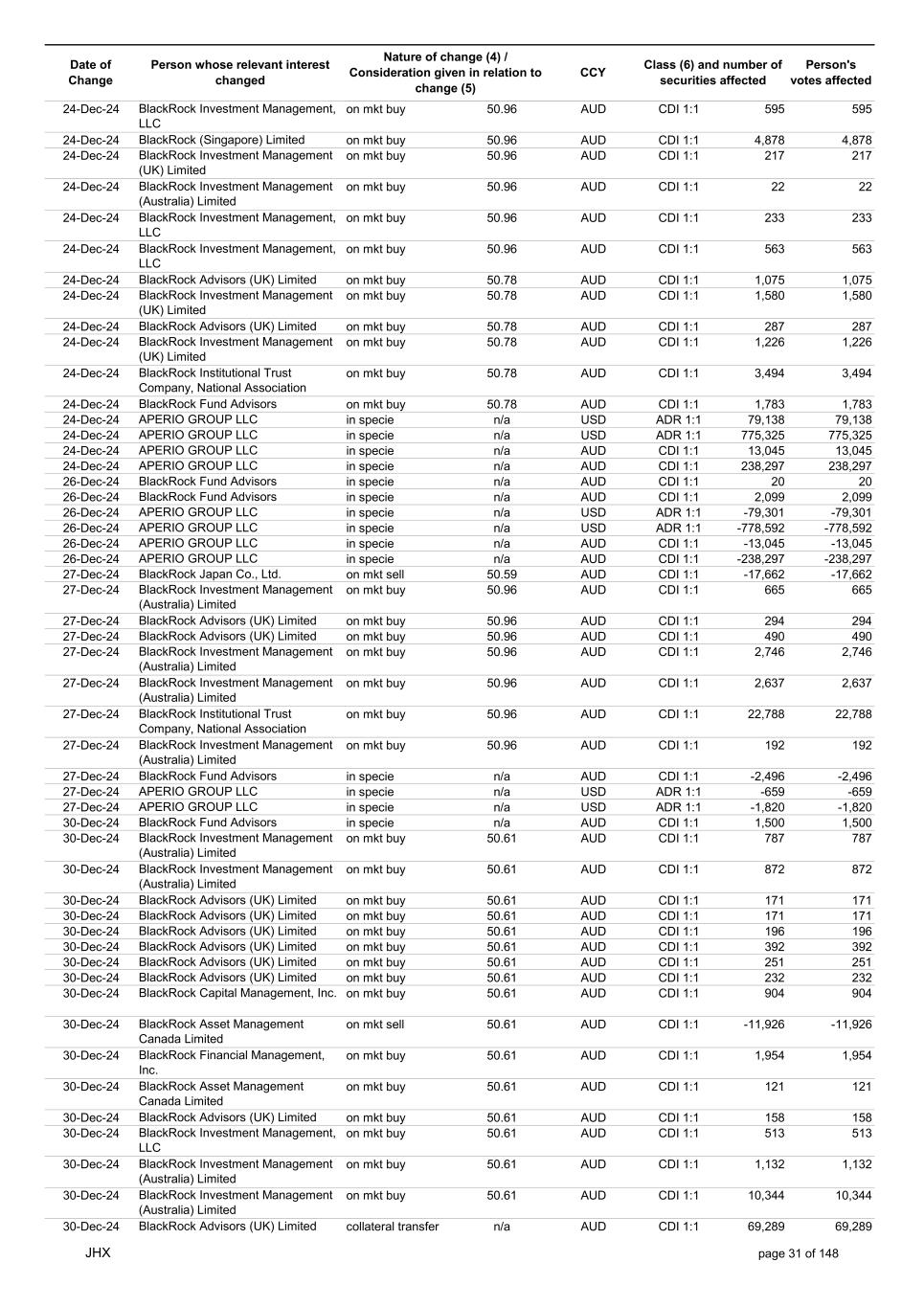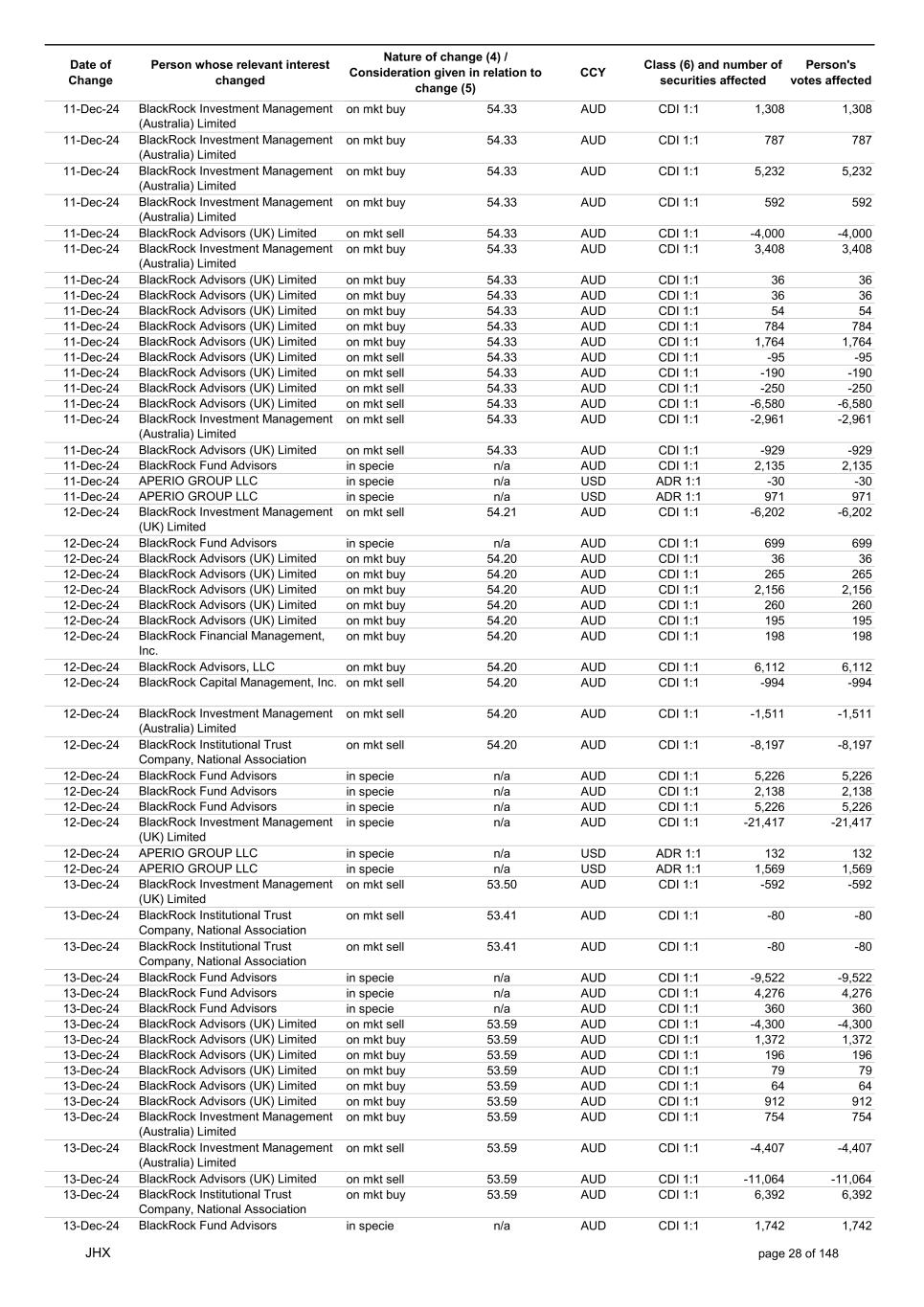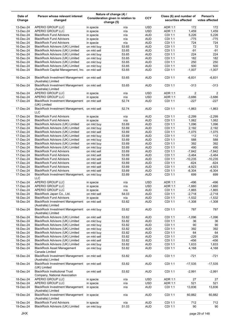 Date of Change Person whose relevant interest changed Nature of change (4) / Consideration given in relation to change (5) Class (6) and number of securities affected Person's votes affected CCY 28-Nov-24 BlackRock Investment Management (UK) Limited on mkt buy 56.72 AUD CDI 1:1 2,539 2,539 29-Nov-24 BlackRock Fund Advisors in specie n/a AUD CDI 1:1 4,807 4,807 29-Nov-24 BlackRock Fund Advisors in specie n/a AUD CDI 1:1 7,171 7,171 29-Nov-24 BlackRock Institutional Trust Company, National Association on mkt sell 56.41 AUD CDI 1:1 -1,146 -1,146 29-Nov-24 BlackRock Institutional Trust Company, National Association on mkt sell 56.41 AUD CDI 1:1 -326 -326 29-Nov-24 BlackRock Institutional Trust Company, National Association on mkt sell 56.41 AUD CDI 1:1 -331 -331 29-Nov-24 BlackRock Investment Management (Australia) Limited on mkt sell 56.21 AUD CDI 1:1 -670 -670 29-Nov-24 BlackRock Advisors (UK) Limited on mkt buy 56.21 AUD CDI 1:1 291 291 29-Nov-24 BlackRock Advisors (UK) Limited on mkt buy 56.21 AUD CDI 1:1 1,455 1,455 29-Nov-24 BlackRock Advisors (UK) Limited on mkt sell 56.21 AUD CDI 1:1 -227 -227 29-Nov-24 BlackRock Investment Management (Australia) Limited on mkt sell 56.21 AUD CDI 1:1 -6,304 -6,304 29-Nov-24 BlackRock Advisors (UK) Limited on mkt sell 56.21 AUD CDI 1:1 -339 -339 29-Nov-24 BlackRock Investment Management (Australia) Limited on mkt sell 56.21 AUD CDI 1:1 -4,041 -4,041 29-Nov-24 BlackRock Investment Management (Australia) Limited on mkt sell 56.21 AUD CDI 1:1 -398 -398 29-Nov-24 BlackRock Investment Management (UK) Limited on mkt sell 56.21 AUD CDI 1:1 -388 -388 29-Nov-24 BlackRock Advisors (UK) Limited on mkt sell 56.21 AUD CDI 1:1 -622 -622 29-Nov-24 BlackRock Advisors (UK) Limited on mkt sell 56.21 AUD CDI 1:1 -2,249 -2,249 29-Nov-24 BlackRock Institutional Trust Company, National Association on mkt sell 56.21 AUD CDI 1:1 -5,506 -5,506 29-Nov-24 BlackRock Financial Management, Inc. on mkt sell 56.21 AUD CDI 1:1 -1,051 -1,051 29-Nov-24 BlackRock Financial Management, Inc. on mkt buy 56.21 AUD CDI 1:1 476 476 29-Nov-24 BlackRock Asset Management Canada Limited on mkt buy 56.21 AUD CDI 1:1 6,729 6,729 29-Nov-24 BlackRock Institutional Trust Company, National Association on mkt buy 56.21 AUD CDI 1:1 27,190 27,190 29-Nov-24 BlackRock Advisors (UK) Limited on mkt buy 56.21 AUD CDI 1:1 6,829 6,829 29-Nov-24 APERIO GROUP LLC in specie n/a USD ADR 1:1 -79,180 -79,180 29-Nov-24 APERIO GROUP LLC in specie n/a USD ADR 1:1 -785,543 -785,543 29-Nov-24 APERIO GROUP LLC in specie n/a AUD CDI 1:1 -13,045 -13,045 29-Nov-24 APERIO GROUP LLC in specie n/a AUD CDI 1:1 -251,968 -251,968 02-Dec-24 BlackRock Japan Co., Ltd. on mkt sell 56.41 AUD CDI 1:1 -19,138 -19,138 02-Dec-24 BlackRock Investment Management (Australia) Limited on mkt buy 56.31 AUD CDI 1:1 787 787 02-Dec-24 BlackRock Advisors (UK) Limited on mkt buy 56.31 AUD CDI 1:1 1,164 1,164 02-Dec-24 BlackRock Advisors (UK) Limited on mkt buy 56.31 AUD CDI 1:1 776 776 02-Dec-24 BlackRock Advisors (UK) Limited on mkt buy 56.31 AUD CDI 1:1 77 77 02-Dec-24 BlackRock Advisors (UK) Limited on mkt sell 56.31 AUD CDI 1:1 -256 -256 02-Dec-24 BlackRock Advisors (UK) Limited on mkt sell 56.31 AUD CDI 1:1 -817 -817 02-Dec-24 BlackRock Advisors (UK) Limited on mkt buy 56.31 AUD CDI 1:1 9,870 9,870 02-Dec-24 BlackRock Capital Management, Inc. on mkt sell 56.31 AUD CDI 1:1 -1,194 -1,194 02-Dec-24 BlackRock Investment Management (Australia) Limited on mkt sell 56.31 AUD CDI 1:1 -1,952 -1,952 02-Dec-24 BlackRock Financial Management, Inc. on mkt sell 56.31 AUD CDI 1:1 -68 -68 02-Dec-24 APERIO GROUP LLC in specie n/a USD ADR 1:1 84 84 02-Dec-24 APERIO GROUP LLC in specie n/a USD ADR 1:1 2,235 2,235 03-Dec-24 BlackRock Investment Management (UK) Limited on mkt sell 56.37 AUD CDI 1:1 -421 -421 03-Dec-24 BlackRock Investment Management (UK) Limited on mkt sell 56.65 AUD CDI 1:1 -189 -189 03-Dec-24 BlackRock Investment Management, LLC on mkt sell 56.65 AUD CDI 1:1 -189 -189 03-Dec-24 BlackRock Advisors (UK) Limited on mkt sell 56.86 AUD CDI 1:1 -396 -396 03-Dec-24 BlackRock Advisors (UK) Limited on mkt buy 56.86 AUD CDI 1:1 392 392 03-Dec-24 BlackRock Advisors (UK) Limited on mkt sell 56.86 AUD CDI 1:1 -728 -728 03-Dec-24 BlackRock Advisors (UK) Limited on mkt buy 56.86 AUD CDI 1:1 392 392 03-Dec-24 BlackRock Advisors (UK) Limited on mkt buy 56.86 AUD CDI 1:1 392 392 03-Dec-24 BlackRock Advisors (UK) Limited on mkt buy 56.86 AUD CDI 1:1 784 784 03-Dec-24 BlackRock Advisors (UK) Limited on mkt buy 56.86 AUD CDI 1:1 78 78 03-Dec-24 BlackRock Advisors (UK) Limited on mkt sell 56.86 AUD CDI 1:1 -1,016 -1,016 03-Dec-24 BlackRock Advisors (UK) Limited on mkt buy 56.86 AUD CDI 1:1 286 286 JHX page 25 of 148