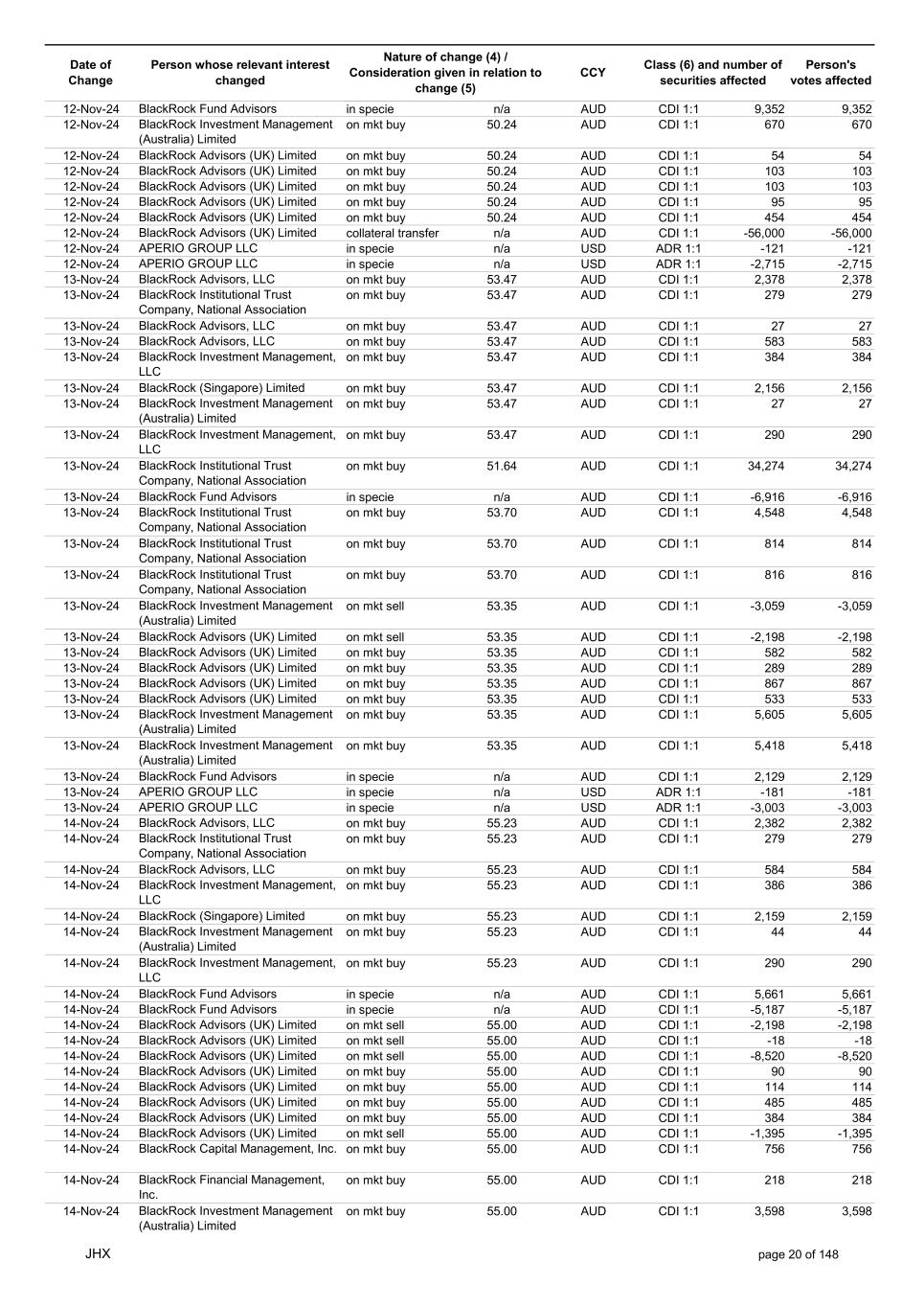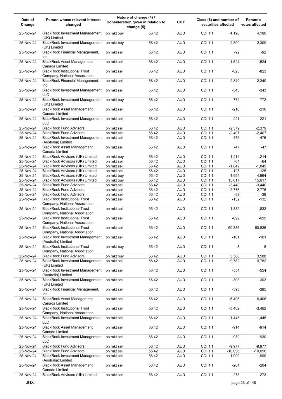 Date of Change Person whose relevant interest changed Nature of change (4) / Consideration given in relation to change (5) Class (6) and number of securities affected Person's votes affected CCY 14-Nov-24 BlackRock Advisors (UK) Limited collateral transfer n/a AUD CDI 1:1 -155,478 -155,478 14-Nov-24 APERIO GROUP LLC in specie n/a USD ADR 1:1 -70 -70 14-Nov-24 APERIO GROUP LLC in specie n/a USD ADR 1:1 3,504 3,504 15-Nov-24 BlackRock Investment Management (Australia) Limited in specie n/a AUD CDI 1:1 28,199 28,199 15-Nov-24 BlackRock Fund Advisors in specie n/a AUD CDI 1:1 750 750 15-Nov-24 BlackRock Fund Advisors in specie n/a AUD CDI 1:1 6,541 6,541 15-Nov-24 BlackRock Fund Advisors in specie n/a AUD CDI 1:1 20 20 15-Nov-24 BlackRock Advisors (UK) Limited on mkt sell 56.51 AUD CDI 1:1 -1,458 -1,458 15-Nov-24 BlackRock Advisors (UK) Limited on mkt buy 56.51 AUD CDI 1:1 86 86 15-Nov-24 BlackRock Investment Management (UK) Limited on mkt buy 56.51 AUD CDI 1:1 1,394 1,394 15-Nov-24 BlackRock Investment Management (UK) Limited on mkt buy 56.51 AUD CDI 1:1 9,379 9,379 15-Nov-24 BlackRock Investment Management (UK) Limited on mkt buy 56.51 AUD CDI 1:1 876 876 15-Nov-24 BlackRock Investment Management (Australia) Limited on mkt sell 56.51 AUD CDI 1:1 -468 -468 15-Nov-24 BlackRock Investment Management (UK) Limited on mkt sell 56.51 AUD CDI 1:1 -268 -268 15-Nov-24 BlackRock Investment Management (Australia) Limited on mkt sell 56.51 AUD CDI 1:1 -1,359 -1,359 15-Nov-24 BlackRock Investment Management (UK) Limited on mkt sell 56.51 AUD CDI 1:1 -6,994 -6,994 15-Nov-24 BlackRock Investment Management (UK) Limited on mkt sell 56.51 AUD CDI 1:1 -440 -440 15-Nov-24 BlackRock Financial Management, Inc. on mkt sell 56.51 AUD CDI 1:1 -1,077 -1,077 15-Nov-24 BlackRock (Singapore) Limited in specie n/a AUD CDI 1:1 310 310 15-Nov-24 APERIO GROUP LLC in specie n/a USD ADR 1:1 13 13 15-Nov-24 APERIO GROUP LLC in specie n/a USD ADR 1:1 378 378 18-Nov-24 BlackRock Advisors (UK) Limited on mkt sell 55.15 AUD CDI 1:1 -1,062 -1,062 18-Nov-24 BlackRock Advisors (UK) Limited on mkt buy 55.15 AUD CDI 1:1 196 196 18-Nov-24 BlackRock Advisors (UK) Limited on mkt buy 55.15 AUD CDI 1:1 784 784 18-Nov-24 BlackRock Advisors (UK) Limited on mkt buy 55.15 AUD CDI 1:1 1,078 1,078 18-Nov-24 BlackRock Advisors (UK) Limited on mkt buy 55.15 AUD CDI 1:1 480 480 18-Nov-24 BlackRock Advisors (UK) Limited on mkt buy 55.15 AUD CDI 1:1 1,273 1,273 18-Nov-24 BlackRock Capital Management, Inc. on mkt sell 55.15 AUD CDI 1:1 -127 -127 18-Nov-24 BlackRock Financial Management, Inc. on mkt buy 55.15 AUD CDI 1:1 79 79 18-Nov-24 BlackRock Asset Management Canada Limited on mkt buy 55.15 AUD CDI 1:1 106 106 18-Nov-24 BlackRock Investment Management, LLC on mkt buy 55.15 AUD CDI 1:1 728 728 18-Nov-24 BlackRock Investment Management (Australia) Limited on mkt sell 55.15 AUD CDI 1:1 -766 -766 18-Nov-24 BlackRock Fund Advisors in specie n/a AUD CDI 1:1 502 502 18-Nov-24 APERIO GROUP LLC in specie n/a USD ADR 1:1 -90 -90 18-Nov-24 APERIO GROUP LLC in specie n/a USD ADR 1:1 1,618 1,618 18-Nov-24 APERIO GROUP LLC in specie n/a AUD CDI 1:1 -1,666 -1,666 19-Nov-24 BlackRock Investment Management (UK) Limited on mkt sell 55.88 AUD CDI 1:1 -312 -312 19-Nov-24 BlackRock Investment Management, LLC on mkt sell 55.88 AUD CDI 1:1 -306 -306 19-Nov-24 BlackRock Japan Co., Ltd. on mkt sell 56.30 AUD CDI 1:1 -184 -184 19-Nov-24 BlackRock Advisors (UK) Limited on mkt sell 55.91 AUD CDI 1:1 -18 -18 19-Nov-24 BlackRock Advisors (UK) Limited on mkt buy 55.91 AUD CDI 1:1 168 168 19-Nov-24 BlackRock Advisors (UK) Limited on mkt buy 55.91 AUD CDI 1:1 291 291 19-Nov-24 BlackRock Advisors (UK) Limited on mkt buy 55.91 AUD CDI 1:1 582 582 19-Nov-24 BlackRock Advisors (UK) Limited on mkt buy 55.91 AUD CDI 1:1 128 128 19-Nov-24 BlackRock Advisors (UK) Limited on mkt buy 55.91 AUD CDI 1:1 128 128 19-Nov-24 BlackRock Advisors (UK) Limited on mkt buy 55.91 AUD CDI 1:1 128 128 19-Nov-24 APERIO GROUP LLC in specie n/a USD ADR 1:1 88 88 19-Nov-24 APERIO GROUP LLC in specie n/a USD ADR 1:1 5,993 5,993 20-Nov-24 BlackRock Institutional Trust Company, National Association on mkt buy 54.78 AUD CDI 1:1 430 430 20-Nov-24 BlackRock Fund Advisors in specie n/a AUD CDI 1:1 354 354 20-Nov-24 BlackRock Advisors (UK) Limited on mkt sell 54.81 AUD CDI 1:1 -1,068 -1,068 20-Nov-24 BlackRock Advisors (UK) Limited on mkt buy 54.81 AUD CDI 1:1 456 456 20-Nov-24 BlackRock Advisors (UK) Limited on mkt buy 54.81 AUD CDI 1:1 679 679 20-Nov-24 BlackRock Advisors (UK) Limited on mkt buy 54.81 AUD CDI 1:1 194 194 20-Nov-24 BlackRock Advisors (UK) Limited on mkt buy 54.81 AUD CDI 1:1 388 388 JHX page 21 of 148