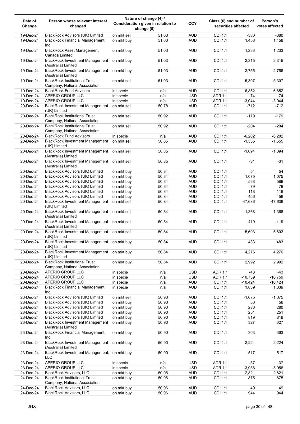 Date of Change Person whose relevant interest changed Nature of change (4) / Consideration given in relation to change (5) Class (6) and number of securities affected Person's votes affected CCY 25-Nov-24 BlackRock Advisors (UK) Limited on mkt sell 56.42 AUD CDI 1:1 -7,775 -7,775 25-Nov-24 BlackRock Advisors (UK) Limited on mkt sell 56.42 AUD CDI 1:1 -527 -527 25-Nov-24 BlackRock Fund Advisors on mkt sell 56.42 AUD CDI 1:1 -14,432 -14,432 25-Nov-24 BlackRock Fund Advisors on mkt sell 56.42 AUD CDI 1:1 -11,647 -11,647 25-Nov-24 BlackRock Fund Advisors on mkt sell 56.42 AUD CDI 1:1 -171 -171 25-Nov-24 BlackRock Institutional Trust Company, National Association on mkt sell 56.42 AUD CDI 1:1 -558 -558 25-Nov-24 BlackRock Institutional Trust Company, National Association on mkt sell 56.42 AUD CDI 1:1 -7,703 -7,703 25-Nov-24 BlackRock Institutional Trust Company, National Association on mkt sell 56.42 AUD CDI 1:1 -2,944 -2,944 25-Nov-24 BlackRock Investment Management (Australia) Limited on mkt sell 56.42 AUD CDI 1:1 -425 -425 25-Nov-24 BlackRock Investment Management (Australia) Limited on mkt buy 56.42 AUD CDI 1:1 4,370 4,370 25-Nov-24 BlackRock Fund Advisors in specie n/a AUD CDI 1:1 976 976 25-Nov-24 APERIO GROUP LLC in specie n/a USD ADR 1:1 29 29 25-Nov-24 APERIO GROUP LLC in specie n/a USD ADR 1:1 1,768 1,768 26-Nov-24 BlackRock Investment Management (UK) Limited on mkt sell 57.82 AUD CDI 1:1 -11 -11 26-Nov-24 BlackRock Investment Management, LLC on mkt sell 57.82 AUD CDI 1:1 -10 -10 26-Nov-24 BlackRock Fund Advisors in specie n/a AUD CDI 1:1 4,270 4,270 26-Nov-24 BlackRock Advisors (UK) Limited on mkt buy 57.60 AUD CDI 1:1 3,279 3,279 26-Nov-24 BlackRock Advisors (UK) Limited on mkt buy 57.60 AUD CDI 1:1 582 582 26-Nov-24 BlackRock Advisors (UK) Limited on mkt buy 57.60 AUD CDI 1:1 1,164 1,164 26-Nov-24 BlackRock Advisors (UK) Limited on mkt buy 57.60 AUD CDI 1:1 485 485 26-Nov-24 BlackRock Advisors (UK) Limited on mkt buy 57.60 AUD CDI 1:1 103 103 26-Nov-24 BlackRock Advisors (UK) Limited on mkt buy 57.60 AUD CDI 1:1 64 64 26-Nov-24 BlackRock Investment Management, LLC on mkt buy 57.60 AUD CDI 1:1 1,152 1,152 26-Nov-24 BlackRock Institutional Trust Company, National Association on mkt sell 57.60 AUD CDI 1:1 -28,235 -28,235 26-Nov-24 BlackRock Fund Advisors in specie n/a AUD CDI 1:1 288 288 26-Nov-24 APERIO GROUP LLC in specie n/a USD ADR 1:1 109 109 26-Nov-24 APERIO GROUP LLC in specie n/a USD ADR 1:1 281 281 27-Nov-24 BlackRock Institutional Trust Company, National Association on mkt sell 56.40 AUD CDI 1:1 -1,092 -1,092 27-Nov-24 BlackRock Institutional Trust Company, National Association on mkt sell 56.40 AUD CDI 1:1 -197 -197 27-Nov-24 BlackRock Institutional Trust Company, National Association on mkt sell 56.40 AUD CDI 1:1 -191 -191 27-Nov-24 BlackRock Advisors (UK) Limited on mkt buy 56.40 AUD CDI 1:1 776 776 27-Nov-24 BlackRock Investment Management (UK) Limited on mkt buy 56.40 AUD CDI 1:1 706 706 27-Nov-24 BlackRock Investment Management (Australia) Limited on mkt sell 56.40 AUD CDI 1:1 -9,553 -9,553 27-Nov-24 BlackRock Investment Management (Australia) Limited on mkt sell 56.40 AUD CDI 1:1 -12,424 -12,424 27-Nov-24 BlackRock Investment Management (Australia) Limited on mkt sell 56.40 AUD CDI 1:1 -1,079 -1,079 27-Nov-24 BlackRock Investment Management (UK) Limited on mkt sell 56.40 AUD CDI 1:1 -10,741 -10,741 27-Nov-24 BlackRock Investment Management, LLC on mkt sell 56.40 AUD CDI 1:1 -1,492 -1,492 27-Nov-24 APERIO GROUP LLC in specie n/a USD ADR 1:1 79,245 79,245 27-Nov-24 APERIO GROUP LLC in specie n/a USD ADR 1:1 787,171 787,171 27-Nov-24 APERIO GROUP LLC in specie n/a AUD CDI 1:1 -17,743 -17,743 27-Nov-24 APERIO GROUP LLC in specie n/a AUD CDI 1:1 251,968 251,968 28-Nov-24 BlackRock Investment Management (Australia) Limited on mkt buy 56.72 AUD CDI 1:1 3,496 3,496 28-Nov-24 BlackRock Investment Management (Australia) Limited on mkt buy 56.72 AUD CDI 1:1 437 437 28-Nov-24 BlackRock Advisors (UK) Limited on mkt sell 56.72 AUD CDI 1:1 -1,240 -1,240 28-Nov-24 BlackRock Capital Management, Inc. on mkt sell 56.72 AUD CDI 1:1 -1,557 -1,557 28-Nov-24 BlackRock Financial Management, Inc. on mkt sell 56.72 AUD CDI 1:1 -1,711 -1,711 28-Nov-24 BlackRock Investment Management (Australia) Limited on mkt sell 56.72 AUD CDI 1:1 -2,231 -2,231 28-Nov-24 BlackRock Investment Management (Australia) Limited on mkt sell 56.72 AUD CDI 1:1 -11,420 -11,420 JHX page 24 of 148