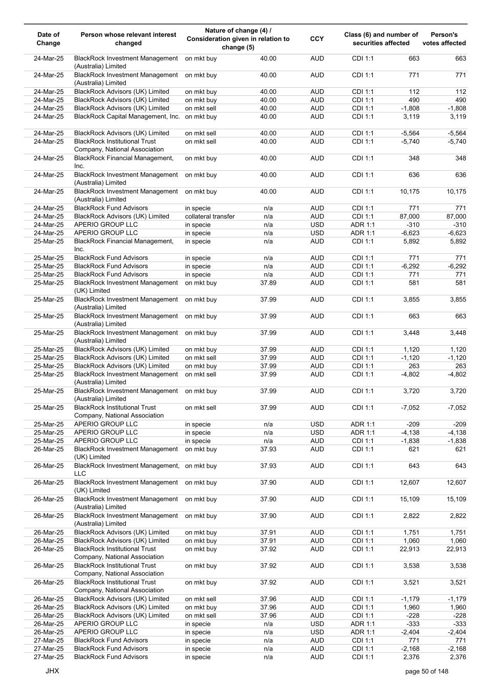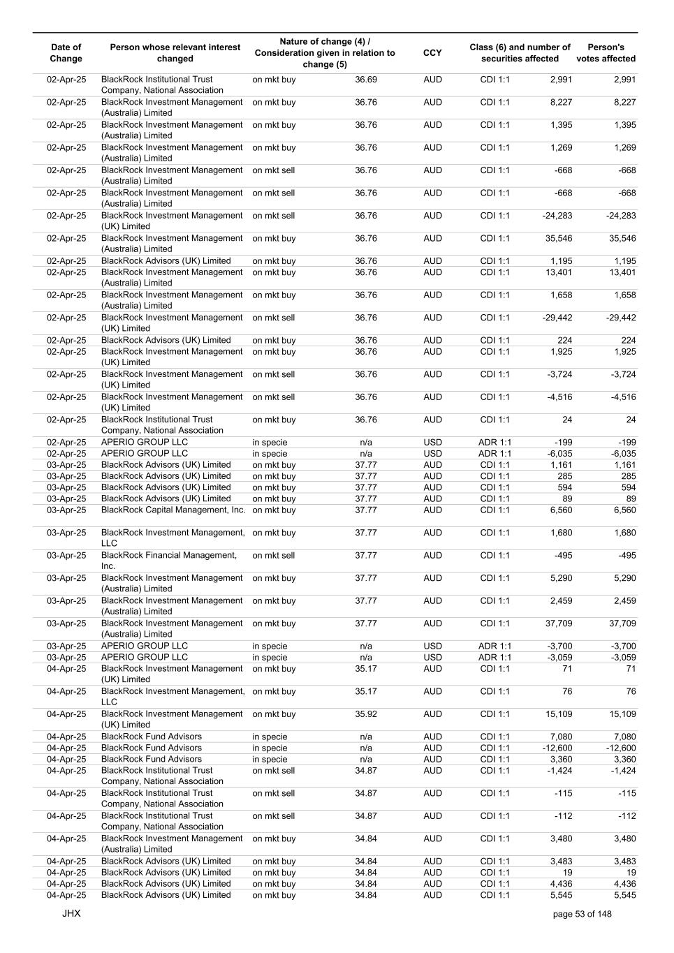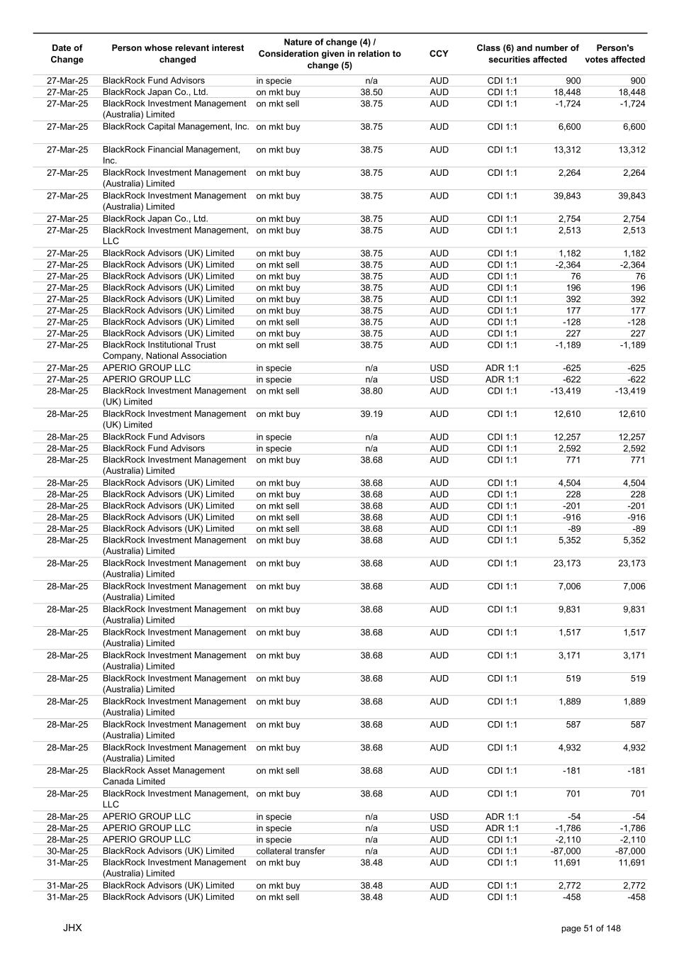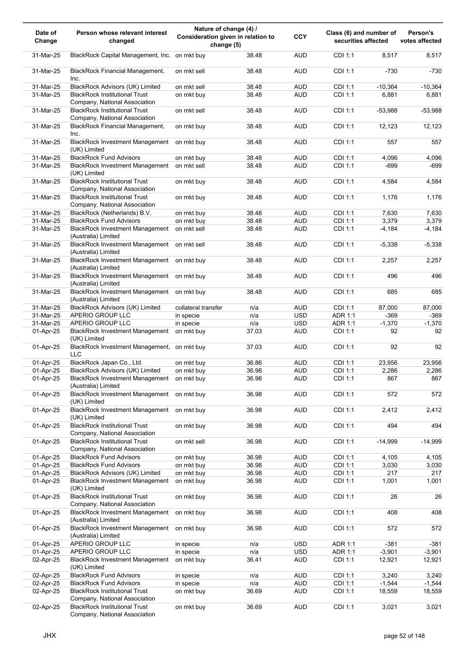 Date of Change Person whose relevant interest changed Nature of change (4) / Consideration given in relation to change (5) Class (6) and number of securities affected Person's votes affected CCY 27-Mar-25 BlackRock Fund Advisors in specie n/a AUD CDI 1:1 900 900 27-Mar-25 BlackRock Japan Co., Ltd. on mkt buy 38.50 AUD CDI 1:1 18,448 18,448 27-Mar-25 BlackRock Investment Management (Australia) Limited on mkt sell 38.75 AUD CDI 1:1 -1,724 -1,724 27-Mar-25 BlackRock Capital Management, Inc. on mkt buy 38.75 AUD CDI 1:1 6,600 6,600 27-Mar-25 BlackRock Financial Management, Inc. on mkt buy 38.75 AUD CDI 1:1 13,312 13,312 27-Mar-25 BlackRock Investment Management (Australia) Limited on mkt buy 38.75 AUD CDI 1:1 2,264 2,264 27-Mar-25 BlackRock Investment Management (Australia) Limited on mkt buy 38.75 AUD CDI 1:1 39,843 39,843 27-Mar-25 BlackRock Japan Co., Ltd. on mkt buy 38.75 AUD CDI 1:1 2,754 2,754 27-Mar-25 BlackRock Investment Management, LLC on mkt buy 38.75 AUD CDI 1:1 2,513 2,513 27-Mar-25 BlackRock Advisors (UK) Limited on mkt buy 38.75 AUD CDI 1:1 1,182 1,182 27-Mar-25 BlackRock Advisors (UK) Limited on mkt sell 38.75 AUD CDI 1:1 -2,364 -2,364 27-Mar-25 BlackRock Advisors (UK) Limited on mkt buy 38.75 AUD CDI 1:1 76 76 27-Mar-25 BlackRock Advisors (UK) Limited on mkt buy 38.75 AUD CDI 1:1 196 196 27-Mar-25 BlackRock Advisors (UK) Limited on mkt buy 38.75 AUD CDI 1:1 392 392 27-Mar-25 BlackRock Advisors (UK) Limited on mkt buy 38.75 AUD CDI 1:1 177 177 27-Mar-25 BlackRock Advisors (UK) Limited on mkt sell 38.75 AUD CDI 1:1 -128 -128 27-Mar-25 BlackRock Advisors (UK) Limited on mkt buy 38.75 AUD CDI 1:1 227 227 27-Mar-25 BlackRock Institutional Trust Company, National Association on mkt sell 38.75 AUD CDI 1:1 -1,189 -1,189 27-Mar-25 APERIO GROUP LLC in specie n/a USD ADR 1:1 -625 -625 27-Mar-25 APERIO GROUP LLC in specie n/a USD ADR 1:1 -622 -622 28-Mar-25 BlackRock Investment Management (UK) Limited on mkt sell 38.80 AUD CDI 1:1 -13,419 -13,419 28-Mar-25 BlackRock Investment Management (UK) Limited on mkt buy 39.19 AUD CDI 1:1 12,610 12,610 28-Mar-25 BlackRock Fund Advisors in specie n/a AUD CDI 1:1 12,257 12,257 28-Mar-25 BlackRock Fund Advisors in specie n/a AUD CDI 1:1 2,592 2,592 28-Mar-25 BlackRock Investment Management (Australia) Limited on mkt buy 38.68 AUD CDI 1:1 771 771 28-Mar-25 BlackRock Advisors (UK) Limited on mkt buy 38.68 AUD CDI 1:1 4,504 4,504 28-Mar-25 BlackRock Advisors (UK) Limited on mkt buy 38.68 AUD CDI 1:1 228 228 28-Mar-25 BlackRock Advisors (UK) Limited on mkt sell 38.68 AUD CDI 1:1 -201 -201 28-Mar-25 BlackRock Advisors (UK) Limited on mkt sell 38.68 AUD CDI 1:1 -916 -916 28-Mar-25 BlackRock Advisors (UK) Limited on mkt sell 38.68 AUD CDI 1:1 -89 -89 28-Mar-25 BlackRock Investment Management (Australia) Limited on mkt buy 38.68 AUD CDI 1:1 5,352 5,352 28-Mar-25 BlackRock Investment Management (Australia) Limited on mkt buy 38.68 AUD CDI 1:1 23,173 23,173 28-Mar-25 BlackRock Investment Management (Australia) Limited on mkt buy 38.68 AUD CDI 1:1 7,006 7,006 28-Mar-25 BlackRock Investment Management (Australia) Limited on mkt buy 38.68 AUD CDI 1:1 9,831 9,831 28-Mar-25 BlackRock Investment Management (Australia) Limited on mkt buy 38.68 AUD CDI 1:1 1,517 1,517 28-Mar-25 BlackRock Investment Management (Australia) Limited on mkt buy 38.68 AUD CDI 1:1 3,171 3,171 28-Mar-25 BlackRock Investment Management (Australia) Limited on mkt buy 38.68 AUD CDI 1:1 519 519 28-Mar-25 BlackRock Investment Management (Australia) Limited on mkt buy 38.68 AUD CDI 1:1 1,889 1,889 28-Mar-25 BlackRock Investment Management (Australia) Limited on mkt buy 38.68 AUD CDI 1:1 587 587 28-Mar-25 BlackRock Investment Management (Australia) Limited on mkt buy 38.68 AUD CDI 1:1 4,932 4,932 28-Mar-25 BlackRock Asset Management Canada Limited on mkt sell 38.68 AUD CDI 1:1 -181 -181 28-Mar-25 BlackRock Investment Management, LLC on mkt buy 38.68 AUD CDI 1:1 701 701 28-Mar-25 APERIO GROUP LLC in specie n/a USD ADR 1:1 -54 -54 28-Mar-25 APERIO GROUP LLC in specie n/a USD ADR 1:1 -1,786 -1,786 28-Mar-25 APERIO GROUP LLC in specie n/a AUD CDI 1:1 -2,110 -2,110 30-Mar-25 BlackRock Advisors (UK) Limited collateral transfer n/a AUD CDI 1:1 -87,000 -87,000 31-Mar-25 BlackRock Investment Management (Australia) Limited on mkt buy 38.48 AUD CDI 1:1 11,691 11,691 31-Mar-25 BlackRock Advisors (UK) Limited on mkt buy 38.48 AUD CDI 1:1 2,772 2,772 31-Mar-25 BlackRock Advisors (UK) Limited on mkt sell 38.48 AUD CDI 1:1 -458 -458 JHX page 51 of 148