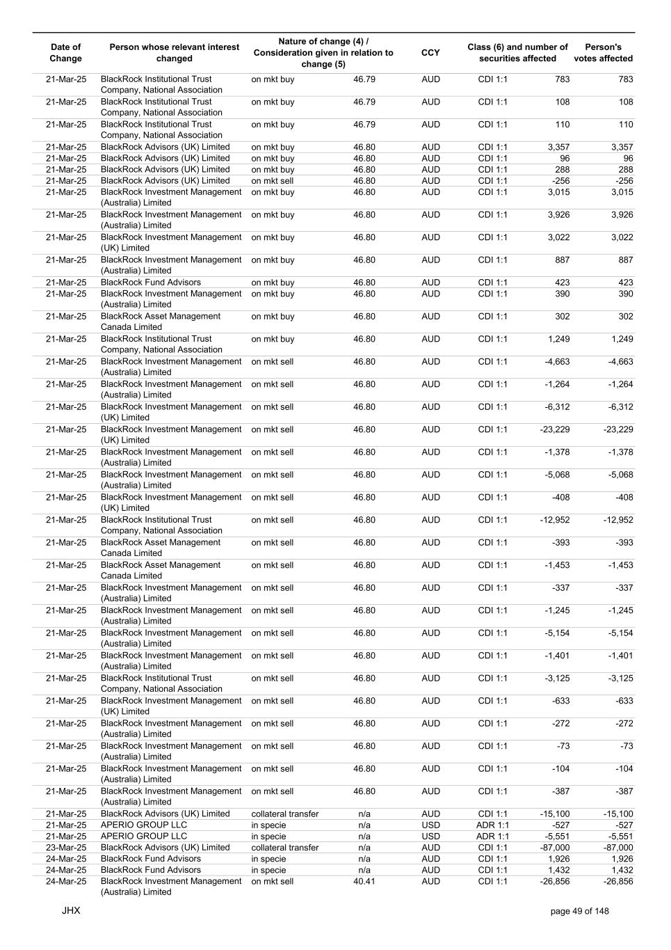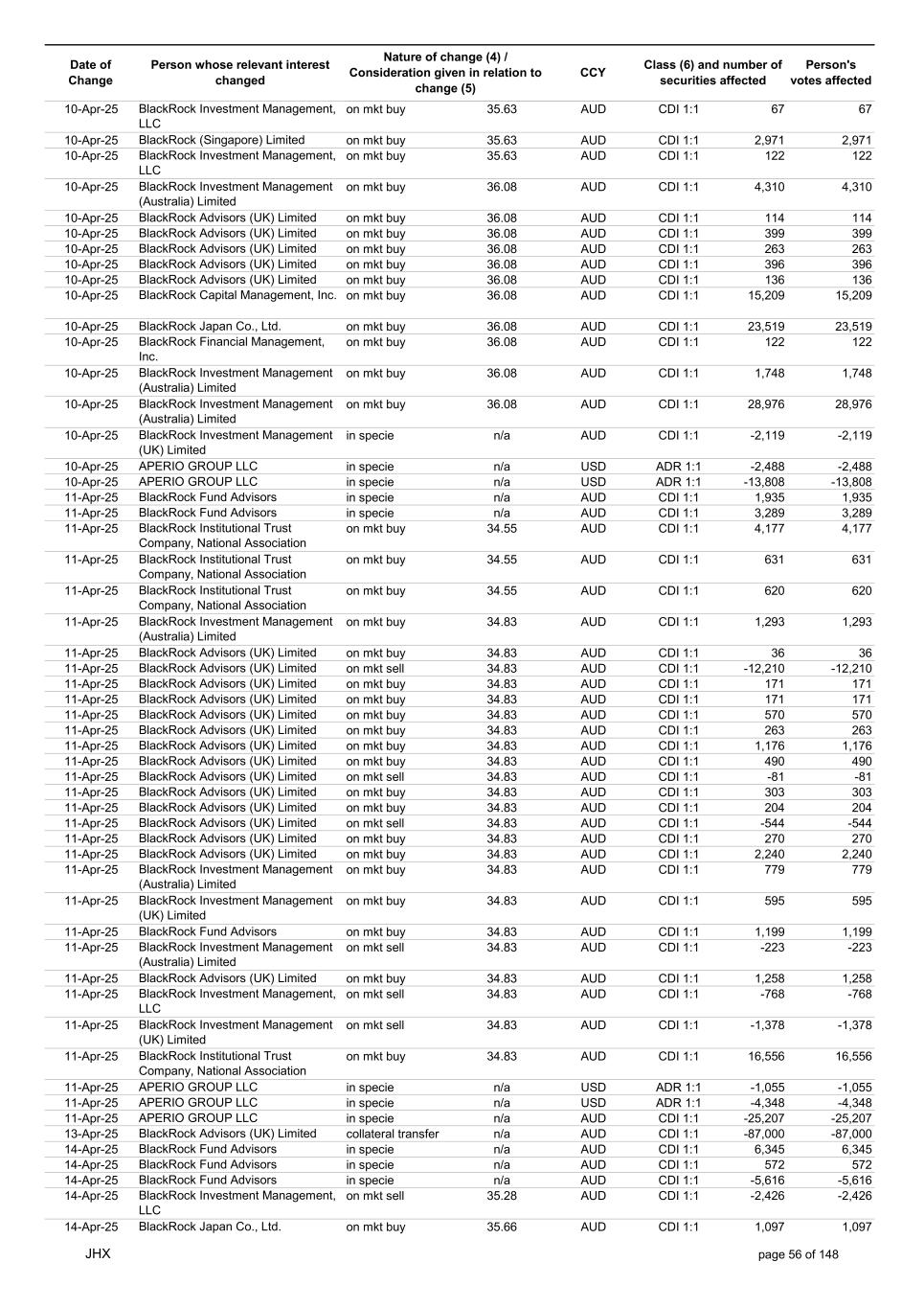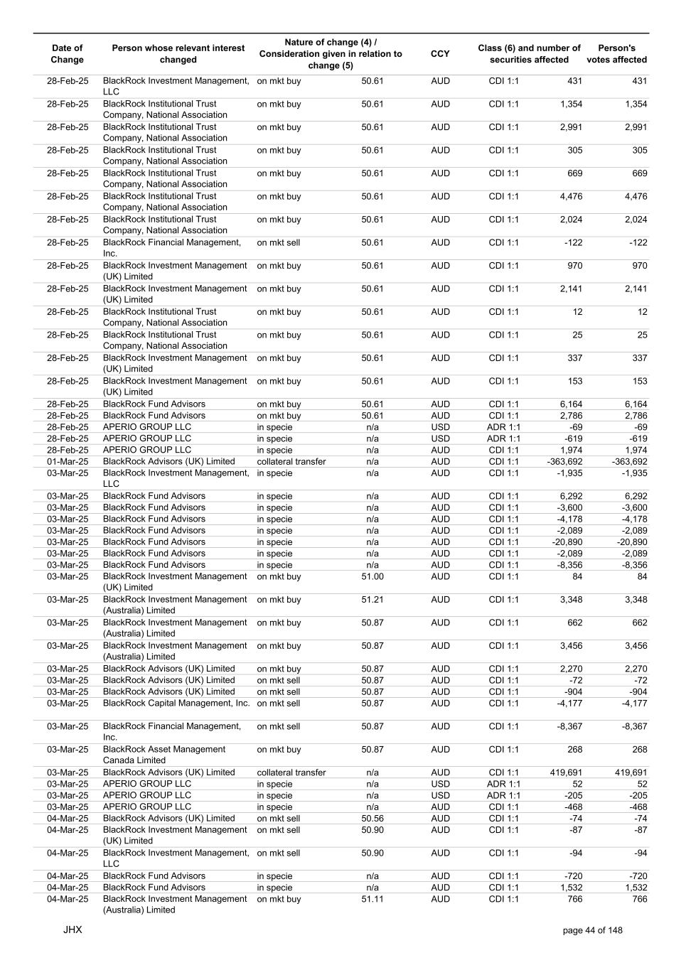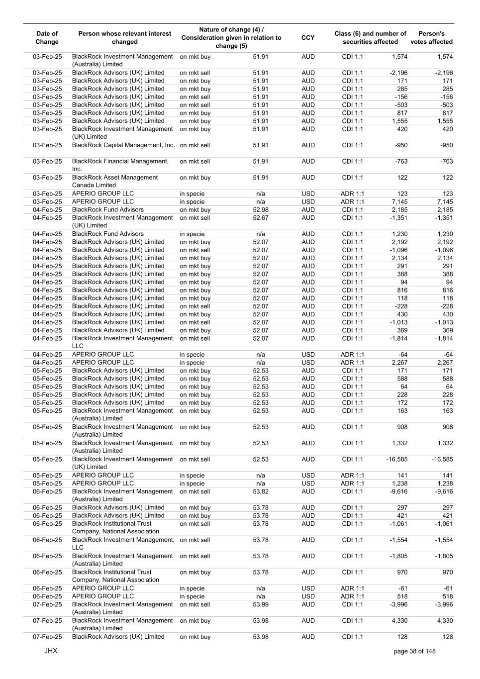 Date of Change Person whose relevant interest changed Nature of change (4) / Consideration given in relation to change (5) Class (6) and number of securities affected Person's votes affected CCY 27-Mar-25 BlackRock Fund Advisors in specie n/a AUD CDI 1:1 900 900 27-Mar-25 BlackRock Japan Co., Ltd. on mkt buy 38.50 AUD CDI 1:1 18,448 18,448 27-Mar-25 BlackRock Investment Management (Australia) Limited on mkt sell 38.75 AUD CDI 1:1 -1,724 -1,724 27-Mar-25 BlackRock Capital Management, Inc. on mkt buy 38.75 AUD CDI 1:1 6,600 6,600 27-Mar-25 BlackRock Financial Management, Inc. on mkt buy 38.75 AUD CDI 1:1 13,312 13,312 27-Mar-25 BlackRock Investment Management (Australia) Limited on mkt buy 38.75 AUD CDI 1:1 2,264 2,264 27-Mar-25 BlackRock Investment Management (Australia) Limited on mkt buy 38.75 AUD CDI 1:1 39,843 39,843 27-Mar-25 BlackRock Japan Co., Ltd. on mkt buy 38.75 AUD CDI 1:1 2,754 2,754 27-Mar-25 BlackRock Investment Management, LLC on mkt buy 38.75 AUD CDI 1:1 2,513 2,513 27-Mar-25 BlackRock Advisors (UK) Limited on mkt buy 38.75 AUD CDI 1:1 1,182 1,182 27-Mar-25 BlackRock Advisors (UK) Limited on mkt sell 38.75 AUD CDI 1:1 -2,364 -2,364 27-Mar-25 BlackRock Advisors (UK) Limited on mkt buy 38.75 AUD CDI 1:1 76 76 27-Mar-25 BlackRock Advisors (UK) Limited on mkt buy 38.75 AUD CDI 1:1 196 196 27-Mar-25 BlackRock Advisors (UK) Limited on mkt buy 38.75 AUD CDI 1:1 392 392 27-Mar-25 BlackRock Advisors (UK) Limited on mkt buy 38.75 AUD CDI 1:1 177 177 27-Mar-25 BlackRock Advisors (UK) Limited on mkt sell 38.75 AUD CDI 1:1 -128 -128 27-Mar-25 BlackRock Advisors (UK) Limited on mkt buy 38.75 AUD CDI 1:1 227 227 27-Mar-25 BlackRock Institutional Trust Company, National Association on mkt sell 38.75 AUD CDI 1:1 -1,189 -1,189 27-Mar-25 APERIO GROUP LLC in specie n/a USD ADR 1:1 -625 -625 27-Mar-25 APERIO GROUP LLC in specie n/a USD ADR 1:1 -622 -622 28-Mar-25 BlackRock Investment Management (UK) Limited on mkt sell 38.80 AUD CDI 1:1 -13,419 -13,419 28-Mar-25 BlackRock Investment Management (UK) Limited on mkt buy 39.19 AUD CDI 1:1 12,610 12,610 28-Mar-25 BlackRock Fund Advisors in specie n/a AUD CDI 1:1 12,257 12,257 28-Mar-25 BlackRock Fund Advisors in specie n/a AUD CDI 1:1 2,592 2,592 28-Mar-25 BlackRock Investment Management (Australia) Limited on mkt buy 38.68 AUD CDI 1:1 771 771 28-Mar-25 BlackRock Advisors (UK) Limited on mkt buy 38.68 AUD CDI 1:1 4,504 4,504 28-Mar-25 BlackRock Advisors (UK) Limited on mkt buy 38.68 AUD CDI 1:1 228 228 28-Mar-25 BlackRock Advisors (UK) Limited on mkt sell 38.68 AUD CDI 1:1 -201 -201 28-Mar-25 BlackRock Advisors (UK) Limited on mkt sell 38.68 AUD CDI 1:1 -916 -916 28-Mar-25 BlackRock Advisors (UK) Limited on mkt sell 38.68 AUD CDI 1:1 -89 -89 28-Mar-25 BlackRock Investment Management (Australia) Limited on mkt buy 38.68 AUD CDI 1:1 5,352 5,352 28-Mar-25 BlackRock Investment Management (Australia) Limited on mkt buy 38.68 AUD CDI 1:1 23,173 23,173 28-Mar-25 BlackRock Investment Management (Australia) Limited on mkt buy 38.68 AUD CDI 1:1 7,006 7,006 28-Mar-25 BlackRock Investment Management (Australia) Limited on mkt buy 38.68 AUD CDI 1:1 9,831 9,831 28-Mar-25 BlackRock Investment Management (Australia) Limited on mkt buy 38.68 AUD CDI 1:1 1,517 1,517 28-Mar-25 BlackRock Investment Management (Australia) Limited on mkt buy 38.68 AUD CDI 1:1 3,171 3,171 28-Mar-25 BlackRock Investment Management (Australia) Limited on mkt buy 38.68 AUD CDI 1:1 519 519 28-Mar-25 BlackRock Investment Management (Australia) Limited on mkt buy 38.68 AUD CDI 1:1 1,889 1,889 28-Mar-25 BlackRock Investment Management (Australia) Limited on mkt buy 38.68 AUD CDI 1:1 587 587 28-Mar-25 BlackRock Investment Management (Australia) Limited on mkt buy 38.68 AUD CDI 1:1 4,932 4,932 28-Mar-25 BlackRock Asset Management Canada Limited on mkt sell 38.68 AUD CDI 1:1 -181 -181 28-Mar-25 BlackRock Investment Management, LLC on mkt buy 38.68 AUD CDI 1:1 701 701 28-Mar-25 APERIO GROUP LLC in specie n/a USD ADR 1:1 -54 -54 28-Mar-25 APERIO GROUP LLC in specie n/a USD ADR 1:1 -1,786 -1,786 28-Mar-25 APERIO GROUP LLC in specie n/a AUD CDI 1:1 -2,110 -2,110 30-Mar-25 BlackRock Advisors (UK) Limited collateral transfer n/a AUD CDI 1:1 -87,000 -87,000 31-Mar-25 BlackRock Investment Management (Australia) Limited on mkt buy 38.48 AUD CDI 1:1 11,691 11,691 31-Mar-25 BlackRock Advisors (UK) Limited on mkt buy 38.48 AUD CDI 1:1 2,772 2,772 31-Mar-25 BlackRock Advisors (UK) Limited on mkt sell 38.48 AUD CDI 1:1 -458 -458 JHX page 51 of 148