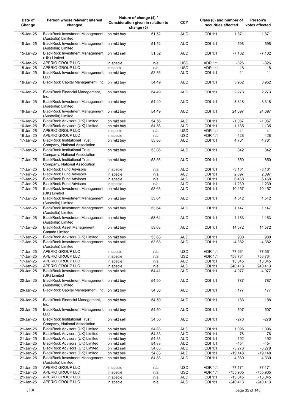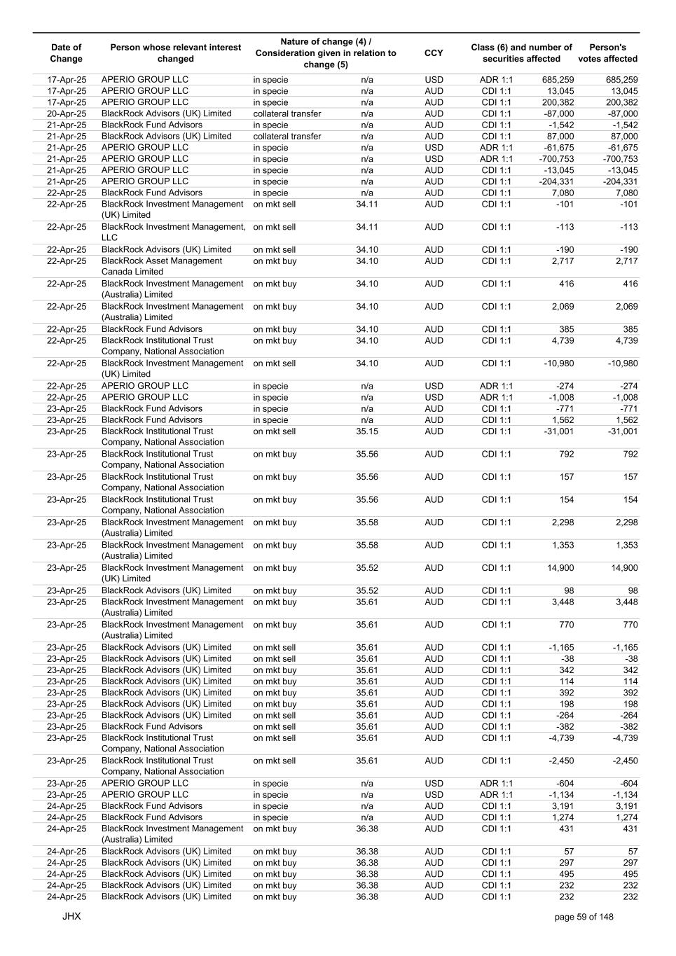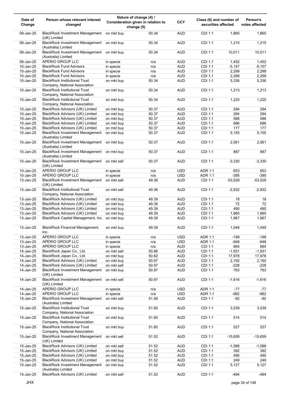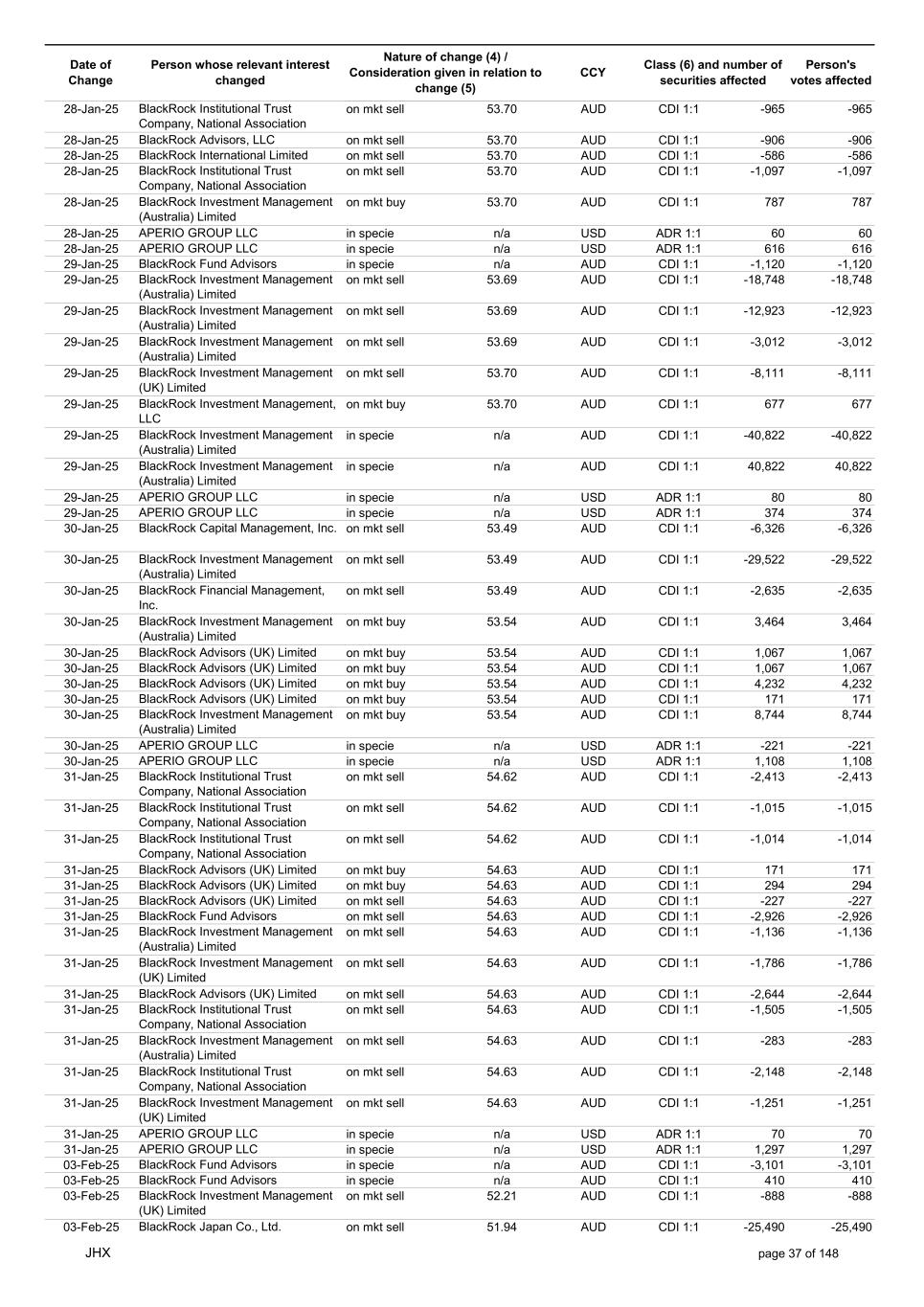 Date of Change Person whose relevant interest changed Nature of change (4) / Consideration given in relation to change (5) Class (6) and number of securities affected Person's votes affected CCY 27-Mar-25 BlackRock Fund Advisors in specie n/a AUD CDI 1:1 900 900 27-Mar-25 BlackRock Japan Co., Ltd. on mkt buy 38.50 AUD CDI 1:1 18,448 18,448 27-Mar-25 BlackRock Investment Management (Australia) Limited on mkt sell 38.75 AUD CDI 1:1 -1,724 -1,724 27-Mar-25 BlackRock Capital Management, Inc. on mkt buy 38.75 AUD CDI 1:1 6,600 6,600 27-Mar-25 BlackRock Financial Management, Inc. on mkt buy 38.75 AUD CDI 1:1 13,312 13,312 27-Mar-25 BlackRock Investment Management (Australia) Limited on mkt buy 38.75 AUD CDI 1:1 2,264 2,264 27-Mar-25 BlackRock Investment Management (Australia) Limited on mkt buy 38.75 AUD CDI 1:1 39,843 39,843 27-Mar-25 BlackRock Japan Co., Ltd. on mkt buy 38.75 AUD CDI 1:1 2,754 2,754 27-Mar-25 BlackRock Investment Management, LLC on mkt buy 38.75 AUD CDI 1:1 2,513 2,513 27-Mar-25 BlackRock Advisors (UK) Limited on mkt buy 38.75 AUD CDI 1:1 1,182 1,182 27-Mar-25 BlackRock Advisors (UK) Limited on mkt sell 38.75 AUD CDI 1:1 -2,364 -2,364 27-Mar-25 BlackRock Advisors (UK) Limited on mkt buy 38.75 AUD CDI 1:1 76 76 27-Mar-25 BlackRock Advisors (UK) Limited on mkt buy 38.75 AUD CDI 1:1 196 196 27-Mar-25 BlackRock Advisors (UK) Limited on mkt buy 38.75 AUD CDI 1:1 392 392 27-Mar-25 BlackRock Advisors (UK) Limited on mkt buy 38.75 AUD CDI 1:1 177 177 27-Mar-25 BlackRock Advisors (UK) Limited on mkt sell 38.75 AUD CDI 1:1 -128 -128 27-Mar-25 BlackRock Advisors (UK) Limited on mkt buy 38.75 AUD CDI 1:1 227 227 27-Mar-25 BlackRock Institutional Trust Company, National Association on mkt sell 38.75 AUD CDI 1:1 -1,189 -1,189 27-Mar-25 APERIO GROUP LLC in specie n/a USD ADR 1:1 -625 -625 27-Mar-25 APERIO GROUP LLC in specie n/a USD ADR 1:1 -622 -622 28-Mar-25 BlackRock Investment Management (UK) Limited on mkt sell 38.80 AUD CDI 1:1 -13,419 -13,419 28-Mar-25 BlackRock Investment Management (UK) Limited on mkt buy 39.19 AUD CDI 1:1 12,610 12,610 28-Mar-25 BlackRock Fund Advisors in specie n/a AUD CDI 1:1 12,257 12,257 28-Mar-25 BlackRock Fund Advisors in specie n/a AUD CDI 1:1 2,592 2,592 28-Mar-25 BlackRock Investment Management (Australia) Limited on mkt buy 38.68 AUD CDI 1:1 771 771 28-Mar-25 BlackRock Advisors (UK) Limited on mkt buy 38.68 AUD CDI 1:1 4,504 4,504 28-Mar-25 BlackRock Advisors (UK) Limited on mkt buy 38.68 AUD CDI 1:1 228 228 28-Mar-25 BlackRock Advisors (UK) Limited on mkt sell 38.68 AUD CDI 1:1 -201 -201 28-Mar-25 BlackRock Advisors (UK) Limited on mkt sell 38.68 AUD CDI 1:1 -916 -916 28-Mar-25 BlackRock Advisors (UK) Limited on mkt sell 38.68 AUD CDI 1:1 -89 -89 28-Mar-25 BlackRock Investment Management (Australia) Limited on mkt buy 38.68 AUD CDI 1:1 5,352 5,352 28-Mar-25 BlackRock Investment Management (Australia) Limited on mkt buy 38.68 AUD CDI 1:1 23,173 23,173 28-Mar-25 BlackRock Investment Management (Australia) Limited on mkt buy 38.68 AUD CDI 1:1 7,006 7,006 28-Mar-25 BlackRock Investment Management (Australia) Limited on mkt buy 38.68 AUD CDI 1:1 9,831 9,831 28-Mar-25 BlackRock Investment Management (Australia) Limited on mkt buy 38.68 AUD CDI 1:1 1,517 1,517 28-Mar-25 BlackRock Investment Management (Australia) Limited on mkt buy 38.68 AUD CDI 1:1 3,171 3,171 28-Mar-25 BlackRock Investment Management (Australia) Limited on mkt buy 38.68 AUD CDI 1:1 519 519 28-Mar-25 BlackRock Investment Management (Australia) Limited on mkt buy 38.68 AUD CDI 1:1 1,889 1,889 28-Mar-25 BlackRock Investment Management (Australia) Limited on mkt buy 38.68 AUD CDI 1:1 587 587 28-Mar-25 BlackRock Investment Management (Australia) Limited on mkt buy 38.68 AUD CDI 1:1 4,932 4,932 28-Mar-25 BlackRock Asset Management Canada Limited on mkt sell 38.68 AUD CDI 1:1 -181 -181 28-Mar-25 BlackRock Investment Management, LLC on mkt buy 38.68 AUD CDI 1:1 701 701 28-Mar-25 APERIO GROUP LLC in specie n/a USD ADR 1:1 -54 -54 28-Mar-25 APERIO GROUP LLC in specie n/a USD ADR 1:1 -1,786 -1,786 28-Mar-25 APERIO GROUP LLC in specie n/a AUD CDI 1:1 -2,110 -2,110 30-Mar-25 BlackRock Advisors (UK) Limited collateral transfer n/a AUD CDI 1:1 -87,000 -87,000 31-Mar-25 BlackRock Investment Management (Australia) Limited on mkt buy 38.48 AUD CDI 1:1 11,691 11,691 31-Mar-25 BlackRock Advisors (UK) Limited on mkt buy 38.48 AUD CDI 1:1 2,772 2,772 31-Mar-25 BlackRock Advisors (UK) Limited on mkt sell 38.48 AUD CDI 1:1 -458 -458 JHX page 51 of 148
