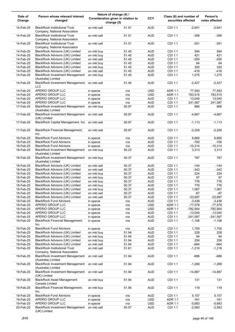 Date of Change Person whose relevant interest changed Nature of change (4) / Consideration given in relation to change (5) Class (6) and number of securities affected Person's votes affected CCY 01-Jul-25 BlackRock Fund Advisors in specie n/a USD ORD 1,626 1,626 01-Jul-25 BlackRock Advisors, LLC in specie n/a USD ORD 211 211 01-Jul-25 BlackRock Advisors, LLC in specie n/a USD ORD 9,710 9,710 01-Jul-25 BlackRock Advisors, LLC in specie n/a USD ORD 25,278 25,278 01-Jul-25 BlackRock Financial Management, Inc. in specie n/a USD ORD 2,226 2,226 01-Jul-25 BlackRock Fund Advisors in specie n/a AUD CDI 1:1 -2,800 -2,800 01-Jul-25 BlackRock Advisors, LLC on mkt sell 40.90 AUD CDI 1:1 -7,471 -7,471 01-Jul-25 BlackRock Institutional Trust Company, National Association on mkt sell 40.90 AUD CDI 1:1 -1,050 -1,050 01-Jul-25 BlackRock Advisors, LLC on mkt sell 40.90 AUD CDI 1:1 -68 -68 01-Jul-25 BlackRock Advisors, LLC on mkt sell 40.90 AUD CDI 1:1 -1,876 -1,876 01-Jul-25 BlackRock Investment Management, LLC on mkt sell 40.90 AUD CDI 1:1 -1,161 -1,161 01-Jul-25 BlackRock (Singapore) Limited on mkt sell 40.90 AUD CDI 1:1 -7,181 -7,181 01-Jul-25 BlackRock Investment Management (Australia) Limited on mkt sell 40.90 AUD CDI 1:1 -101 -101 01-Jul-25 BlackRock Investment Management, LLC on mkt sell 40.90 AUD CDI 1:1 -902 -902 01-Jul-25 BlackRock Advisors (UK) Limited on mkt sell 40.77 AUD CDI 1:1 -4,761 -4,761 01-Jul-25 BlackRock Advisors (UK) Limited on mkt buy 40.77 AUD CDI 1:1 136 136 01-Jul-25 BlackRock Advisors (UK) Limited on mkt buy 40.77 AUD CDI 1:1 408 408 01-Jul-25 BlackRock Advisors (UK) Limited on mkt buy 40.77 AUD CDI 1:1 182 182 01-Jul-25 BlackRock Investment Management (Australia) Limited on mkt buy 40.77 AUD CDI 1:1 227,510 227,510 01-Jul-25 BlackRock Asset Management North Asia Limited on mkt buy 40.77 AUD CDI 1:1 1,806 1,806 01-Jul-25 BlackRock Investment Management (UK) Limited on mkt buy 40.77 AUD CDI 1:1 1,166 1,166 01-Jul-25 BlackRock Investment Management (Australia) Limited on mkt buy 40.77 AUD CDI 1:1 311,783 311,783 01-Jul-25 BlackRock Advisors (UK) Limited on mkt buy 40.77 AUD CDI 1:1 4,906 4,906 01-Jul-25 BlackRock Investment Management (UK) Limited on mkt buy 40.77 AUD CDI 1:1 2,537 2,537 01-Jul-25 BlackRock Investment Management, LLC on mkt buy 40.77 AUD CDI 1:1 5,290 5,290 01-Jul-25 BlackRock Investment Management (Australia) Limited on mkt buy 40.77 AUD CDI 1:1 5,662 5,662 01-Jul-25 BlackRock Investment Management (Australia) Limited on mkt buy 40.77 AUD CDI 1:1 77,218 77,218 01-Jul-25 BlackRock Fund Advisors on mkt buy 40.77 AUD CDI 1:1 14,045 14,045 01-Jul-25 BlackRock Fund Advisors on mkt buy 40.77 AUD CDI 1:1 10,463 10,463 01-Jul-25 BlackRock Investment Management (Australia) Limited on mkt buy 40.77 AUD CDI 1:1 411,962 411,962 01-Jul-25 BlackRock Institutional Trust Company, National Association on mkt buy 40.77 AUD CDI 1:1 4,797 4,797 01-Jul-25 BlackRock Institutional Trust Company, National Association on mkt buy 40.77 AUD CDI 1:1 2,721 2,721 01-Jul-25 BlackRock Investment Management (Australia) Limited on mkt buy 40.77 AUD CDI 1:1 19,326 19,326 01-Jul-25 BlackRock Investment Management (Australia) Limited on mkt buy 40.77 AUD CDI 1:1 27,736 27,736 01-Jul-25 BlackRock Investment Management (UK) Limited in specie n/a AUD CDI 1:1 -12,665 -12,665 01-Jul-25 BlackRock Investment Management (UK) Limited in specie n/a AUD CDI 1:1 -2,531 -2,531 01-Jul-25 BlackRock Advisors (UK) Limited collateral transfer n/a AUD CDI 1:1 624,527 624,527 01-Jul-25 SPIDERROCK ADVISORS LLC in specie n/a USD ADR 1:1 -382 -382 01-Jul-25 APERIO GROUP LLC in specie n/a USD ORD 84,518 84,518 01-Jul-25 APERIO GROUP LLC in specie n/a USD ORD 971,860 971,860 02-Jul-25 BlackRock Investment Management (UK) Limited on mkt sell 43.11 AUD CDI 1:1 -260 -260 02-Jul-25 BlackRock Advisors, LLC on mkt sell 42.89 AUD CDI 1:1 -7,251 -7,251 02-Jul-25 BlackRock Institutional Trust Company, National Association on mkt sell 42.89 AUD CDI 1:1 -1,020 -1,020 02-Jul-25 BlackRock Advisors, LLC on mkt sell 42.89 AUD CDI 1:1 -65 -65 02-Jul-25 BlackRock Advisors, LLC on mkt sell 42.89 AUD CDI 1:1 -1,820 -1,820 02-Jul-25 BlackRock Investment Management, LLC on mkt sell 42.89 AUD CDI 1:1 -1,127 -1,127 02-Jul-25 BlackRock (Singapore) Limited on mkt sell 42.89 AUD CDI 1:1 -6,970 -6,970 02-Jul-25 BlackRock Investment Management (Australia) Limited on mkt sell 42.89 AUD CDI 1:1 -98 -98 JHX page 81 of 148