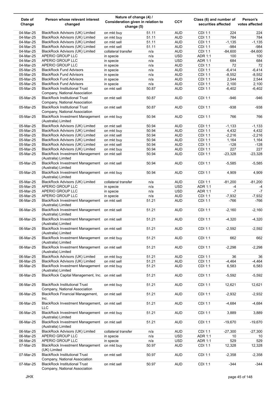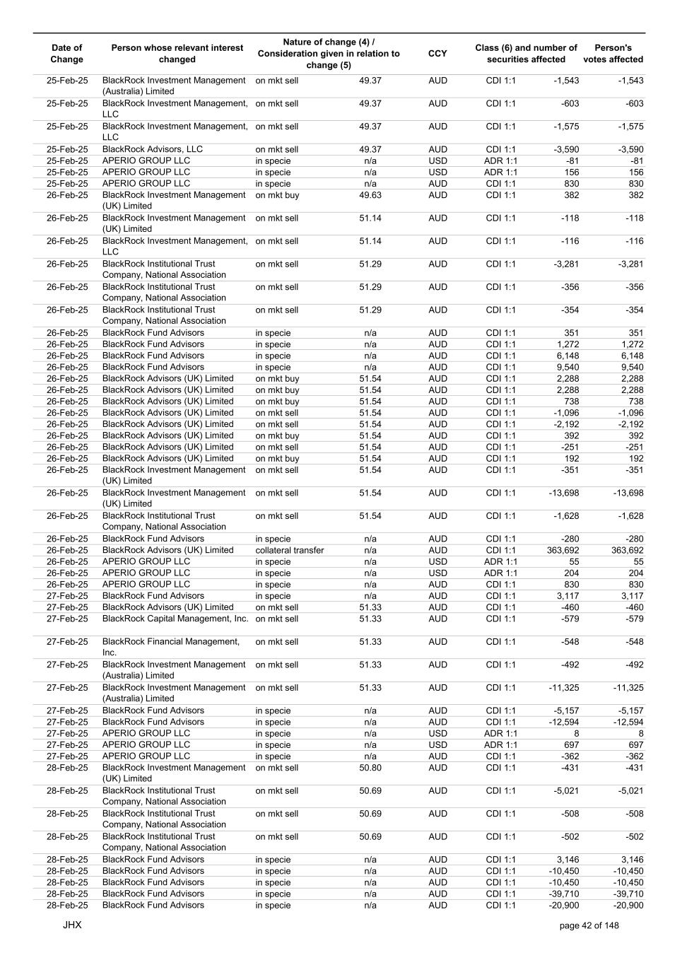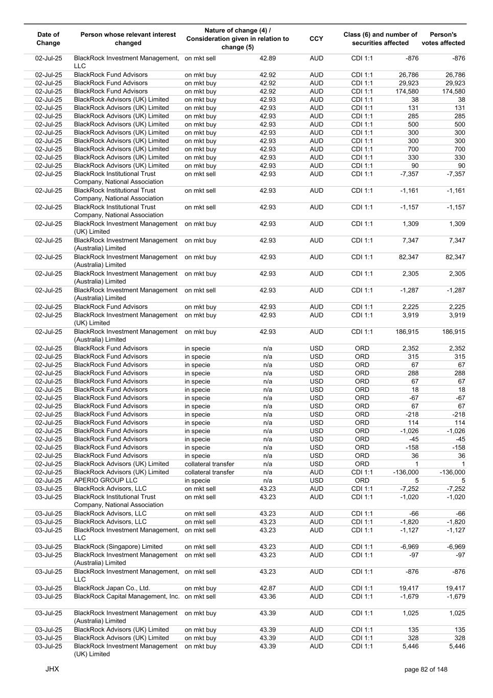 Date of Change Person whose relevant interest changed Nature of change (4) / Consideration given in relation to change (5) Class (6) and number of securities affected Person's votes affected CCY 17-Jul-25 BlackRock Advisors, LLC on mkt sell 40.60 AUD CDI 1:1 -20,328 -20,328 17-Jul-25 BlackRock Institutional Trust Company, National Association on mkt sell 40.60 AUD CDI 1:1 -2,835 -2,835 17-Jul-25 BlackRock Advisors, LLC on mkt sell 40.60 AUD CDI 1:1 -186 -186 17-Jul-25 BlackRock Advisors, LLC on mkt sell 40.60 AUD CDI 1:1 -5,115 -5,115 17-Jul-25 BlackRock Investment Management, LLC on mkt sell 40.60 AUD CDI 1:1 -3,190 -3,190 17-Jul-25 BlackRock (Singapore) Limited on mkt sell 40.60 AUD CDI 1:1 -19,759 -19,759 17-Jul-25 BlackRock Investment Management (Australia) Limited on mkt sell 40.60 AUD CDI 1:1 -212 -212 17-Jul-25 BlackRock Investment Management, LLC on mkt sell 40.60 AUD CDI 1:1 -2,507 -2,507 17-Jul-25 BlackRock Capital Management, Inc. on mkt buy 40.76 AUD CDI 1:1 6,373 6,373 17-Jul-25 BlackRock Financial Management, Inc. on mkt buy 40.76 AUD CDI 1:1 5,341 5,341 17-Jul-25 BlackRock Investment Management (Australia) Limited on mkt buy 40.76 AUD CDI 1:1 2,899 2,899 17-Jul-25 BlackRock Investment Management (Australia) Limited on mkt buy 40.76 AUD CDI 1:1 47,695 47,695 17-Jul-25 BlackRock Advisors (UK) Limited on mkt buy 40.76 AUD CDI 1:1 40,053 40,053 17-Jul-25 BlackRock Institutional Trust Company, National Association on mkt buy 40.76 AUD CDI 1:1 357,391 357,391 17-Jul-25 BlackRock Advisors (UK) Limited on mkt buy 40.76 AUD CDI 1:1 751 751 17-Jul-25 BlackRock Investment Management, LLC on mkt buy 40.76 AUD CDI 1:1 4,543 4,543 17-Jul-25 BlackRock Investment Management (Australia) Limited on mkt sell 40.70 AUD CDI 1:1 -11,520 -11,520 17-Jul-25 BlackRock Investment Management (Australia) Limited on mkt buy 40.70 AUD CDI 1:1 1,728 1,728 17-Jul-25 BlackRock Advisors (UK) Limited on mkt buy 40.70 AUD CDI 1:1 320 320 17-Jul-25 BlackRock Investment Management, LLC on mkt sell 40.70 AUD CDI 1:1 -14,585 -14,585 17-Jul-25 BlackRock Fund Advisors in specie n/a USD ORD -134 -134 17-Jul-25 BlackRock Fund Advisors in specie n/a USD ORD -872 -872 17-Jul-25 BlackRock Fund Advisors in specie n/a USD ORD -436 -436 17-Jul-25 BlackRock Fund Advisors in specie n/a USD ORD -810 -810 17-Jul-25 BlackRock Fund Advisors in specie n/a USD ORD -18 -18 17-Jul-25 BlackRock Fund Advisors in specie n/a USD ORD -603 -603 17-Jul-25 BlackRock Fund Advisors in specie n/a USD ORD -67 -67 17-Jul-25 BlackRock Fund Advisors in specie n/a USD ORD -72 -72 17-Jul-25 BlackRock Fund Advisors in specie n/a USD ORD -218 -218 17-Jul-25 BlackRock Fund Advisors in specie n/a USD ORD 54 54 17-Jul-25 BlackRock Fund Advisors in specie n/a USD ORD -224 -224 17-Jul-25 BlackRock Fund Advisors in specie n/a USD ORD -135 -135 17-Jul-25 BlackRock Fund Advisors in specie n/a USD ORD -45 -45 17-Jul-25 BlackRock Fund Advisors in specie n/a USD ORD 218 218 17-Jul-25 BlackRock Fund Advisors in specie n/a USD ORD -1,526 -1,526 17-Jul-25 BlackRock Fund Advisors in specie n/a USD ORD -218 -218 17-Jul-25 BlackRock Fund Advisors in specie n/a USD ORD -90 -90 17-Jul-25 BlackRock Fund Advisors in specie n/a USD ORD -67 -67 17-Jul-25 BlackRock Fund Advisors in specie n/a USD ORD 218 218 17-Jul-25 BlackRock Fund Advisors in specie n/a USD ORD 224 224 17-Jul-25 BlackRock Fund Advisors in specie n/a USD ORD -418 -418 17-Jul-25 BlackRock Advisors (UK) Limited collateral transfer n/a USD ORD -308,734 -308,734 17-Jul-25 BlackRock Investment Management (UK) Limited collateral transfer n/a USD ORD 1,692 1,692 17-Jul-25 BlackRock Institutional Trust Company, National Association collateral transfer n/a USD ORD 94 94 17-Jul-25 APERIO GROUP LLC in specie n/a USD ORD -326 -326 17-Jul-25 APERIO GROUP LLC in specie n/a USD ORD 174 174 18-Jul-25 BlackRock Investment Management (Australia) Limited on mkt buy 41.03 AUD CDI 1:1 8,811 8,811 18-Jul-25 BlackRock Institutional Trust Company, National Association on mkt buy 41.03 AUD CDI 1:1 809 809 18-Jul-25 BlackRock Institutional Trust Company, National Association on mkt buy 41.03 AUD CDI 1:1 111 111 18-Jul-25 BlackRock Institutional Trust Company, National Association on mkt buy 41.03 AUD CDI 1:1 109 109 18-Jul-25 BlackRock Investment Management (Australia) Limited on mkt buy 41.03 AUD CDI 1:1 1,915 1,915 18-Jul-25 BlackRock Investment Management (Australia) Limited on mkt buy 41.00 AUD CDI 1:1 1,152 1,152 JHX page 89 of 148