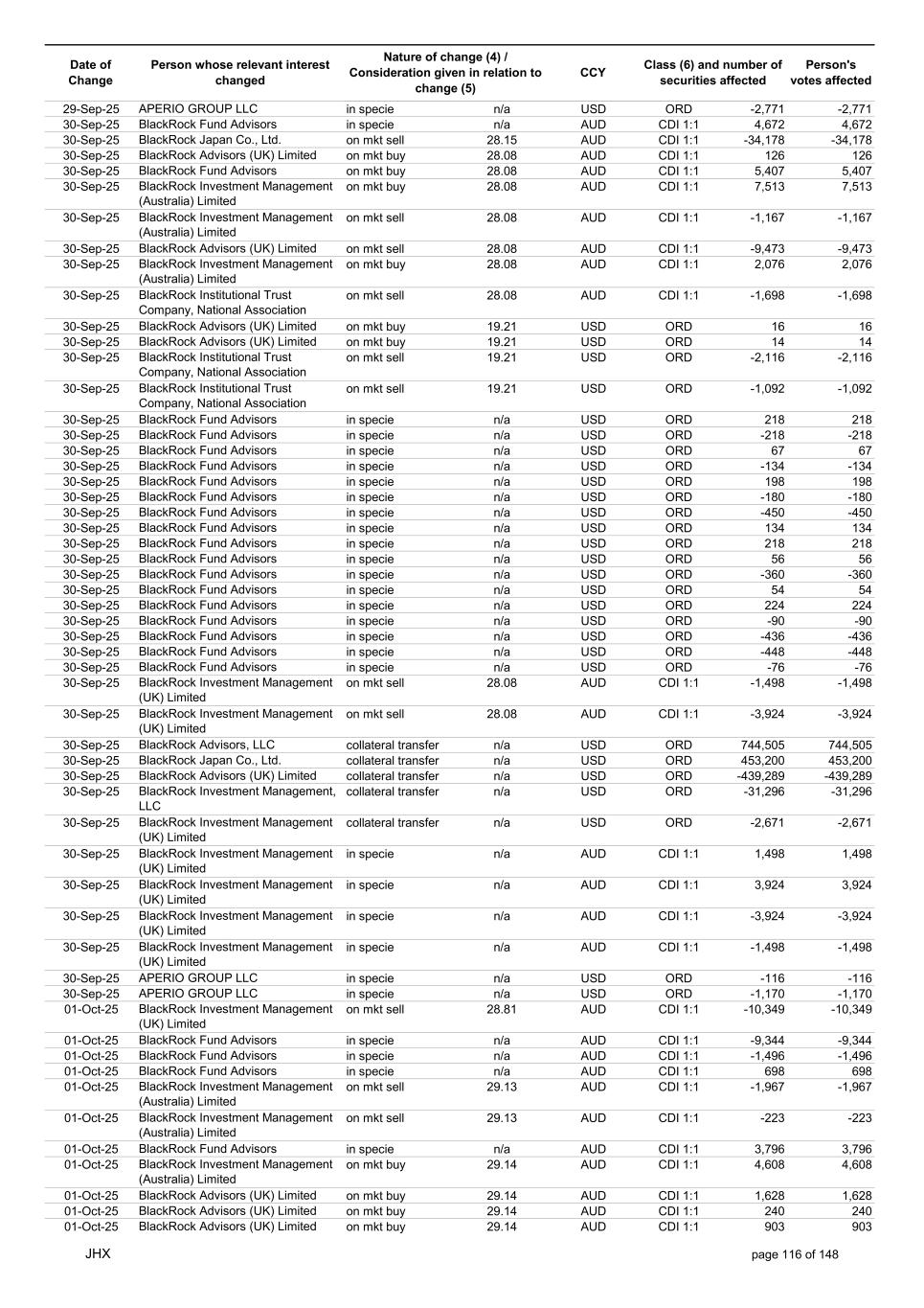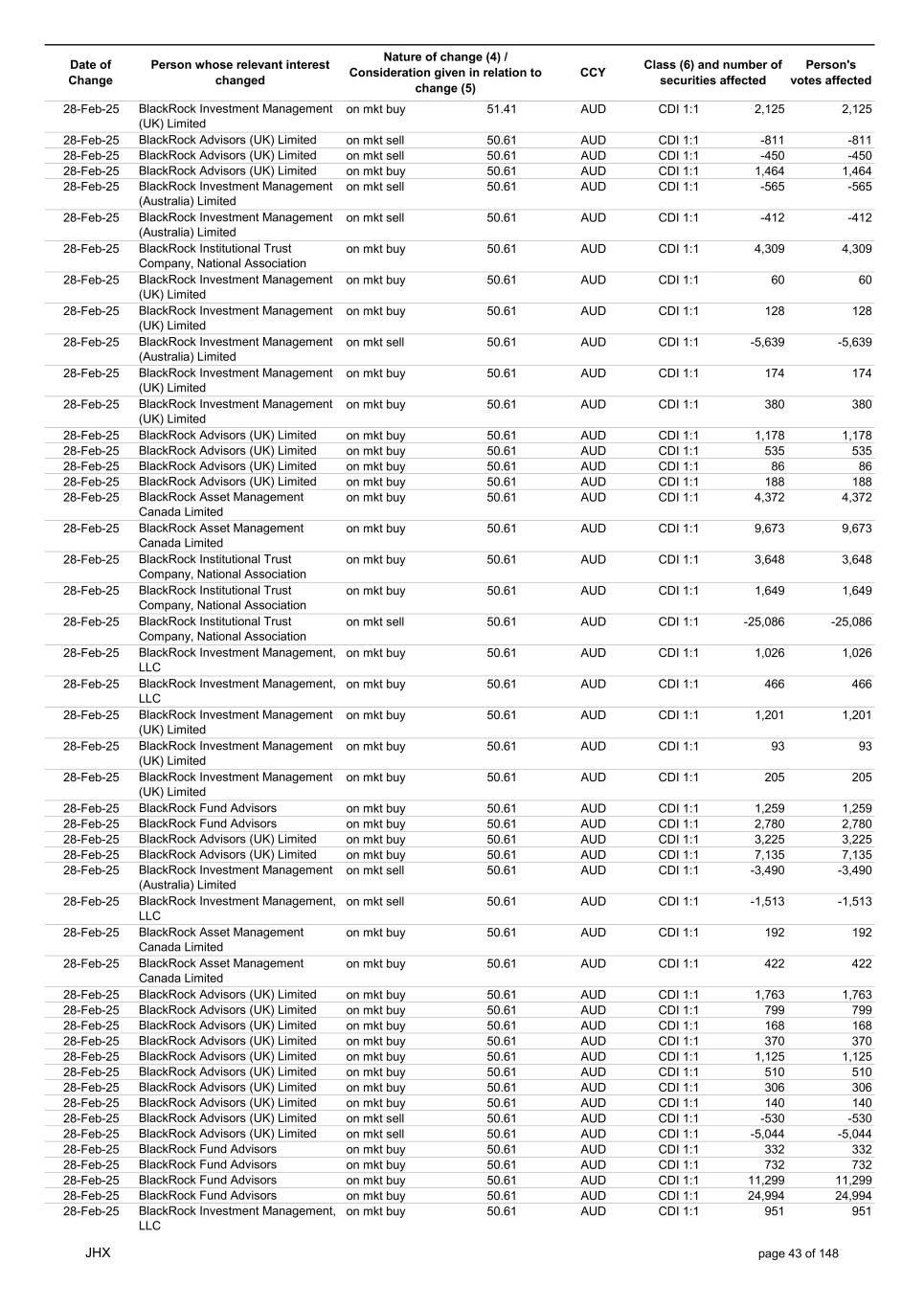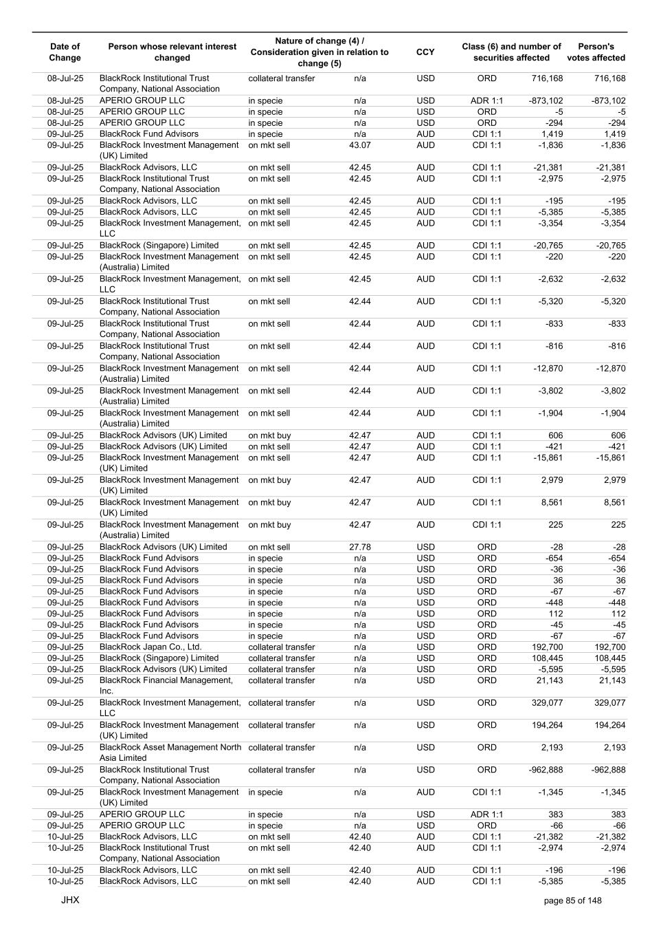 Date of Change Person whose relevant interest changed Nature of change (4) / Consideration given in relation to change (5) Class (6) and number of securities affected Person's votes affected CCY 05-Sep-25 BlackRock Investment Management, LLC collateral transfer n/a USD ORD -47,632 -47,632 05-Sep-25 BlackRock Investment Management (UK) Limited collateral transfer n/a USD ORD -141,955 -141,955 05-Sep-25 BlackRock Asset Management North Asia Limited collateral transfer n/a USD ORD -112 -112 05-Sep-25 APERIO GROUP LLC in specie n/a USD ORD -1,497 -1,497 05-Sep-25 APERIO GROUP LLC in specie n/a USD ORD -12,364 -12,364 07-Sep-25 BlackRock Advisors (UK) Limited collateral transfer n/a USD ORD -67,644 -67,644 08-Sep-25 BlackRock Capital Management, Inc. on mkt sell 30.94 AUD CDI 1:1 -293 -293 08-Sep-25 BlackRock Financial Management, Inc. on mkt sell 30.94 AUD CDI 1:1 -367 -367 08-Sep-25 BlackRock Investment Management (Australia) Limited on mkt buy 30.92 AUD CDI 1:1 6,336 6,336 08-Sep-25 BlackRock Investment Management (Australia) Limited on mkt buy 30.92 AUD CDI 1:1 2,064 2,064 08-Sep-25 BlackRock Advisors (UK) Limited on mkt buy 30.92 AUD CDI 1:1 1,505 1,505 08-Sep-25 BlackRock Advisors (UK) Limited on mkt sell 30.92 AUD CDI 1:1 -207 -207 08-Sep-25 BlackRock Investment Management (UK) Limited on mkt buy 30.92 AUD CDI 1:1 21,786 21,786 08-Sep-25 BlackRock Capital Management, Inc. on mkt sell 30.92 AUD CDI 1:1 -498 -498 08-Sep-25 BlackRock Financial Management, Inc. on mkt sell 30.92 AUD CDI 1:1 -629 -629 08-Sep-25 BlackRock Financial Management, Inc. in specie n/a AUD CDI 1:1 107,889 107,889 08-Sep-25 BlackRock Fund Advisors in specie n/a USD ORD -90 -90 08-Sep-25 BlackRock Fund Advisors in specie n/a USD ORD 67 67 08-Sep-25 BlackRock Fund Advisors in specie n/a USD ORD 180 180 08-Sep-25 BlackRock Advisors (UK) Limited in specie n/a AUD CDI 1:1 -7,079 -7,079 08-Sep-25 BlackRock Advisors (UK) Limited in specie n/a AUD CDI 1:1 -1,610 -1,610 08-Sep-25 BlackRock (Singapore) Limited collateral transfer n/a USD ORD 2,028 2,028 08-Sep-25 BlackRock Advisors (UK) Limited collateral transfer n/a USD ORD 38 38 08-Sep-25 BlackRock Financial Management, Inc. collateral transfer n/a USD ORD 53,796 53,796 08-Sep-25 BlackRock Investment Management (UK) Limited collateral transfer n/a USD ORD 14,044 14,044 08-Sep-25 APERIO GROUP LLC in specie n/a USD ORD -914 -914 08-Sep-25 APERIO GROUP LLC in specie n/a USD ORD -1,693 -1,693 09-Sep-25 BlackRock Fund Advisors in specie n/a AUD CDI 1:1 41,496 41,496 09-Sep-25 BlackRock Advisors (UK) Limited on mkt sell 30.20 AUD CDI 1:1 -1,627 -1,627 09-Sep-25 BlackRock Advisors (UK) Limited on mkt sell 30.20 AUD CDI 1:1 -3,014 -3,014 09-Sep-25 BlackRock Advisors (UK) Limited on mkt buy 30.20 AUD CDI 1:1 395 395 09-Sep-25 BlackRock Advisors (UK) Limited on mkt buy 30.20 AUD CDI 1:1 316 316 09-Sep-25 BlackRock Advisors (UK) Limited on mkt buy 30.20 AUD CDI 1:1 512 512 09-Sep-25 BlackRock Advisors (UK) Limited on mkt buy 30.20 AUD CDI 1:1 512 512 09-Sep-25 BlackRock Advisors (UK) Limited on mkt buy 30.20 AUD CDI 1:1 640 640 09-Sep-25 BlackRock Fund Advisors in specie n/a USD ORD -134 -134 09-Sep-25 BlackRock Fund Advisors in specie n/a USD ORD 395 395 09-Sep-25 BlackRock Fund Advisors in specie n/a USD ORD -450 -450 09-Sep-25 BlackRock Fund Advisors in specie n/a USD ORD 90 90 09-Sep-25 BlackRock Fund Advisors in specie n/a USD ORD 54 54 09-Sep-25 BlackRock Fund Advisors in specie n/a USD ORD 224 224 09-Sep-25 BlackRock Fund Advisors in specie n/a USD ORD 76 76 09-Sep-25 BlackRock Fund Advisors in specie n/a USD ORD 114 114 09-Sep-25 BlackRock Fund Advisors in specie n/a USD ORD 56 56 09-Sep-25 BlackRock Japan Co., Ltd. collateral transfer n/a USD ORD 46,700 46,700 09-Sep-25 BlackRock (Singapore) Limited collateral transfer n/a USD ORD 169 169 09-Sep-25 BlackRock Advisors (UK) Limited collateral transfer n/a USD ORD -17 -17 09-Sep-25 BlackRock Financial Management, Inc. collateral transfer n/a USD ORD -40 -40 09-Sep-25 BlackRock Investment Management, LLC collateral transfer n/a USD ORD 501 501 09-Sep-25 BlackRock Investment Management (UK) Limited collateral transfer n/a USD ORD -657 -657 09-Sep-25 BlackRock Asset Management North Asia Limited collateral transfer n/a USD ORD 26 26 09-Sep-25 BlackRock Institutional Trust Company, National Association collateral transfer n/a USD ORD 27,426 27,426 09-Sep-25 APERIO GROUP LLC in specie n/a USD ORD -740 -740 09-Sep-25 APERIO GROUP LLC in specie n/a USD ORD -7,768 -7,768 10-Sep-25 BlackRock Fund Advisors in specie n/a AUD CDI 1:1 4,540 4,540 JHX page 108 of 148