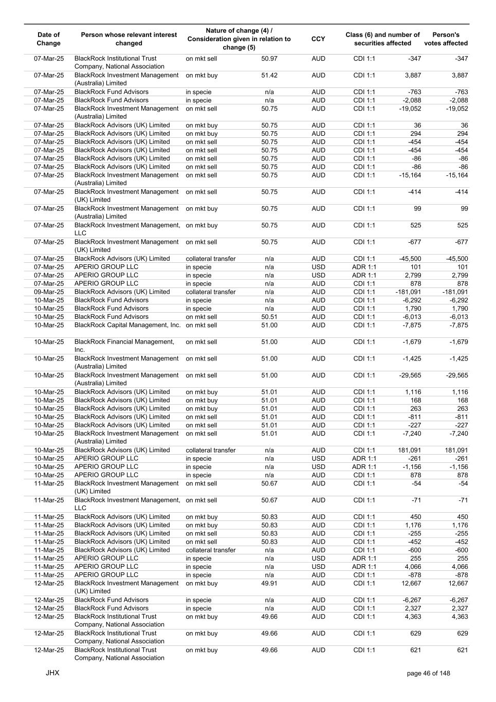 Date of Change Person whose relevant interest changed Nature of change (4) / Consideration given in relation to change (5) Class (6) and number of securities affected Person's votes affected CCY 12-Mar-25 BlackRock Advisors (UK) Limited on mkt sell 49.53 AUD CDI 1:1 -452 -452 12-Mar-25 BlackRock Advisors (UK) Limited on mkt sell 49.53 AUD CDI 1:1 -227 -227 12-Mar-25 BlackRock Advisors (UK) Limited on mkt sell 49.53 AUD CDI 1:1 -174 -174 12-Mar-25 BlackRock Investment Management (Australia) Limited on mkt sell 49.53 AUD CDI 1:1 -7,411 -7,411 12-Mar-25 BlackRock Investment Management (Australia) Limited on mkt sell 49.53 AUD CDI 1:1 -6,003 -6,003 12-Mar-25 BlackRock Investment Management (Australia) Limited on mkt sell 49.53 AUD CDI 1:1 -3,184 -3,184 12-Mar-25 BlackRock Investment Management (UK) Limited on mkt sell 49.53 AUD CDI 1:1 -10,022 -10,022 12-Mar-25 BlackRock Advisors (UK) Limited collateral transfer n/a AUD CDI 1:1 -65,400 -65,400 12-Mar-25 APERIO GROUP LLC in specie n/a USD ADR 1:1 154 154 12-Mar-25 APERIO GROUP LLC in specie n/a USD ADR 1:1 2,621 2,621 13-Mar-25 BlackRock Institutional Trust Company, National Association on mkt buy 49.63 AUD CDI 1:1 22,158 22,158 13-Mar-25 BlackRock Fund Advisors in specie n/a AUD CDI 1:1 763 763 13-Mar-25 BlackRock Fund Advisors in specie n/a AUD CDI 1:1 -4,176 -4,176 13-Mar-25 BlackRock Fund Advisors in specie n/a AUD CDI 1:1 1,246 1,246 13-Mar-25 BlackRock Fund Advisors in specie n/a AUD CDI 1:1 2,568 2,568 13-Mar-25 BlackRock Advisors (UK) Limited on mkt buy 49.65 AUD CDI 1:1 3,429 3,429 13-Mar-25 BlackRock Advisors (UK) Limited on mkt buy 49.65 AUD CDI 1:1 112 112 13-Mar-25 BlackRock Advisors (UK) Limited on mkt buy 49.65 AUD CDI 1:1 392 392 13-Mar-25 BlackRock Advisors (UK) Limited on mkt buy 49.65 AUD CDI 1:1 95 95 13-Mar-25 BlackRock Advisors (UK) Limited on mkt buy 49.65 AUD CDI 1:1 128 128 13-Mar-25 BlackRock Advisors (UK) Limited on mkt sell 49.65 AUD CDI 1:1 -64 -64 13-Mar-25 BlackRock Capital Management, Inc. on mkt sell 49.65 AUD CDI 1:1 -3,097 -3,097 13-Mar-25 BlackRock Investment Management (UK) Limited on mkt sell 49.65 AUD CDI 1:1 -332 -332 13-Mar-25 BlackRock Japan Co., Ltd. on mkt sell 49.65 AUD CDI 1:1 -478 -478 13-Mar-25 BlackRock Advisors, LLC on mkt sell 49.65 AUD CDI 1:1 -39 -39 13-Mar-25 BlackRock Financial Management, Inc. on mkt sell 49.65 AUD CDI 1:1 -314 -314 13-Mar-25 BlackRock Investment Management (Australia) Limited on mkt sell 49.65 AUD CDI 1:1 -241 -241 13-Mar-25 BlackRock Investment Management (Australia) Limited on mkt sell 49.65 AUD CDI 1:1 -9,624 -9,624 13-Mar-25 BlackRock Fund Advisors in specie n/a AUD CDI 1:1 7,004 7,004 13-Mar-25 BlackRock Advisors (UK) Limited collateral transfer n/a AUD CDI 1:1 -115,091 -115,091 13-Mar-25 APERIO GROUP LLC in specie n/a USD ADR 1:1 159 159 13-Mar-25 APERIO GROUP LLC in specie n/a USD ADR 1:1 2,027 2,027 14-Mar-25 BlackRock Investment Management (UK) Limited on mkt buy 49.73 AUD CDI 1:1 12,985 12,985 14-Mar-25 BlackRock Fund Advisors in specie n/a AUD CDI 1:1 -6,292 -6,292 14-Mar-25 BlackRock Fund Advisors in specie n/a AUD CDI 1:1 -10,720 -10,720 14-Mar-25 BlackRock Fund Advisors in specie n/a AUD CDI 1:1 3,424 3,424 14-Mar-25 BlackRock Fund Advisors in specie n/a AUD CDI 1:1 19,740 19,740 14-Mar-25 BlackRock Advisors (UK) Limited on mkt sell 50.16 AUD CDI 1:1 -1,096 -1,096 14-Mar-25 BlackRock Advisors (UK) Limited on mkt buy 50.16 AUD CDI 1:1 224 224 14-Mar-25 BlackRock Advisors (UK) Limited on mkt sell 50.16 AUD CDI 1:1 -255 -255 14-Mar-25 BlackRock Advisors (UK) Limited on mkt sell 50.16 AUD CDI 1:1 -172 -172 14-Mar-25 BlackRock Investment Management (Australia) Limited on mkt sell 50.16 AUD CDI 1:1 -10,277 -10,277 14-Mar-25 BlackRock Investment Management (UK) Limited on mkt sell 50.16 AUD CDI 1:1 -298 -298 14-Mar-25 BlackRock Institutional Trust Company, National Association on mkt sell 50.16 AUD CDI 1:1 -12,561 -12,561 14-Mar-25 BlackRock Investment Management (Australia) Limited on mkt sell 50.16 AUD CDI 1:1 -1,016 -1,016 14-Mar-25 BlackRock Advisors (UK) Limited on mkt buy 50.16 AUD CDI 1:1 281 281 14-Mar-25 BlackRock Institutional Trust Company, National Association on mkt sell 50.16 AUD CDI 1:1 -1,874 -1,874 14-Mar-25 BlackRock Advisors (UK) Limited collateral transfer n/a AUD CDI 1:1 43,500 43,500 14-Mar-25 APERIO GROUP LLC in specie n/a USD ADR 1:1 76 76 14-Mar-25 APERIO GROUP LLC in specie n/a USD ADR 1:1 430 430 14-Mar-25 APERIO GROUP LLC in specie n/a AUD CDI 1:1 -1,585 -1,585 16-Mar-25 BlackRock Advisors (UK) Limited collateral transfer n/a AUD CDI 1:1 -43,500 -43,500 17-Mar-25 BlackRock Fund Advisors in specie n/a AUD CDI 1:1 2,120 2,120 17-Mar-25 BlackRock Investment Management (Australia) Limited on mkt buy 50.38 AUD CDI 1:1 766 766 17-Mar-25 BlackRock Advisors (UK) Limited on mkt sell 50.38 AUD CDI 1:1 -2,236 -2,236 17-Mar-25 BlackRock Advisors (UK) Limited on mkt buy 50.38 AUD CDI 1:1 280 280 JHX page 47 of 148