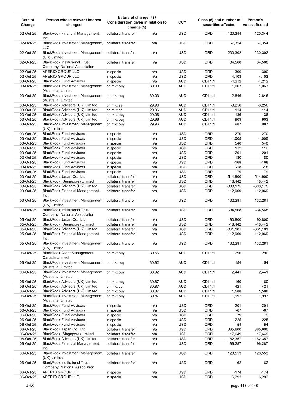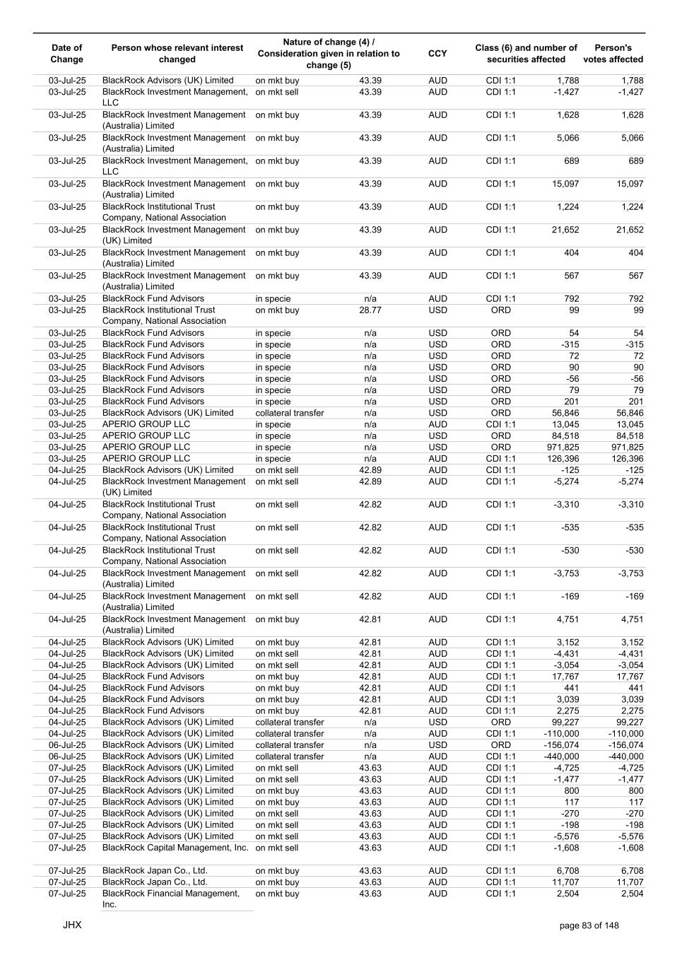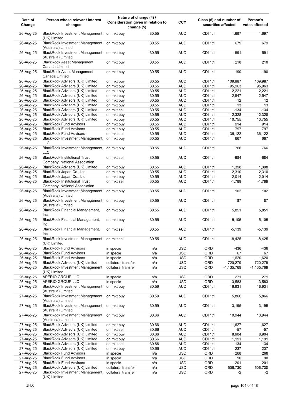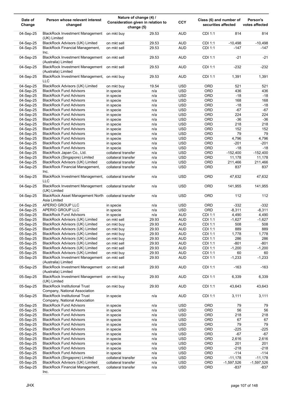 Date of Change Person whose relevant interest changed Nature of change (4) / Consideration given in relation to change (5) Class (6) and number of securities affected Person's votes affected CCY 13-Aug-25 BlackRock Investment Management (UK) Limited collateral transfer n/a USD ORD 56,819 56,819 13-Aug-25 BlackRock Asset Management North Asia Limited collateral transfer n/a USD ORD -8,725 -8,725 13-Aug-25 APERIO GROUP LLC in specie n/a USD ORD 16 16 13-Aug-25 APERIO GROUP LLC in specie n/a USD ORD 252 252 14-Aug-25 BlackRock Investment Management (UK) Limited on mkt buy 45.59 AUD CDI 1:1 2,176 2,176 14-Aug-25 BlackRock Japan Co., Ltd. on mkt buy 45.17 AUD CDI 1:1 656 656 14-Aug-25 BlackRock Capital Management, Inc. on mkt sell 45.65 AUD CDI 1:1 -872 -872 14-Aug-25 BlackRock Fund Advisors in specie n/a AUD CDI 1:1 2,064 2,064 14-Aug-25 BlackRock Investment Management (Australia) Limited on mkt buy 45.67 AUD CDI 1:1 1,728 1,728 14-Aug-25 BlackRock Advisors (UK) Limited on mkt buy 45.67 AUD CDI 1:1 89 89 14-Aug-25 BlackRock Financial Management, Inc. on mkt buy 45.67 AUD CDI 1:1 282 282 14-Aug-25 BlackRock Fund Advisors in specie n/a AUD CDI 1:1 -8,360 -8,360 14-Aug-25 BlackRock Fund Advisors in specie n/a USD ORD -218 -218 14-Aug-25 BlackRock Fund Advisors in specie n/a USD ORD 38 38 14-Aug-25 BlackRock Fund Advisors in specie n/a USD ORD 36 36 14-Aug-25 BlackRock Fund Advisors in specie n/a USD ORD 218 218 14-Aug-25 BlackRock Fund Advisors in specie n/a USD ORD 280 280 14-Aug-25 BlackRock Fund Advisors in specie n/a USD ORD -654 -654 14-Aug-25 BlackRock Fund Advisors in specie n/a USD ORD 79 79 14-Aug-25 BlackRock Fund Advisors in specie n/a USD ORD 135 135 14-Aug-25 BlackRock Fund Advisors in specie n/a USD ORD -18 -18 14-Aug-25 BlackRock Japan Co., Ltd. collateral transfer n/a USD ORD 63,800 63,800 14-Aug-25 BlackRock (Singapore) Limited collateral transfer n/a USD ORD -5,968 -5,968 14-Aug-25 BlackRock Advisors (UK) Limited collateral transfer n/a USD ORD 39,810 39,810 14-Aug-25 BlackRock Financial Management, Inc. collateral transfer n/a USD ORD -165,247 -165,247 14-Aug-25 BlackRock Investment Management, LLC collateral transfer n/a USD ORD -357 -357 14-Aug-25 BlackRock Investment Management (UK) Limited collateral transfer n/a USD ORD 115,124 115,124 14-Aug-25 APERIO GROUP LLC in specie n/a USD ORD 16 16 14-Aug-25 APERIO GROUP LLC in specie n/a USD ORD 5 5 15-Aug-25 BlackRock Fund Advisors in specie n/a AUD CDI 1:1 6,705 6,705 15-Aug-25 BlackRock Institutional Trust Company, National Association on mkt sell 45.59 AUD CDI 1:1 -466 -466 15-Aug-25 BlackRock Institutional Trust Company, National Association on mkt sell 45.59 AUD CDI 1:1 -81 -81 15-Aug-25 BlackRock Institutional Trust Company, National Association on mkt sell 45.59 AUD CDI 1:1 -78 -78 15-Aug-25 BlackRock Investment Management (Australia) Limited on mkt buy 45.60 AUD CDI 1:1 6,912 6,912 15-Aug-25 BlackRock Advisors (UK) Limited on mkt buy 45.60 AUD CDI 1:1 1,593 1,593 15-Aug-25 BlackRock Investment Management (UK) Limited on mkt sell 45.60 AUD CDI 1:1 -7,945 -7,945 15-Aug-25 BlackRock Investment Management (UK) Limited on mkt sell 45.60 AUD CDI 1:1 -3,434 -3,434 15-Aug-25 BlackRock Investment Management (Australia) Limited on mkt buy 45.60 AUD CDI 1:1 453 453 15-Aug-25 BlackRock Investment Management (Australia) Limited on mkt buy 45.60 AUD CDI 1:1 65 65 15-Aug-25 BlackRock Fund Advisors in specie n/a AUD CDI 1:1 1,104 1,104 15-Aug-25 BlackRock Financial Management, Inc. on mkt sell 29.01 USD ORD -561 -561 15-Aug-25 BlackRock Fund Advisors in specie n/a USD ORD 218 218 15-Aug-25 BlackRock Fund Advisors in specie n/a USD ORD -67 -67 15-Aug-25 BlackRock Fund Advisors in specie n/a USD ORD 18 18 15-Aug-25 BlackRock Fund Advisors in specie n/a USD ORD 79 79 15-Aug-25 BlackRock Fund Advisors in specie n/a USD ORD -168 -168 15-Aug-25 BlackRock Fund Advisors in specie n/a USD ORD -67 -67 15-Aug-25 BlackRock Fund Advisors in specie n/a USD ORD -67 -67 15-Aug-25 BlackRock Fund Advisors in specie n/a USD ORD 218 218 15-Aug-25 BlackRock Fund Advisors in specie n/a USD ORD 67 67 15-Aug-25 BlackRock Japan Co., Ltd. collateral transfer n/a USD ORD -66,975 -66,975 15-Aug-25 BlackRock Advisors (UK) Limited collateral transfer n/a USD ORD 207,841 207,841 15-Aug-25 BlackRock Investment Management (UK) Limited collateral transfer n/a USD ORD -227,378 -227,378 15-Aug-25 APERIO GROUP LLC in specie n/a USD ORD 303 303 JHX page 100 of 148