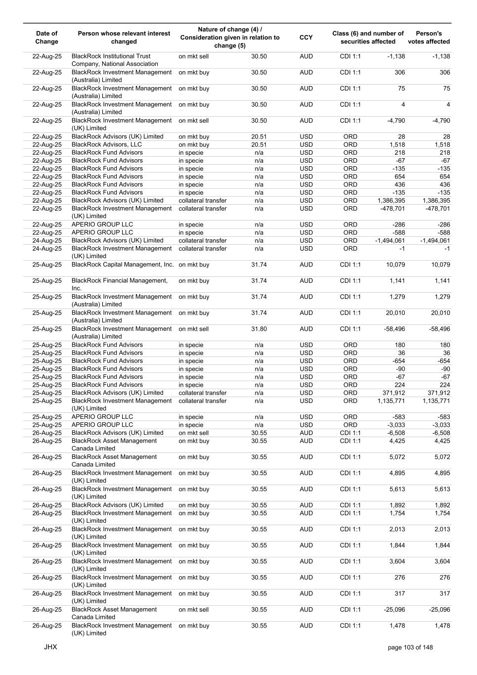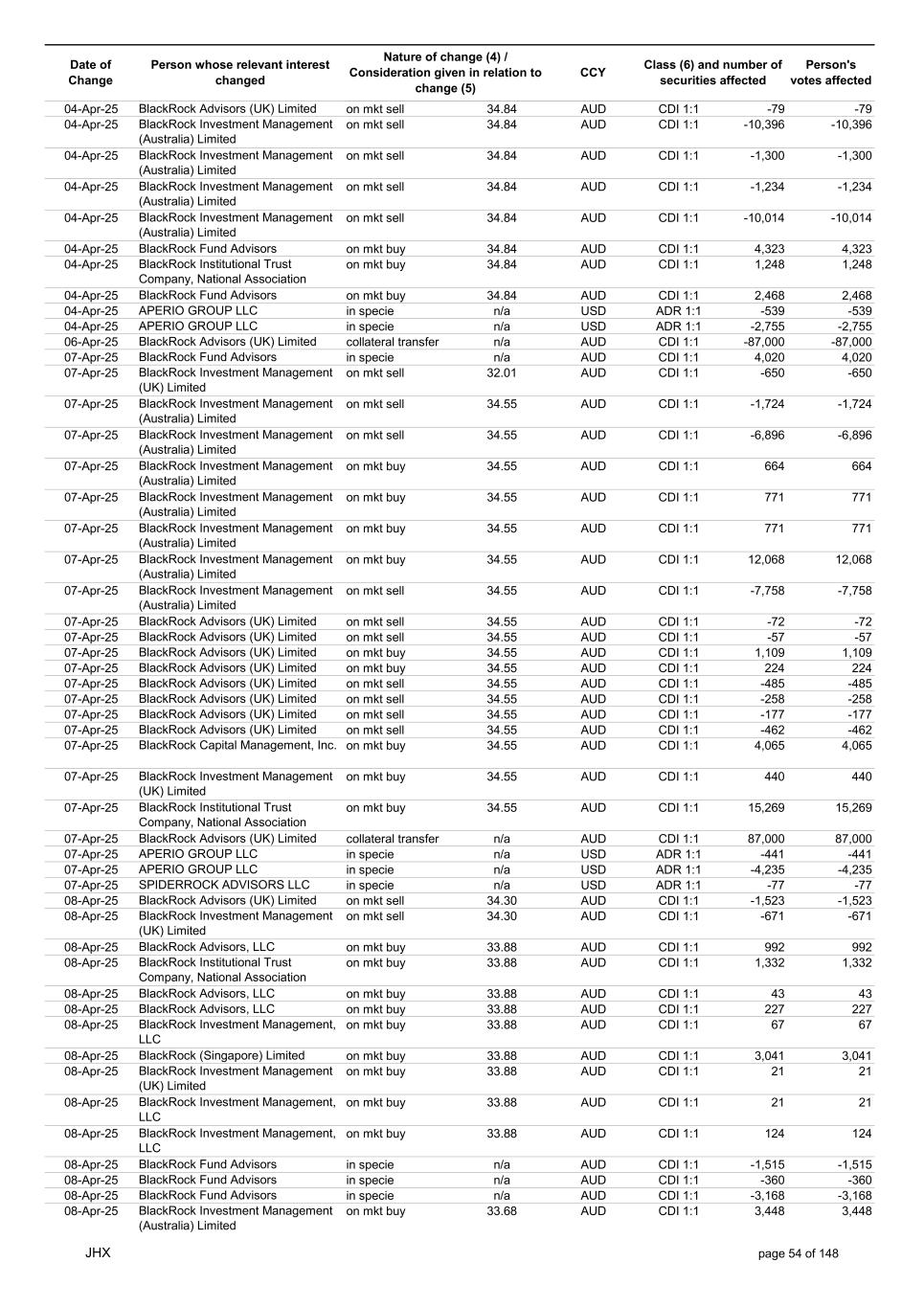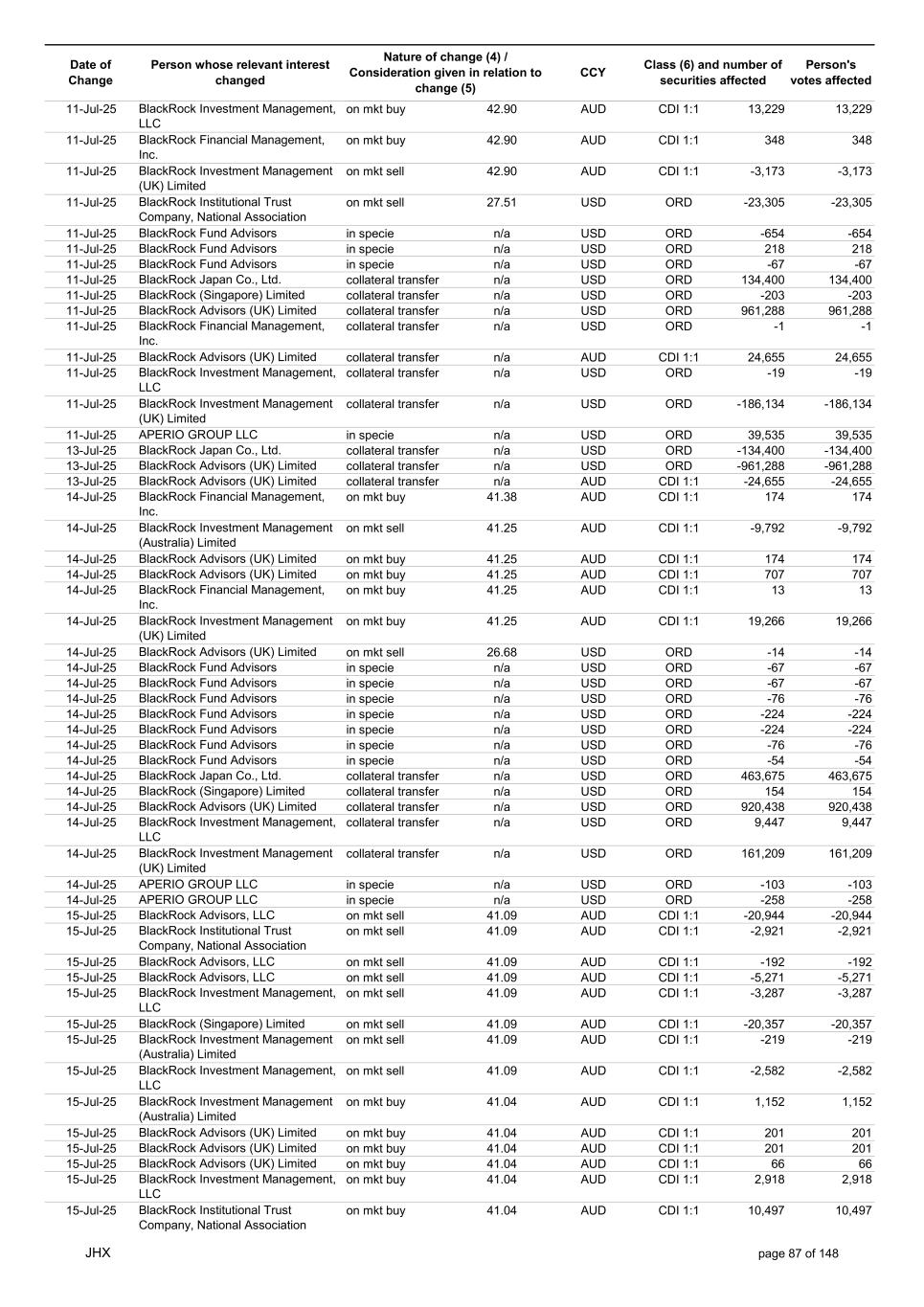 Date of Change Person whose relevant interest changed Nature of change (4) / Consideration given in relation to change (5) Class (6) and number of securities affected Person's votes affected CCY 13-Aug-25 BlackRock Investment Management (UK) Limited collateral transfer n/a USD ORD 56,819 56,819 13-Aug-25 BlackRock Asset Management North Asia Limited collateral transfer n/a USD ORD -8,725 -8,725 13-Aug-25 APERIO GROUP LLC in specie n/a USD ORD 16 16 13-Aug-25 APERIO GROUP LLC in specie n/a USD ORD 252 252 14-Aug-25 BlackRock Investment Management (UK) Limited on mkt buy 45.59 AUD CDI 1:1 2,176 2,176 14-Aug-25 BlackRock Japan Co., Ltd. on mkt buy 45.17 AUD CDI 1:1 656 656 14-Aug-25 BlackRock Capital Management, Inc. on mkt sell 45.65 AUD CDI 1:1 -872 -872 14-Aug-25 BlackRock Fund Advisors in specie n/a AUD CDI 1:1 2,064 2,064 14-Aug-25 BlackRock Investment Management (Australia) Limited on mkt buy 45.67 AUD CDI 1:1 1,728 1,728 14-Aug-25 BlackRock Advisors (UK) Limited on mkt buy 45.67 AUD CDI 1:1 89 89 14-Aug-25 BlackRock Financial Management, Inc. on mkt buy 45.67 AUD CDI 1:1 282 282 14-Aug-25 BlackRock Fund Advisors in specie n/a AUD CDI 1:1 -8,360 -8,360 14-Aug-25 BlackRock Fund Advisors in specie n/a USD ORD -218 -218 14-Aug-25 BlackRock Fund Advisors in specie n/a USD ORD 38 38 14-Aug-25 BlackRock Fund Advisors in specie n/a USD ORD 36 36 14-Aug-25 BlackRock Fund Advisors in specie n/a USD ORD 218 218 14-Aug-25 BlackRock Fund Advisors in specie n/a USD ORD 280 280 14-Aug-25 BlackRock Fund Advisors in specie n/a USD ORD -654 -654 14-Aug-25 BlackRock Fund Advisors in specie n/a USD ORD 79 79 14-Aug-25 BlackRock Fund Advisors in specie n/a USD ORD 135 135 14-Aug-25 BlackRock Fund Advisors in specie n/a USD ORD -18 -18 14-Aug-25 BlackRock Japan Co., Ltd. collateral transfer n/a USD ORD 63,800 63,800 14-Aug-25 BlackRock (Singapore) Limited collateral transfer n/a USD ORD -5,968 -5,968 14-Aug-25 BlackRock Advisors (UK) Limited collateral transfer n/a USD ORD 39,810 39,810 14-Aug-25 BlackRock Financial Management, Inc. collateral transfer n/a USD ORD -165,247 -165,247 14-Aug-25 BlackRock Investment Management, LLC collateral transfer n/a USD ORD -357 -357 14-Aug-25 BlackRock Investment Management (UK) Limited collateral transfer n/a USD ORD 115,124 115,124 14-Aug-25 APERIO GROUP LLC in specie n/a USD ORD 16 16 14-Aug-25 APERIO GROUP LLC in specie n/a USD ORD 5 5 15-Aug-25 BlackRock Fund Advisors in specie n/a AUD CDI 1:1 6,705 6,705 15-Aug-25 BlackRock Institutional Trust Company, National Association on mkt sell 45.59 AUD CDI 1:1 -466 -466 15-Aug-25 BlackRock Institutional Trust Company, National Association on mkt sell 45.59 AUD CDI 1:1 -81 -81 15-Aug-25 BlackRock Institutional Trust Company, National Association on mkt sell 45.59 AUD CDI 1:1 -78 -78 15-Aug-25 BlackRock Investment Management (Australia) Limited on mkt buy 45.60 AUD CDI 1:1 6,912 6,912 15-Aug-25 BlackRock Advisors (UK) Limited on mkt buy 45.60 AUD CDI 1:1 1,593 1,593 15-Aug-25 BlackRock Investment Management (UK) Limited on mkt sell 45.60 AUD CDI 1:1 -7,945 -7,945 15-Aug-25 BlackRock Investment Management (UK) Limited on mkt sell 45.60 AUD CDI 1:1 -3,434 -3,434 15-Aug-25 BlackRock Investment Management (Australia) Limited on mkt buy 45.60 AUD CDI 1:1 453 453 15-Aug-25 BlackRock Investment Management (Australia) Limited on mkt buy 45.60 AUD CDI 1:1 65 65 15-Aug-25 BlackRock Fund Advisors in specie n/a AUD CDI 1:1 1,104 1,104 15-Aug-25 BlackRock Financial Management, Inc. on mkt sell 29.01 USD ORD -561 -561 15-Aug-25 BlackRock Fund Advisors in specie n/a USD ORD 218 218 15-Aug-25 BlackRock Fund Advisors in specie n/a USD ORD -67 -67 15-Aug-25 BlackRock Fund Advisors in specie n/a USD ORD 18 18 15-Aug-25 BlackRock Fund Advisors in specie n/a USD ORD 79 79 15-Aug-25 BlackRock Fund Advisors in specie n/a USD ORD -168 -168 15-Aug-25 BlackRock Fund Advisors in specie n/a USD ORD -67 -67 15-Aug-25 BlackRock Fund Advisors in specie n/a USD ORD -67 -67 15-Aug-25 BlackRock Fund Advisors in specie n/a USD ORD 218 218 15-Aug-25 BlackRock Fund Advisors in specie n/a USD ORD 67 67 15-Aug-25 BlackRock Japan Co., Ltd. collateral transfer n/a USD ORD -66,975 -66,975 15-Aug-25 BlackRock Advisors (UK) Limited collateral transfer n/a USD ORD 207,841 207,841 15-Aug-25 BlackRock Investment Management (UK) Limited collateral transfer n/a USD ORD -227,378 -227,378 15-Aug-25 APERIO GROUP LLC in specie n/a USD ORD 303 303 JHX page 100 of 148