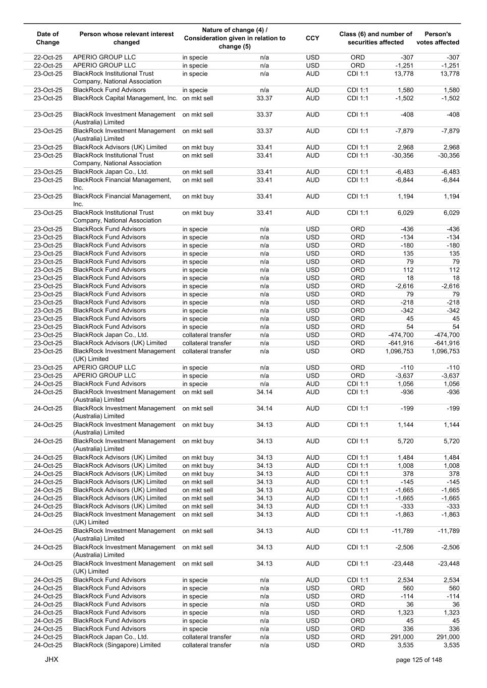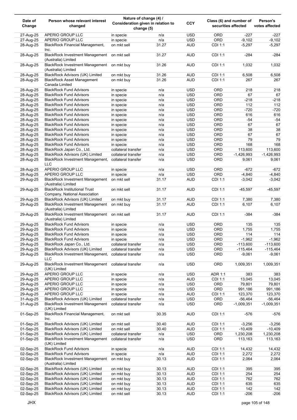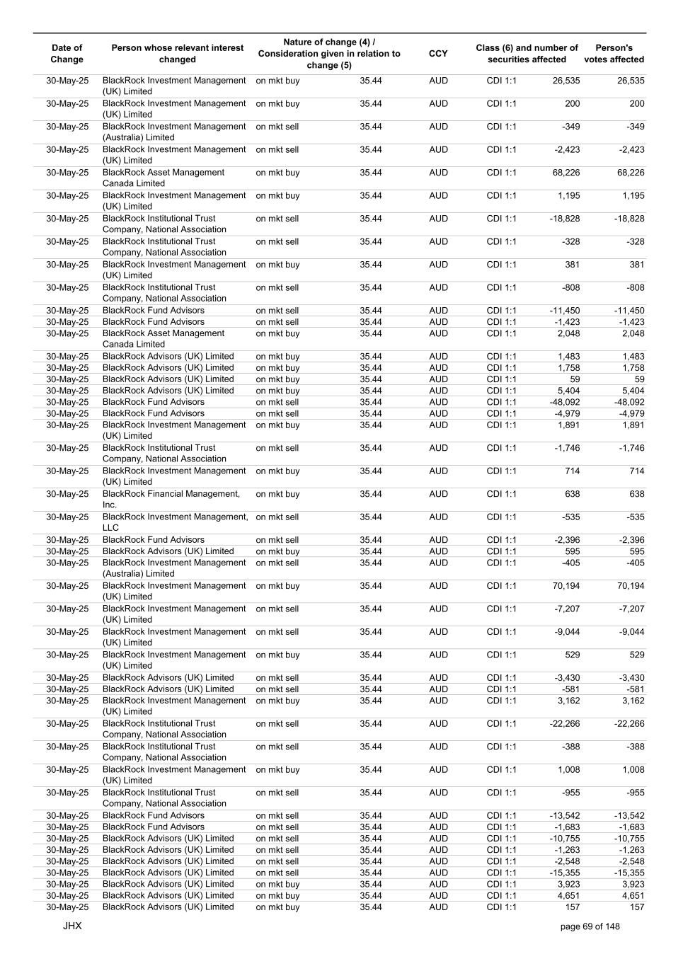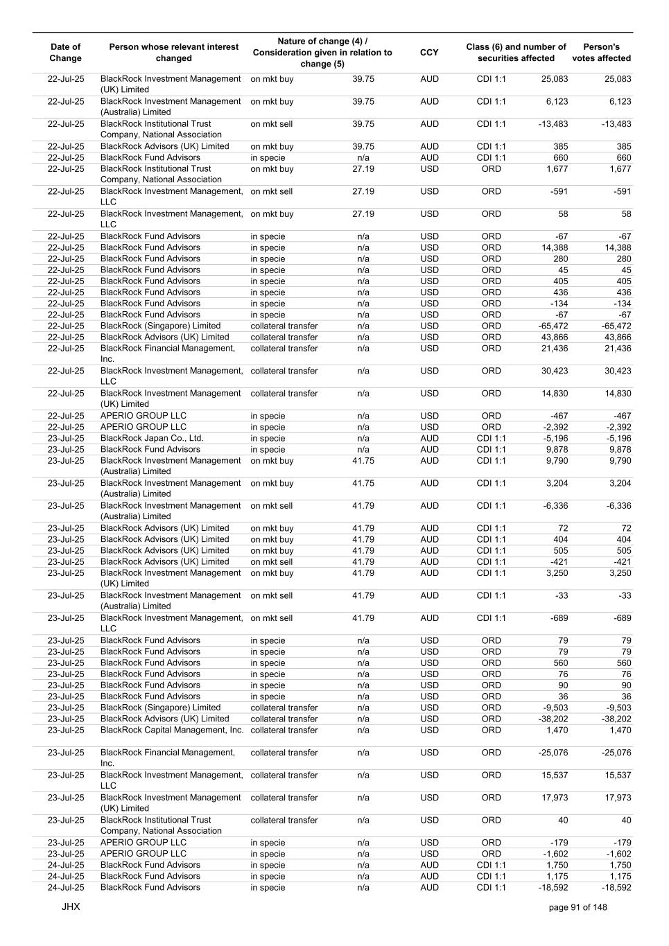 Date of Change Person whose relevant interest changed Nature of change (4) / Consideration given in relation to change (5) Class (6) and number of securities affected Person's votes affected CCY 13-Aug-25 BlackRock Investment Management (UK) Limited collateral transfer n/a USD ORD 56,819 56,819 13-Aug-25 BlackRock Asset Management North Asia Limited collateral transfer n/a USD ORD -8,725 -8,725 13-Aug-25 APERIO GROUP LLC in specie n/a USD ORD 16 16 13-Aug-25 APERIO GROUP LLC in specie n/a USD ORD 252 252 14-Aug-25 BlackRock Investment Management (UK) Limited on mkt buy 45.59 AUD CDI 1:1 2,176 2,176 14-Aug-25 BlackRock Japan Co., Ltd. on mkt buy 45.17 AUD CDI 1:1 656 656 14-Aug-25 BlackRock Capital Management, Inc. on mkt sell 45.65 AUD CDI 1:1 -872 -872 14-Aug-25 BlackRock Fund Advisors in specie n/a AUD CDI 1:1 2,064 2,064 14-Aug-25 BlackRock Investment Management (Australia) Limited on mkt buy 45.67 AUD CDI 1:1 1,728 1,728 14-Aug-25 BlackRock Advisors (UK) Limited on mkt buy 45.67 AUD CDI 1:1 89 89 14-Aug-25 BlackRock Financial Management, Inc. on mkt buy 45.67 AUD CDI 1:1 282 282 14-Aug-25 BlackRock Fund Advisors in specie n/a AUD CDI 1:1 -8,360 -8,360 14-Aug-25 BlackRock Fund Advisors in specie n/a USD ORD -218 -218 14-Aug-25 BlackRock Fund Advisors in specie n/a USD ORD 38 38 14-Aug-25 BlackRock Fund Advisors in specie n/a USD ORD 36 36 14-Aug-25 BlackRock Fund Advisors in specie n/a USD ORD 218 218 14-Aug-25 BlackRock Fund Advisors in specie n/a USD ORD 280 280 14-Aug-25 BlackRock Fund Advisors in specie n/a USD ORD -654 -654 14-Aug-25 BlackRock Fund Advisors in specie n/a USD ORD 79 79 14-Aug-25 BlackRock Fund Advisors in specie n/a USD ORD 135 135 14-Aug-25 BlackRock Fund Advisors in specie n/a USD ORD -18 -18 14-Aug-25 BlackRock Japan Co., Ltd. collateral transfer n/a USD ORD 63,800 63,800 14-Aug-25 BlackRock (Singapore) Limited collateral transfer n/a USD ORD -5,968 -5,968 14-Aug-25 BlackRock Advisors (UK) Limited collateral transfer n/a USD ORD 39,810 39,810 14-Aug-25 BlackRock Financial Management, Inc. collateral transfer n/a USD ORD -165,247 -165,247 14-Aug-25 BlackRock Investment Management, LLC collateral transfer n/a USD ORD -357 -357 14-Aug-25 BlackRock Investment Management (UK) Limited collateral transfer n/a USD ORD 115,124 115,124 14-Aug-25 APERIO GROUP LLC in specie n/a USD ORD 16 16 14-Aug-25 APERIO GROUP LLC in specie n/a USD ORD 5 5 15-Aug-25 BlackRock Fund Advisors in specie n/a AUD CDI 1:1 6,705 6,705 15-Aug-25 BlackRock Institutional Trust Company, National Association on mkt sell 45.59 AUD CDI 1:1 -466 -466 15-Aug-25 BlackRock Institutional Trust Company, National Association on mkt sell 45.59 AUD CDI 1:1 -81 -81 15-Aug-25 BlackRock Institutional Trust Company, National Association on mkt sell 45.59 AUD CDI 1:1 -78 -78 15-Aug-25 BlackRock Investment Management (Australia) Limited on mkt buy 45.60 AUD CDI 1:1 6,912 6,912 15-Aug-25 BlackRock Advisors (UK) Limited on mkt buy 45.60 AUD CDI 1:1 1,593 1,593 15-Aug-25 BlackRock Investment Management (UK) Limited on mkt sell 45.60 AUD CDI 1:1 -7,945 -7,945 15-Aug-25 BlackRock Investment Management (UK) Limited on mkt sell 45.60 AUD CDI 1:1 -3,434 -3,434 15-Aug-25 BlackRock Investment Management (Australia) Limited on mkt buy 45.60 AUD CDI 1:1 453 453 15-Aug-25 BlackRock Investment Management (Australia) Limited on mkt buy 45.60 AUD CDI 1:1 65 65 15-Aug-25 BlackRock Fund Advisors in specie n/a AUD CDI 1:1 1,104 1,104 15-Aug-25 BlackRock Financial Management, Inc. on mkt sell 29.01 USD ORD -561 -561 15-Aug-25 BlackRock Fund Advisors in specie n/a USD ORD 218 218 15-Aug-25 BlackRock Fund Advisors in specie n/a USD ORD -67 -67 15-Aug-25 BlackRock Fund Advisors in specie n/a USD ORD 18 18 15-Aug-25 BlackRock Fund Advisors in specie n/a USD ORD 79 79 15-Aug-25 BlackRock Fund Advisors in specie n/a USD ORD -168 -168 15-Aug-25 BlackRock Fund Advisors in specie n/a USD ORD -67 -67 15-Aug-25 BlackRock Fund Advisors in specie n/a USD ORD -67 -67 15-Aug-25 BlackRock Fund Advisors in specie n/a USD ORD 218 218 15-Aug-25 BlackRock Fund Advisors in specie n/a USD ORD 67 67 15-Aug-25 BlackRock Japan Co., Ltd. collateral transfer n/a USD ORD -66,975 -66,975 15-Aug-25 BlackRock Advisors (UK) Limited collateral transfer n/a USD ORD 207,841 207,841 15-Aug-25 BlackRock Investment Management (UK) Limited collateral transfer n/a USD ORD -227,378 -227,378 15-Aug-25 APERIO GROUP LLC in specie n/a USD ORD 303 303 JHX page 100 of 148