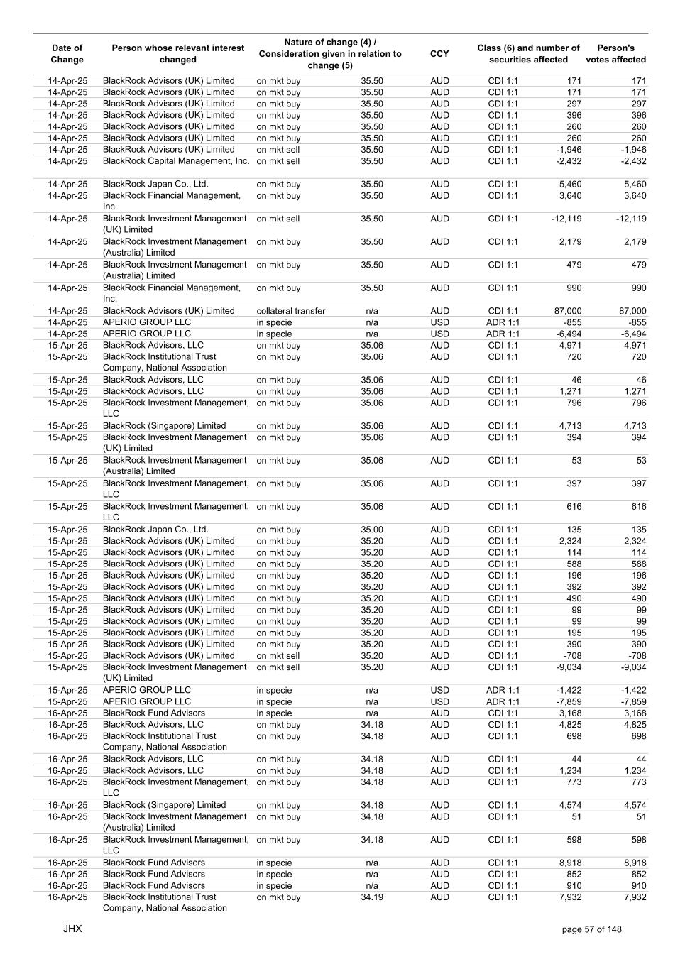 Date of Change Person whose relevant interest changed Nature of change (4) / Consideration given in relation to change (5) Class (6) and number of securities affected Person's votes affected CCY 08-Apr-25 BlackRock Advisors (UK) Limited on mkt buy 33.68 AUD CDI 1:1 2,348 2,348 08-Apr-25 BlackRock Advisors (UK) Limited on mkt sell 33.68 AUD CDI 1:1 -19 -19 08-Apr-25 BlackRock Advisors (UK) Limited on mkt sell 33.68 AUD CDI 1:1 -72 -72 08-Apr-25 BlackRock Advisors (UK) Limited on mkt buy 33.68 AUD CDI 1:1 285 285 08-Apr-25 BlackRock Advisors (UK) Limited on mkt buy 33.68 AUD CDI 1:1 263 263 08-Apr-25 BlackRock Advisors (UK) Limited on mkt sell 33.68 AUD CDI 1:1 -170 -170 08-Apr-25 BlackRock Advisors (UK) Limited on mkt buy 33.68 AUD CDI 1:1 98 98 08-Apr-25 BlackRock Advisors (UK) Limited on mkt sell 33.68 AUD CDI 1:1 -818 -818 08-Apr-25 BlackRock Advisors (UK) Limited on mkt sell 33.68 AUD CDI 1:1 -295 -295 08-Apr-25 BlackRock Advisors (UK) Limited on mkt sell 33.68 AUD CDI 1:1 -3,016 -3,016 08-Apr-25 BlackRock Advisors (UK) Limited on mkt buy 33.68 AUD CDI 1:1 1,350 1,350 08-Apr-25 BlackRock Investment Management (UK) Limited on mkt sell 33.68 AUD CDI 1:1 -90,647 -90,647 08-Apr-25 BlackRock Investment Management (UK) Limited on mkt buy 33.68 AUD CDI 1:1 604 604 08-Apr-25 BlackRock Investment Management, LLC on mkt buy 33.68 AUD CDI 1:1 756 756 08-Apr-25 APERIO GROUP LLC in specie n/a USD ADR 1:1 -1,096 -1,096 08-Apr-25 APERIO GROUP LLC in specie n/a USD ADR 1:1 -6,070 -6,070 09-Apr-25 BlackRock Fund Advisors in specie n/a AUD CDI 1:1 -6,357 -6,357 09-Apr-25 BlackRock Advisors, LLC on mkt buy 32.54 AUD CDI 1:1 968 968 09-Apr-25 BlackRock Institutional Trust Company, National Association on mkt buy 32.54 AUD CDI 1:1 1,299 1,299 09-Apr-25 BlackRock Advisors, LLC on mkt buy 32.54 AUD CDI 1:1 222 222 09-Apr-25 BlackRock Investment Management, LLC on mkt buy 32.54 AUD CDI 1:1 67 67 09-Apr-25 BlackRock (Singapore) Limited on mkt buy 32.54 AUD CDI 1:1 2,962 2,962 09-Apr-25 BlackRock Investment Management (Australia) Limited on mkt buy 32.54 AUD CDI 1:1 14 14 09-Apr-25 BlackRock Investment Management, LLC on mkt buy 32.54 AUD CDI 1:1 122 122 09-Apr-25 BlackRock Investment Management (Australia) Limited on mkt buy 32.23 AUD CDI 1:1 1,724 1,724 09-Apr-25 BlackRock Investment Management (Australia) Limited on mkt buy 32.23 AUD CDI 1:1 770 770 09-Apr-25 BlackRock Investment Management (Australia) Limited on mkt buy 32.23 AUD CDI 1:1 22,637 22,637 09-Apr-25 BlackRock Investment Management (Australia) Limited on mkt buy 32.23 AUD CDI 1:1 2,384 2,384 09-Apr-25 BlackRock Investment Management (Australia) Limited on mkt buy 32.23 AUD CDI 1:1 1,535 1,535 09-Apr-25 BlackRock Investment Management (UK) Limited on mkt sell 32.23 AUD CDI 1:1 -26,556 -26,556 09-Apr-25 BlackRock Advisors (UK) Limited on mkt buy 32.23 AUD CDI 1:1 36 36 09-Apr-25 BlackRock Advisors (UK) Limited on mkt sell 32.23 AUD CDI 1:1 -6,654 -6,654 09-Apr-25 BlackRock Advisors (UK) Limited on mkt buy 32.23 AUD CDI 1:1 285 285 09-Apr-25 BlackRock Advisors (UK) Limited on mkt buy 32.23 AUD CDI 1:1 263 263 09-Apr-25 BlackRock Advisors (UK) Limited on mkt buy 32.23 AUD CDI 1:1 294 294 09-Apr-25 BlackRock Advisors (UK) Limited on mkt buy 32.23 AUD CDI 1:1 2,254 2,254 09-Apr-25 BlackRock Advisors (UK) Limited on mkt sell 32.23 AUD CDI 1:1 -92 -92 09-Apr-25 BlackRock Advisors (UK) Limited on mkt buy 32.23 AUD CDI 1:1 80 80 09-Apr-25 BlackRock Advisors (UK) Limited on mkt buy 32.23 AUD CDI 1:1 196 196 09-Apr-25 BlackRock Advisors (UK) Limited on mkt buy 32.23 AUD CDI 1:1 196 196 09-Apr-25 BlackRock Advisors (UK) Limited on mkt buy 32.23 AUD CDI 1:1 195 195 09-Apr-25 BlackRock Advisors (UK) Limited on mkt sell 32.23 AUD CDI 1:1 -1,424 -1,424 09-Apr-25 BlackRock Institutional Trust Company, National Association on mkt sell 32.23 AUD CDI 1:1 -508 -508 09-Apr-25 BlackRock Institutional Trust Company, National Association on mkt sell 32.23 AUD CDI 1:1 -47,364 -47,364 09-Apr-25 BlackRock Investment Management (UK) Limited on mkt sell 32.23 AUD CDI 1:1 -15,145 -15,145 09-Apr-25 BlackRock Institutional Trust Company, National Association on mkt buy 32.23 AUD CDI 1:1 3,935 3,935 09-Apr-25 BlackRock Advisors (UK) Limited in specie n/a AUD CDI 1:1 -1,547 -1,547 09-Apr-25 APERIO GROUP LLC in specie n/a USD ADR 1:1 -2,029 -2,029 09-Apr-25 APERIO GROUP LLC in specie n/a USD ADR 1:1 -11,891 -11,891 09-Apr-25 APERIO GROUP LLC in specie n/a AUD CDI 1:1 -2,330 -2,330 10-Apr-25 BlackRock Fund Advisors in specie n/a AUD CDI 1:1 1,562 1,562 10-Apr-25 BlackRock Advisors, LLC on mkt buy 35.63 AUD CDI 1:1 970 970 10-Apr-25 BlackRock Institutional Trust Company, National Association on mkt buy 35.63 AUD CDI 1:1 1,302 1,302 10-Apr-25 BlackRock Advisors, LLC on mkt buy 35.63 AUD CDI 1:1 222 222 JHX page 55 of 148