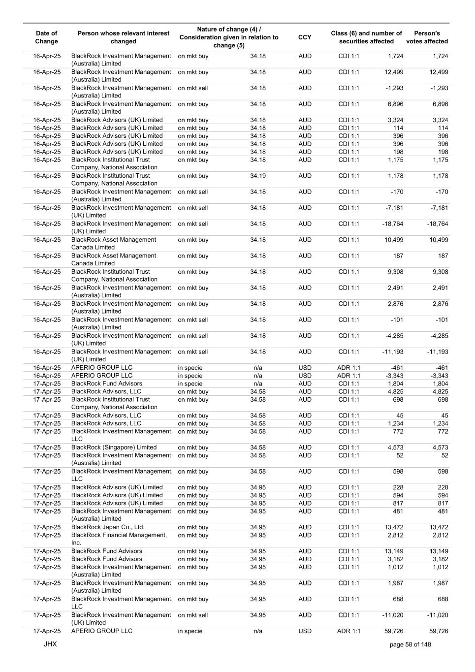 Date of Change Person whose relevant interest changed Nature of change (4) / Consideration given in relation to change (5) Class (6) and number of securities affected Person's votes affected CCY 02-Apr-25 BlackRock Institutional Trust Company, National Association on mkt buy 36.69 AUD CDI 1:1 2,991 2,991 02-Apr-25 BlackRock Investment Management (Australia) Limited on mkt buy 36.76 AUD CDI 1:1 8,227 8,227 02-Apr-25 BlackRock Investment Management (Australia) Limited on mkt buy 36.76 AUD CDI 1:1 1,395 1,395 02-Apr-25 BlackRock Investment Management (Australia) Limited on mkt buy 36.76 AUD CDI 1:1 1,269 1,269 02-Apr-25 BlackRock Investment Management (Australia) Limited on mkt sell 36.76 AUD CDI 1:1 -668 -668 02-Apr-25 BlackRock Investment Management (Australia) Limited on mkt sell 36.76 AUD CDI 1:1 -668 -668 02-Apr-25 BlackRock Investment Management (UK) Limited on mkt sell 36.76 AUD CDI 1:1 -24,283 -24,283 02-Apr-25 BlackRock Investment Management (Australia) Limited on mkt buy 36.76 AUD CDI 1:1 35,546 35,546 02-Apr-25 BlackRock Advisors (UK) Limited on mkt buy 36.76 AUD CDI 1:1 1,195 1,195 02-Apr-25 BlackRock Investment Management (Australia) Limited on mkt buy 36.76 AUD CDI 1:1 13,401 13,401 02-Apr-25 BlackRock Investment Management (Australia) Limited on mkt buy 36.76 AUD CDI 1:1 1,658 1,658 02-Apr-25 BlackRock Investment Management (UK) Limited on mkt sell 36.76 AUD CDI 1:1 -29,442 -29,442 02-Apr-25 BlackRock Advisors (UK) Limited on mkt buy 36.76 AUD CDI 1:1 224 224 02-Apr-25 BlackRock Investment Management (UK) Limited on mkt buy 36.76 AUD CDI 1:1 1,925 1,925 02-Apr-25 BlackRock Investment Management (UK) Limited on mkt sell 36.76 AUD CDI 1:1 -3,724 -3,724 02-Apr-25 BlackRock Investment Management (UK) Limited on mkt sell 36.76 AUD CDI 1:1 -4,516 -4,516 02-Apr-25 BlackRock Institutional Trust Company, National Association on mkt buy 36.76 AUD CDI 1:1 24 24 02-Apr-25 APERIO GROUP LLC in specie n/a USD ADR 1:1 -199 -199 02-Apr-25 APERIO GROUP LLC in specie n/a USD ADR 1:1 -6,035 -6,035 03-Apr-25 BlackRock Advisors (UK) Limited on mkt buy 37.77 AUD CDI 1:1 1,161 1,161 03-Apr-25 BlackRock Advisors (UK) Limited on mkt buy 37.77 AUD CDI 1:1 285 285 03-Apr-25 BlackRock Advisors (UK) Limited on mkt buy 37.77 AUD CDI 1:1 594 594 03-Apr-25 BlackRock Advisors (UK) Limited on mkt buy 37.77 AUD CDI 1:1 89 89 03-Apr-25 BlackRock Capital Management, Inc. on mkt buy 37.77 AUD CDI 1:1 6,560 6,560 03-Apr-25 BlackRock Investment Management, LLC on mkt buy 37.77 AUD CDI 1:1 1,680 1,680 03-Apr-25 BlackRock Financial Management, Inc. on mkt sell 37.77 AUD CDI 1:1 -495 -495 03-Apr-25 BlackRock Investment Management (Australia) Limited on mkt buy 37.77 AUD CDI 1:1 5,290 5,290 03-Apr-25 BlackRock Investment Management (Australia) Limited on mkt buy 37.77 AUD CDI 1:1 2,459 2,459 03-Apr-25 BlackRock Investment Management (Australia) Limited on mkt buy 37.77 AUD CDI 1:1 37,709 37,709 03-Apr-25 APERIO GROUP LLC in specie n/a USD ADR 1:1 -3,700 -3,700 03-Apr-25 APERIO GROUP LLC in specie n/a USD ADR 1:1 -3,059 -3,059 04-Apr-25 BlackRock Investment Management (UK) Limited on mkt buy 35.17 AUD CDI 1:1 71 71 04-Apr-25 BlackRock Investment Management, LLC on mkt buy 35.17 AUD CDI 1:1 76 76 04-Apr-25 BlackRock Investment Management (UK) Limited on mkt buy 35.92 AUD CDI 1:1 15,109 15,109 04-Apr-25 BlackRock Fund Advisors in specie n/a AUD CDI 1:1 7,080 7,080 04-Apr-25 BlackRock Fund Advisors in specie n/a AUD CDI 1:1 -12,600 -12,600 04-Apr-25 BlackRock Fund Advisors in specie n/a AUD CDI 1:1 3,360 3,360 04-Apr-25 BlackRock Institutional Trust Company, National Association on mkt sell 34.87 AUD CDI 1:1 -1,424 -1,424 04-Apr-25 BlackRock Institutional Trust Company, National Association on mkt sell 34.87 AUD CDI 1:1 -115 -115 04-Apr-25 BlackRock Institutional Trust Company, National Association on mkt sell 34.87 AUD CDI 1:1 -112 -112 04-Apr-25 BlackRock Investment Management (Australia) Limited on mkt buy 34.84 AUD CDI 1:1 3,480 3,480 04-Apr-25 BlackRock Advisors (UK) Limited on mkt buy 34.84 AUD CDI 1:1 3,483 3,483 04-Apr-25 BlackRock Advisors (UK) Limited on mkt buy 34.84 AUD CDI 1:1 19 19 04-Apr-25 BlackRock Advisors (UK) Limited on mkt buy 34.84 AUD CDI 1:1 4,436 4,436 04-Apr-25 BlackRock Advisors (UK) Limited on mkt buy 34.84 AUD CDI 1:1 5,545 5,545 JHX page 53 of 148