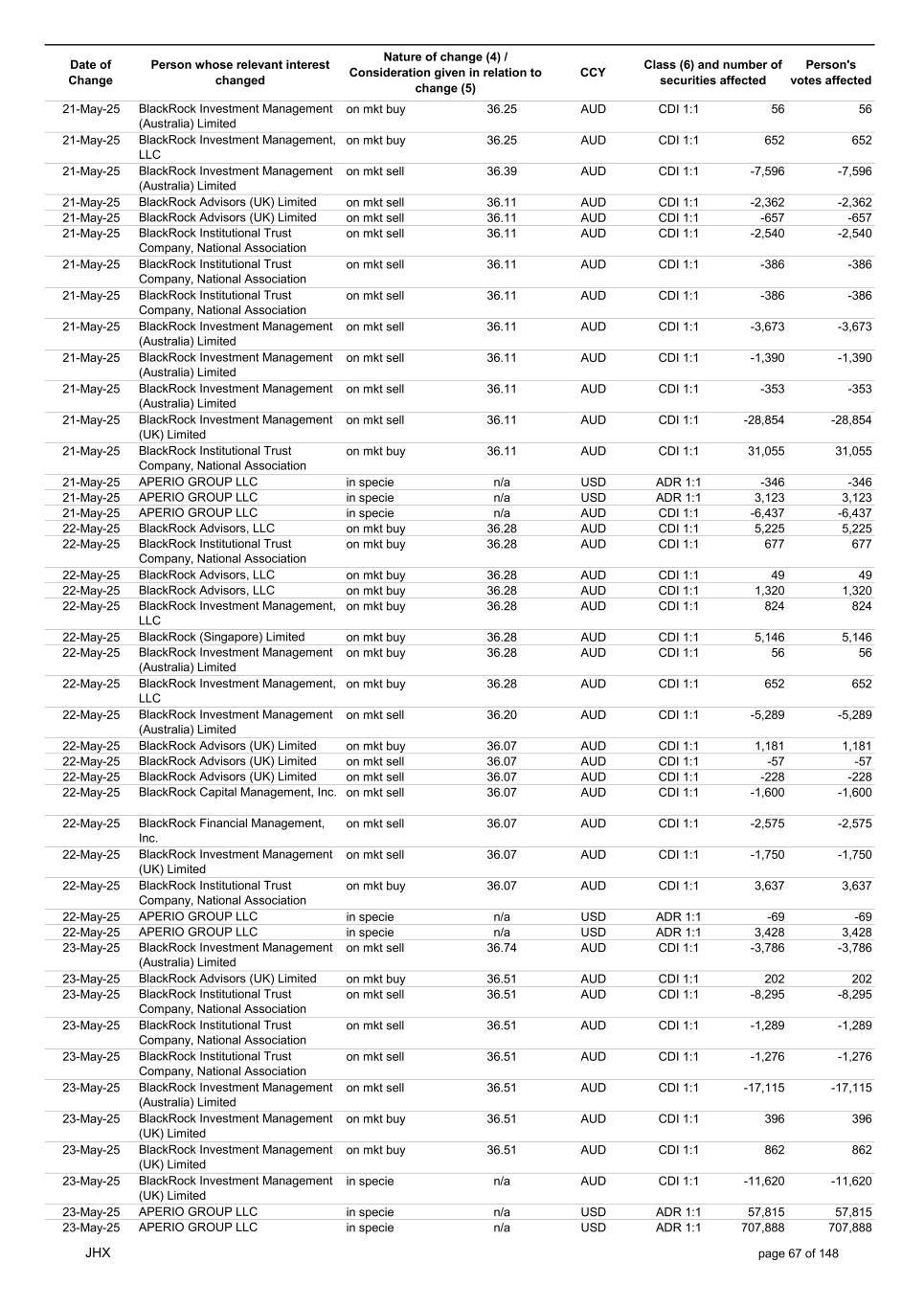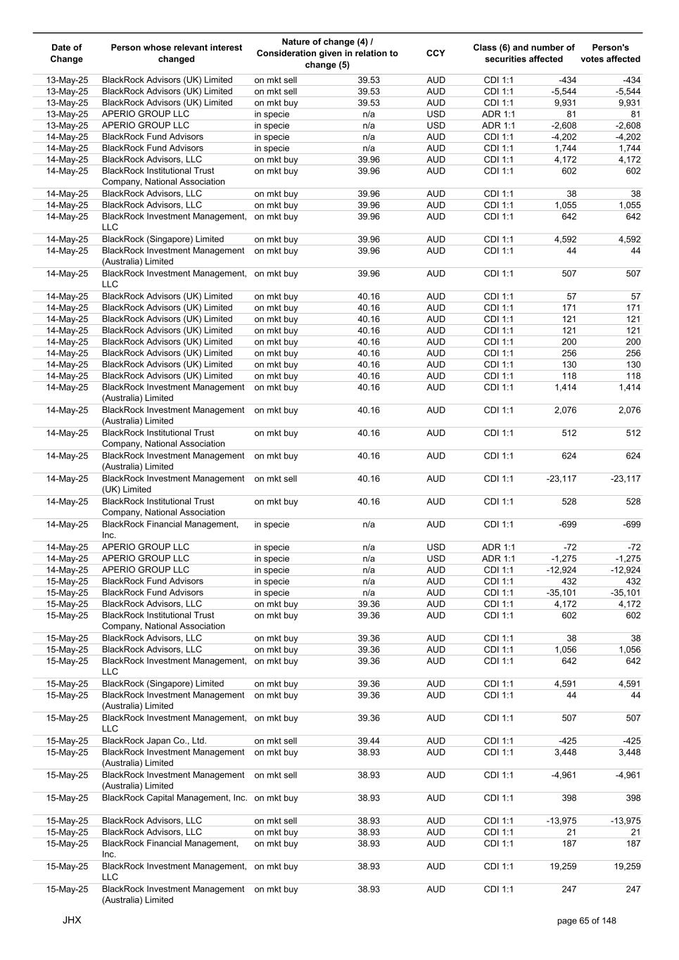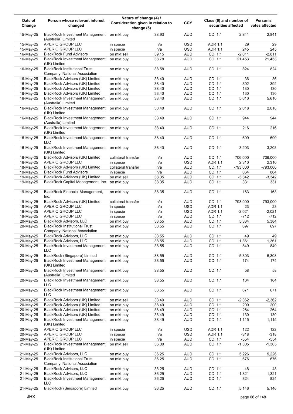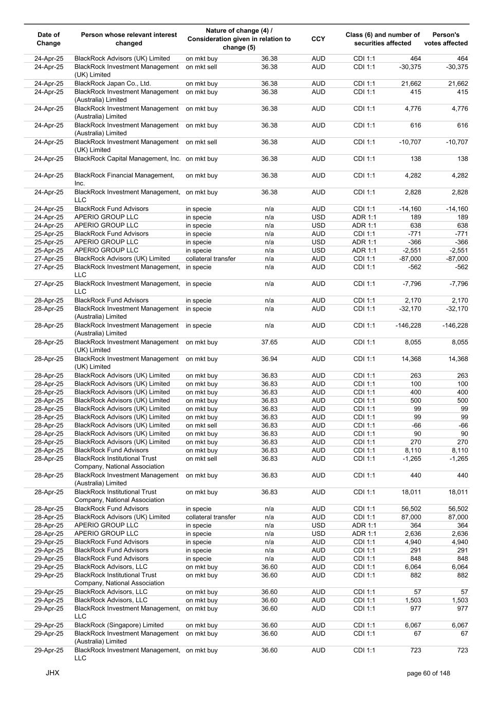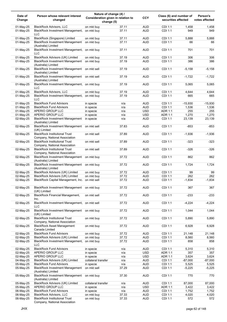 Date of Change Person whose relevant interest changed Nature of change (4) / Consideration given in relation to change (5) Class (6) and number of securities affected Person's votes affected CCY 29-Apr-25 BlackRock Advisors (UK) Limited on mkt buy 36.57 AUD CDI 1:1 396 396 29-Apr-25 BlackRock Advisors (UK) Limited on mkt sell 36.57 AUD CDI 1:1 -464 -464 29-Apr-25 BlackRock Advisors, LLC on mkt sell 36.57 AUD CDI 1:1 -12,465 -12,465 29-Apr-25 BlackRock Institutional Trust Company, National Association on mkt buy 36.57 AUD CDI 1:1 5,539 5,539 29-Apr-25 APERIO GROUP LLC in specie n/a USD ADR 1:1 2,359 2,359 30-Apr-25 BlackRock Advisors, LLC on mkt buy 36.95 AUD CDI 1:1 5,885 5,885 30-Apr-25 BlackRock Institutional Trust Company, National Association on mkt buy 36.95 AUD CDI 1:1 855 855 30-Apr-25 BlackRock Advisors, LLC on mkt buy 36.95 AUD CDI 1:1 56 56 30-Apr-25 BlackRock Advisors, LLC on mkt buy 36.95 AUD CDI 1:1 1,459 1,459 30-Apr-25 BlackRock Investment Management, LLC on mkt buy 36.95 AUD CDI 1:1 949 949 30-Apr-25 BlackRock (Singapore) Limited on mkt buy 36.95 AUD CDI 1:1 5,888 5,888 30-Apr-25 BlackRock Investment Management (Australia) Limited on mkt buy 36.95 AUD CDI 1:1 65 65 30-Apr-25 BlackRock Investment Management, LLC on mkt buy 36.95 AUD CDI 1:1 701 701 30-Apr-25 BlackRock Investment Management (UK) Limited on mkt buy 36.93 AUD CDI 1:1 15,393 15,393 30-Apr-25 BlackRock Investment Management (UK) Limited on mkt sell 36.88 AUD CDI 1:1 -526 -526 30-Apr-25 BlackRock Fund Advisors in specie n/a AUD CDI 1:1 1,261 1,261 30-Apr-25 BlackRock Fund Advisors in specie n/a AUD CDI 1:1 19,000 19,000 30-Apr-25 BlackRock Institutional Trust Company, National Association on mkt sell 36.97 AUD CDI 1:1 -5,421 -5,421 30-Apr-25 BlackRock Institutional Trust Company, National Association on mkt sell 36.97 AUD CDI 1:1 -561 -561 30-Apr-25 BlackRock Institutional Trust Company, National Association on mkt sell 36.97 AUD CDI 1:1 -551 -551 30-Apr-25 BlackRock Institutional Trust Company, National Association on mkt buy 36.98 AUD CDI 1:1 91,062 91,062 30-Apr-25 BlackRock Institutional Trust Company, National Association on mkt buy 36.98 AUD CDI 1:1 49,851 49,851 30-Apr-25 BlackRock Investment Management (UK) Limited on mkt buy 36.98 AUD CDI 1:1 25,935 25,935 30-Apr-25 BlackRock Asset Management Canada Limited on mkt buy 36.98 AUD CDI 1:1 19,736 19,736 30-Apr-25 BlackRock Investment Management (UK) Limited on mkt buy 36.98 AUD CDI 1:1 538 538 30-Apr-25 BlackRock Asset Management Canada Limited on mkt buy 36.98 AUD CDI 1:1 573 573 30-Apr-25 BlackRock Advisors (UK) Limited on mkt buy 36.98 AUD CDI 1:1 3,623 3,623 30-Apr-25 BlackRock Investment Management (UK) Limited on mkt buy 36.98 AUD CDI 1:1 3,303 3,303 30-Apr-25 BlackRock Investment Management (Australia) Limited on mkt buy 37.00 AUD CDI 1:1 770 770 30-Apr-25 BlackRock Investment Management (Australia) Limited on mkt buy 37.00 AUD CDI 1:1 4,310 4,310 30-Apr-25 BlackRock Advisors (UK) Limited on mkt buy 37.00 AUD CDI 1:1 168 168 30-Apr-25 BlackRock Advisors (UK) Limited on mkt buy 37.00 AUD CDI 1:1 396 396 30-Apr-25 BlackRock Investment Management (Australia) Limited on mkt sell 37.00 AUD CDI 1:1 -13,240 -13,240 30-Apr-25 BlackRock Investment Management (Australia) Limited on mkt sell 37.00 AUD CDI 1:1 -568 -568 30-Apr-25 BlackRock Fund Advisors on mkt sell 37.00 AUD CDI 1:1 -4,014 -4,014 30-Apr-25 BlackRock Capital Management, Inc. on mkt sell 37.00 AUD CDI 1:1 -1,960 -1,960 30-Apr-25 BlackRock Institutional Trust Company, National Association on mkt sell 37.00 AUD CDI 1:1 -3,820 -3,820 30-Apr-25 BlackRock Financial Management, Inc. on mkt sell 37.00 AUD CDI 1:1 -1,287 -1,287 30-Apr-25 BlackRock Advisors (UK) Limited on mkt sell 37.00 AUD CDI 1:1 -9,207 -9,207 30-Apr-25 BlackRock Investment Management (Australia) Limited on mkt sell 37.00 AUD CDI 1:1 -5,580 -5,580 30-Apr-25 BlackRock Investment Management (Australia) Limited in specie n/a AUD CDI 1:1 -17,329 -17,329 30-Apr-25 APERIO GROUP LLC in specie n/a USD ADR 1:1 -35 -35 30-Apr-25 APERIO GROUP LLC in specie n/a USD ADR 1:1 1,070 1,070 01-May-25 BlackRock Advisors, LLC on mkt buy 37.11 AUD CDI 1:1 5,886 5,886 01-May-25 BlackRock Institutional Trust Company, National Association on mkt buy 37.11 AUD CDI 1:1 855 855 01-May-25 BlackRock Advisors, LLC on mkt buy 37.11 AUD CDI 1:1 55 55 JHX page 61 of 148