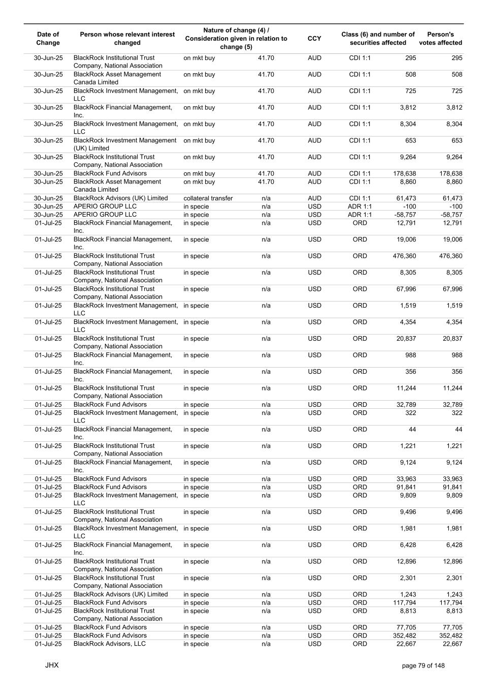 Date of Change Person whose relevant interest changed Nature of change (4) / Consideration given in relation to change (5) Class (6) and number of securities affected Person's votes affected CCY 30-Jun-25 BlackRock Institutional Trust Company, National Association on mkt buy 41.70 AUD CDI 1:1 295 295 30-Jun-25 BlackRock Asset Management Canada Limited on mkt buy 41.70 AUD CDI 1:1 508 508 30-Jun-25 BlackRock Investment Management, LLC on mkt buy 41.70 AUD CDI 1:1 725 725 30-Jun-25 BlackRock Financial Management, Inc. on mkt buy 41.70 AUD CDI 1:1 3,812 3,812 30-Jun-25 BlackRock Investment Management, LLC on mkt buy 41.70 AUD CDI 1:1 8,304 8,304 30-Jun-25 BlackRock Investment Management (UK) Limited on mkt buy 41.70 AUD CDI 1:1 653 653 30-Jun-25 BlackRock Institutional Trust Company, National Association on mkt buy 41.70 AUD CDI 1:1 9,264 9,264 30-Jun-25 BlackRock Fund Advisors on mkt buy 41.70 AUD CDI 1:1 178,638 178,638 30-Jun-25 BlackRock Asset Management Canada Limited on mkt buy 41.70 AUD CDI 1:1 8,860 8,860 30-Jun-25 BlackRock Advisors (UK) Limited collateral transfer n/a AUD CDI 1:1 61,473 61,473 30-Jun-25 APERIO GROUP LLC in specie n/a USD ADR 1:1 -100 -100 30-Jun-25 APERIO GROUP LLC in specie n/a USD ADR 1:1 -58,757 -58,757 01-Jul-25 BlackRock Financial Management, Inc. in specie n/a USD ORD 12,791 12,791 01-Jul-25 BlackRock Financial Management, Inc. in specie n/a USD ORD 19,006 19,006 01-Jul-25 BlackRock Institutional Trust Company, National Association in specie n/a USD ORD 476,360 476,360 01-Jul-25 BlackRock Institutional Trust Company, National Association in specie n/a USD ORD 8,305 8,305 01-Jul-25 BlackRock Institutional Trust Company, National Association in specie n/a USD ORD 67,996 67,996 01-Jul-25 BlackRock Investment Management, LLC in specie n/a USD ORD 1,519 1,519 01-Jul-25 BlackRock Investment Management, LLC in specie n/a USD ORD 4,354 4,354 01-Jul-25 BlackRock Institutional Trust Company, National Association in specie n/a USD ORD 20,837 20,837 01-Jul-25 BlackRock Financial Management, Inc. in specie n/a USD ORD 988 988 01-Jul-25 BlackRock Financial Management, Inc. in specie n/a USD ORD 356 356 01-Jul-25 BlackRock Institutional Trust Company, National Association in specie n/a USD ORD 11,244 11,244 01-Jul-25 BlackRock Fund Advisors in specie n/a USD ORD 32,789 32,789 01-Jul-25 BlackRock Investment Management, LLC in specie n/a USD ORD 322 322 01-Jul-25 BlackRock Financial Management, Inc. in specie n/a USD ORD 44 44 01-Jul-25 BlackRock Institutional Trust Company, National Association in specie n/a USD ORD 1,221 1,221 01-Jul-25 BlackRock Financial Management, Inc. in specie n/a USD ORD 9,124 9,124 01-Jul-25 BlackRock Fund Advisors in specie n/a USD ORD 33,963 33,963 01-Jul-25 BlackRock Fund Advisors in specie n/a USD ORD 91,841 91,841 01-Jul-25 BlackRock Investment Management, LLC in specie n/a USD ORD 9,809 9,809 01-Jul-25 BlackRock Institutional Trust Company, National Association in specie n/a USD ORD 9,496 9,496 01-Jul-25 BlackRock Investment Management, LLC in specie n/a USD ORD 1,981 1,981 01-Jul-25 BlackRock Financial Management, Inc. in specie n/a USD ORD 6,428 6,428 01-Jul-25 BlackRock Institutional Trust Company, National Association in specie n/a USD ORD 12,896 12,896 01-Jul-25 BlackRock Institutional Trust Company, National Association in specie n/a USD ORD 2,301 2,301 01-Jul-25 BlackRock Advisors (UK) Limited in specie n/a USD ORD 1,243 1,243 01-Jul-25 BlackRock Fund Advisors in specie n/a USD ORD 117,794 117,794 01-Jul-25 BlackRock Institutional Trust Company, National Association in specie n/a USD ORD 8,813 8,813 01-Jul-25 BlackRock Fund Advisors in specie n/a USD ORD 77,705 77,705 01-Jul-25 BlackRock Fund Advisors in specie n/a USD ORD 352,482 352,482 01-Jul-25 BlackRock Advisors, LLC in specie n/a USD ORD 22,667 22,667 JHX page 79 of 148