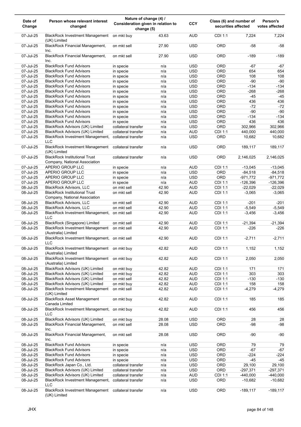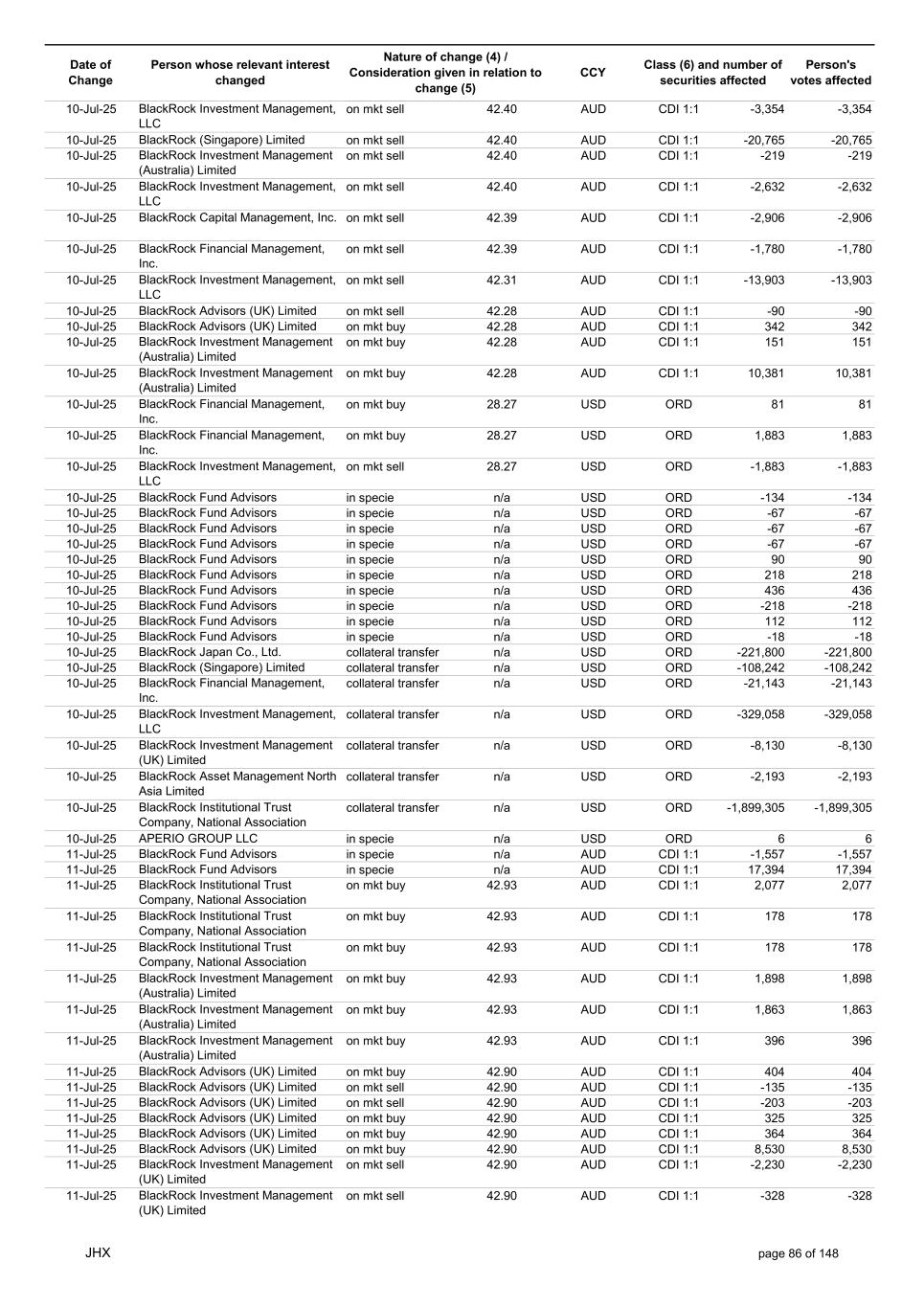 Date of Change Person whose relevant interest changed Nature of change (4) / Consideration given in relation to change (5) Class (6) and number of securities affected Person's votes affected CCY 10-Jul-25 BlackRock Investment Management, LLC on mkt sell 42.40 AUD CDI 1:1 -3,354 -3,354 10-Jul-25 BlackRock (Singapore) Limited on mkt sell 42.40 AUD CDI 1:1 -20,765 -20,765 10-Jul-25 BlackRock Investment Management (Australia) Limited on mkt sell 42.40 AUD CDI 1:1 -219 -219 10-Jul-25 BlackRock Investment Management, LLC on mkt sell 42.40 AUD CDI 1:1 -2,632 -2,632 10-Jul-25 BlackRock Capital Management, Inc. on mkt sell 42.39 AUD CDI 1:1 -2,906 -2,906 10-Jul-25 BlackRock Financial Management, Inc. on mkt sell 42.39 AUD CDI 1:1 -1,780 -1,780 10-Jul-25 BlackRock Investment Management, LLC on mkt sell 42.31 AUD CDI 1:1 -13,903 -13,903 10-Jul-25 BlackRock Advisors (UK) Limited on mkt sell 42.28 AUD CDI 1:1 -90 -90 10-Jul-25 BlackRock Advisors (UK) Limited on mkt buy 42.28 AUD CDI 1:1 342 342 10-Jul-25 BlackRock Investment Management (Australia) Limited on mkt buy 42.28 AUD CDI 1:1 151 151 10-Jul-25 BlackRock Investment Management (Australia) Limited on mkt buy 42.28 AUD CDI 1:1 10,381 10,381 10-Jul-25 BlackRock Financial Management, Inc. on mkt buy 28.27 USD ORD 81 81 10-Jul-25 BlackRock Financial Management, Inc. on mkt buy 28.27 USD ORD 1,883 1,883 10-Jul-25 BlackRock Investment Management, LLC on mkt sell 28.27 USD ORD -1,883 -1,883 10-Jul-25 BlackRock Fund Advisors in specie n/a USD ORD -134 -134 10-Jul-25 BlackRock Fund Advisors in specie n/a USD ORD -67 -67 10-Jul-25 BlackRock Fund Advisors in specie n/a USD ORD -67 -67 10-Jul-25 BlackRock Fund Advisors in specie n/a USD ORD -67 -67 10-Jul-25 BlackRock Fund Advisors in specie n/a USD ORD 90 90 10-Jul-25 BlackRock Fund Advisors in specie n/a USD ORD 218 218 10-Jul-25 BlackRock Fund Advisors in specie n/a USD ORD 436 436 10-Jul-25 BlackRock Fund Advisors in specie n/a USD ORD -218 -218 10-Jul-25 BlackRock Fund Advisors in specie n/a USD ORD 112 112 10-Jul-25 BlackRock Fund Advisors in specie n/a USD ORD -18 -18 10-Jul-25 BlackRock Japan Co., Ltd. collateral transfer n/a USD ORD -221,800 -221,800 10-Jul-25 BlackRock (Singapore) Limited collateral transfer n/a USD ORD -108,242 -108,242 10-Jul-25 BlackRock Financial Management, Inc. collateral transfer n/a USD ORD -21,143 -21,143 10-Jul-25 BlackRock Investment Management, LLC collateral transfer n/a USD ORD -329,058 -329,058 10-Jul-25 BlackRock Investment Management (UK) Limited collateral transfer n/a USD ORD -8,130 -8,130 10-Jul-25 BlackRock Asset Management North Asia Limited collateral transfer n/a USD ORD -2,193 -2,193 10-Jul-25 BlackRock Institutional Trust Company, National Association collateral transfer n/a USD ORD -1,899,305 -1,899,305 10-Jul-25 APERIO GROUP LLC in specie n/a USD ORD 6 6 11-Jul-25 BlackRock Fund Advisors in specie n/a AUD CDI 1:1 -1,557 -1,557 11-Jul-25 BlackRock Fund Advisors in specie n/a AUD CDI 1:1 17,394 17,394 11-Jul-25 BlackRock Institutional Trust Company, National Association on mkt buy 42.93 AUD CDI 1:1 2,077 2,077 11-Jul-25 BlackRock Institutional Trust Company, National Association on mkt buy 42.93 AUD CDI 1:1 178 178 11-Jul-25 BlackRock Institutional Trust Company, National Association on mkt buy 42.93 AUD CDI 1:1 178 178 11-Jul-25 BlackRock Investment Management (Australia) Limited on mkt buy 42.93 AUD CDI 1:1 1,898 1,898 11-Jul-25 BlackRock Investment Management (Australia) Limited on mkt buy 42.93 AUD CDI 1:1 1,863 1,863 11-Jul-25 BlackRock Investment Management (Australia) Limited on mkt buy 42.93 AUD CDI 1:1 396 396 11-Jul-25 BlackRock Advisors (UK) Limited on mkt buy 42.90 AUD CDI 1:1 404 404 11-Jul-25 BlackRock Advisors (UK) Limited on mkt sell 42.90 AUD CDI 1:1 -135 -135 11-Jul-25 BlackRock Advisors (UK) Limited on mkt sell 42.90 AUD CDI 1:1 -203 -203 11-Jul-25 BlackRock Advisors (UK) Limited on mkt buy 42.90 AUD CDI 1:1 325 325 11-Jul-25 BlackRock Advisors (UK) Limited on mkt buy 42.90 AUD CDI 1:1 364 364 11-Jul-25 BlackRock Advisors (UK) Limited on mkt buy 42.90 AUD CDI 1:1 8,530 8,530 11-Jul-25 BlackRock Investment Management (UK) Limited on mkt sell 42.90 AUD CDI 1:1 -2,230 -2,230 11-Jul-25 BlackRock Investment Management (UK) Limited on mkt sell 42.90 AUD CDI 1:1 -328 -328 JHX page 86 of 148