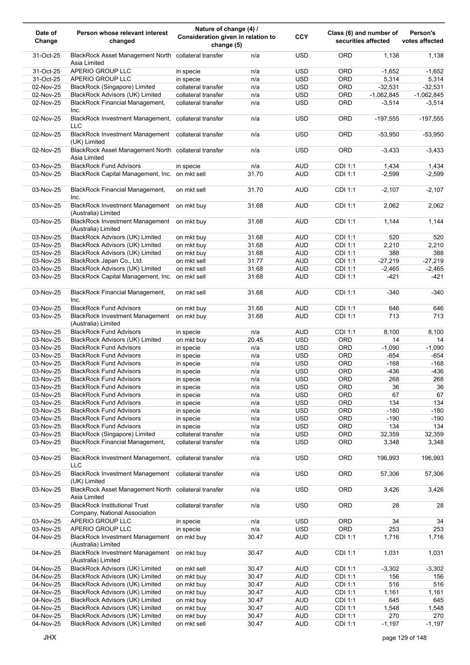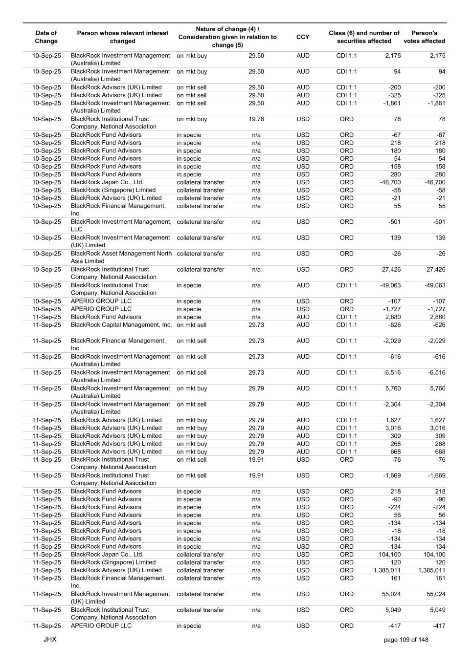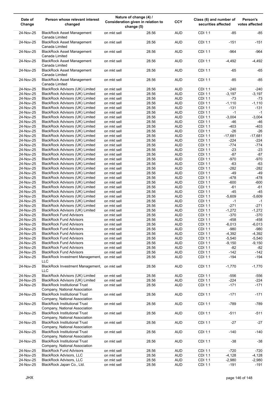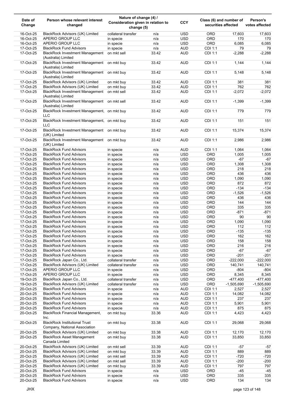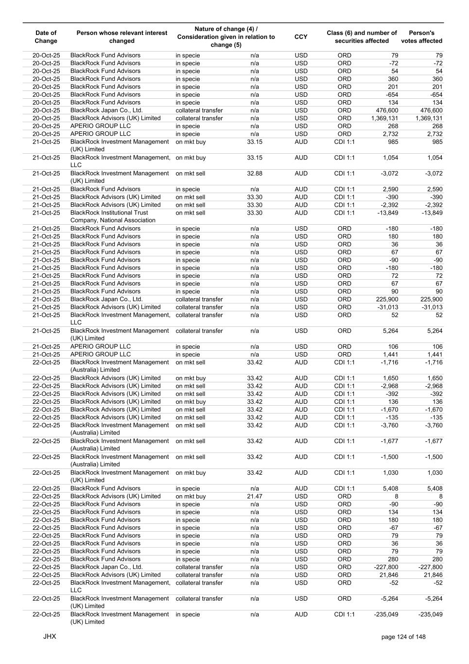 Date of Change Person whose relevant interest changed Nature of change (4) / Consideration given in relation to change (5) Class (6) and number of securities affected Person's votes affected CCY 05-Nov-25 BlackRock Investment Management (UK) Limited collateral transfer n/a USD ORD -56,454 -56,454 05-Nov-25 BlackRock Asset Management North Asia Limited collateral transfer n/a USD ORD 141,451 141,451 05-Nov-25 APERIO GROUP LLC in specie n/a USD ORD 421 421 05-Nov-25 APERIO GROUP LLC in specie n/a USD ORD 4,056 4,056 06-Nov-25 BlackRock Advisors (UK) Limited on mkt buy 25.75 AUD CDI 1:1 78 78 06-Nov-25 BlackRock Advisors (UK) Limited on mkt buy 25.75 AUD CDI 1:1 1,320 1,320 06-Nov-25 BlackRock Advisors (UK) Limited on mkt sell 25.75 AUD CDI 1:1 -668 -668 06-Nov-25 BlackRock Japan Co., Ltd. on mkt sell 25.75 AUD CDI 1:1 -1,164 -1,164 06-Nov-25 BlackRock Japan Co., Ltd. on mkt sell 25.75 AUD CDI 1:1 -2,813 -2,813 06-Nov-25 BlackRock Financial Management, Inc. on mkt buy 25.75 AUD CDI 1:1 733 733 06-Nov-25 BlackRock Financial Management, Inc. on mkt buy 25.75 AUD CDI 1:1 447 447 06-Nov-25 BlackRock Investment Management (UK) Limited on mkt buy 25.75 AUD CDI 1:1 738 738 06-Nov-25 BlackRock Investment Management (Australia) Limited on mkt buy 25.75 AUD CDI 1:1 1,406 1,406 06-Nov-25 BlackRock Investment Management (Australia) Limited on mkt buy 25.75 AUD CDI 1:1 3,733 3,733 06-Nov-25 BlackRock Investment Management (Australia) Limited on mkt buy 25.75 AUD CDI 1:1 6,132 6,132 06-Nov-25 BlackRock Advisors, LLC on mkt sell 17.34 USD ORD -10 -10 06-Nov-25 BlackRock Institutional Trust Company, National Association on mkt buy 17.34 USD ORD 1,653 1,653 06-Nov-25 BlackRock Financial Management, Inc. on mkt buy 17.34 USD ORD 969 969 06-Nov-25 BlackRock Financial Management, Inc. on mkt buy 17.34 USD ORD 921 921 06-Nov-25 BlackRock Fund Advisors in specie n/a USD ORD 54 54 06-Nov-25 BlackRock Fund Advisors in specie n/a USD ORD -67 -67 06-Nov-25 BlackRock Fund Advisors in specie n/a USD ORD -218 -218 06-Nov-25 BlackRock Fund Advisors in specie n/a USD ORD 36 36 06-Nov-25 BlackRock Fund Advisors in specie n/a USD ORD 79 79 06-Nov-25 BlackRock Fund Advisors in specie n/a USD ORD 54 54 06-Nov-25 BlackRock Fund Advisors in specie n/a USD ORD -76 -76 06-Nov-25 BlackRock Fund Advisors in specie n/a USD ORD 79 79 06-Nov-25 BlackRock Japan Co., Ltd. collateral transfer n/a USD ORD -429,400 -429,400 06-Nov-25 BlackRock (Singapore) Limited collateral transfer n/a USD ORD -107,727 -107,727 06-Nov-25 BlackRock Advisors (UK) Limited collateral transfer n/a USD ORD 1,160,015 1,160,015 06-Nov-25 BlackRock Financial Management, Inc. collateral transfer n/a USD ORD -14,126 -14,126 06-Nov-25 BlackRock Investment Management, LLC collateral transfer n/a USD ORD -457,167 -457,167 06-Nov-25 BlackRock Investment Management (UK) Limited collateral transfer n/a USD ORD -721,345 -721,345 06-Nov-25 BlackRock Asset Management North Asia Limited collateral transfer n/a USD ORD -145,536 -145,536 06-Nov-25 BlackRock Institutional Trust Company, National Association collateral transfer n/a USD ORD 70,767 70,767 06-Nov-25 APERIO GROUP LLC in specie n/a USD ORD -106 -106 06-Nov-25 APERIO GROUP LLC in specie n/a USD ORD -1,565 -1,565 07-Nov-25 BlackRock Fund Advisors in specie n/a AUD CDI 1:1 8,100 8,100 07-Nov-25 BlackRock Investment Management (Australia) Limited on mkt buy 26.11 AUD CDI 1:1 10,321 10,321 07-Nov-25 BlackRock Investment Management (Australia) Limited on mkt buy 26.11 AUD CDI 1:1 6,345 6,345 07-Nov-25 BlackRock Investment Management (Australia) Limited on mkt buy 26.11 AUD CDI 1:1 1,805 1,805 07-Nov-25 BlackRock Advisors (UK) Limited on mkt buy 26.12 AUD CDI 1:1 2,984 2,984 07-Nov-25 BlackRock Advisors (UK) Limited on mkt buy 26.12 AUD CDI 1:1 1,566 1,566 07-Nov-25 BlackRock Advisors (UK) Limited on mkt buy 26.12 AUD CDI 1:1 910 910 07-Nov-25 BlackRock Advisors (UK) Limited on mkt sell 26.12 AUD CDI 1:1 -639 -639 07-Nov-25 BlackRock Advisors (UK) Limited on mkt sell 26.12 AUD CDI 1:1 -1,675 -1,675 07-Nov-25 BlackRock Advisors (UK) Limited on mkt sell 26.12 AUD CDI 1:1 -1,005 -1,005 07-Nov-25 BlackRock Advisors (UK) Limited on mkt sell 26.12 AUD CDI 1:1 -327 -327 07-Nov-25 BlackRock Investment Management (Australia) Limited on mkt buy 26.12 AUD CDI 1:1 814 814 07-Nov-25 BlackRock Investment Management (Australia) Limited on mkt buy 26.12 AUD CDI 1:1 499 499 07-Nov-25 BlackRock Investment Management (Australia) Limited on mkt buy 26.12 AUD CDI 1:1 142 142 JHX page 131 of 148