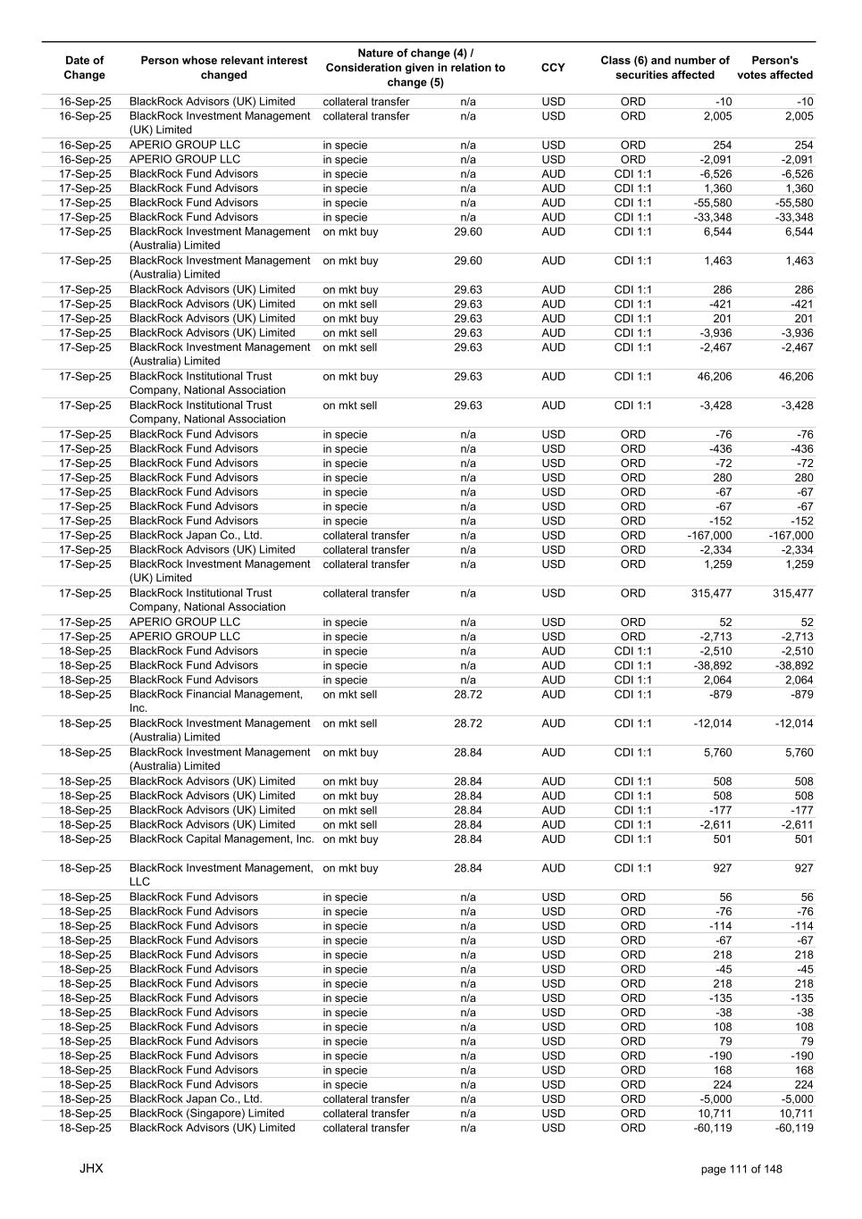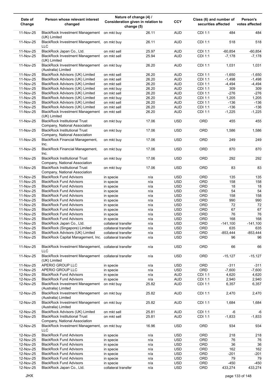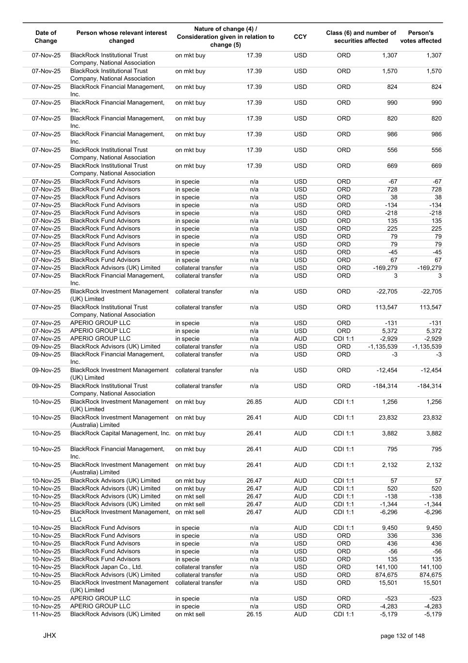 Date of Change Person whose relevant interest changed Nature of change (4) / Consideration given in relation to change (5) Class (6) and number of securities affected Person's votes affected CCY 10-Oct-25 BlackRock Investment Management (UK) Limited collateral transfer n/a USD ORD -35,796 -35,796 10-Oct-25 BlackRock Asset Management North Asia Limited collateral transfer n/a USD ORD 10,519 10,519 10-Oct-25 APERIO GROUP LLC in specie n/a USD ORD -46 -46 10-Oct-25 APERIO GROUP LLC in specie n/a USD ORD 364 364 12-Oct-25 BlackRock (Singapore) Limited collateral transfer n/a USD ORD -6,591 -6,591 12-Oct-25 BlackRock Advisors (UK) Limited collateral transfer n/a USD ORD -1,305,710 -1,305,710 12-Oct-25 BlackRock Financial Management, Inc. collateral transfer n/a USD ORD -619 -619 12-Oct-25 BlackRock Investment Management, LLC collateral transfer n/a USD ORD -30,402 -30,402 12-Oct-25 BlackRock Investment Management (UK) Limited collateral transfer n/a USD ORD -66,429 -66,429 12-Oct-25 BlackRock Asset Management North Asia Limited collateral transfer n/a USD ORD -10,519 -10,519 13-Oct-25 BlackRock Fund Advisors in specie n/a AUD CDI 1:1 -5,550 -5,550 13-Oct-25 BlackRock Capital Management, Inc. on mkt sell 32.81 AUD CDI 1:1 -4,864 -4,864 13-Oct-25 BlackRock Advisors (UK) Limited on mkt buy 32.80 AUD CDI 1:1 76 76 13-Oct-25 BlackRock Advisors (UK) Limited on mkt sell 32.80 AUD CDI 1:1 -5,936 -5,936 13-Oct-25 BlackRock Advisors (UK) Limited on mkt sell 32.80 AUD CDI 1:1 -402 -402 13-Oct-25 BlackRock Advisors (UK) Limited on mkt sell 32.80 AUD CDI 1:1 -3,102 -3,102 13-Oct-25 BlackRock Investment Management (UK) Limited on mkt buy 32.80 AUD CDI 1:1 795 795 13-Oct-25 BlackRock Fund Advisors on mkt buy 21.44 USD ORD 772 772 13-Oct-25 BlackRock Fund Advisors in specie n/a USD ORD 79 79 13-Oct-25 BlackRock Fund Advisors in specie n/a USD ORD 79 79 13-Oct-25 BlackRock Fund Advisors in specie n/a USD ORD -67 -67 13-Oct-25 BlackRock Fund Advisors in specie n/a USD ORD -114 -114 13-Oct-25 BlackRock Fund Advisors in specie n/a USD ORD 67 67 13-Oct-25 BlackRock Fund Advisors in specie n/a USD ORD -36 -36 13-Oct-25 BlackRock Fund Advisors in specie n/a USD ORD -56 -56 13-Oct-25 BlackRock Advisors (UK) Limited collateral transfer n/a USD ORD 9,999 9,999 13-Oct-25 BlackRock Investment Management, LLC collateral transfer n/a USD ORD 6,156 6,156 13-Oct-25 BlackRock Investment Management (UK) Limited collateral transfer n/a USD ORD 456,774 456,774 13-Oct-25 APERIO GROUP LLC in specie n/a USD ORD -107 -107 13-Oct-25 APERIO GROUP LLC in specie n/a USD ORD -106 -106 14-Oct-25 BlackRock Fund Advisors in specie n/a AUD CDI 1:1 -5,872 -5,872 14-Oct-25 BlackRock Advisors (UK) Limited on mkt buy 32.50 AUD CDI 1:1 1,484 1,484 14-Oct-25 BlackRock Advisors (UK) Limited on mkt buy 32.50 AUD CDI 1:1 1,484 1,484 14-Oct-25 BlackRock Advisors (UK) Limited on mkt sell 32.50 AUD CDI 1:1 -199 -199 14-Oct-25 BlackRock Institutional Trust Company, National Association on mkt sell 32.50 AUD CDI 1:1 -16,455 -16,455 14-Oct-25 BlackRock Japan Co., Ltd. on mkt sell 32.50 AUD CDI 1:1 -3,472 -3,472 14-Oct-25 BlackRock Investment Management (UK) Limited on mkt buy 32.50 AUD CDI 1:1 45,045 45,045 14-Oct-25 BlackRock Advisors (UK) Limited on mkt buy 22.41 USD ORD 24 24 14-Oct-25 BlackRock Fund Advisors in specie n/a USD ORD -147 -147 14-Oct-25 BlackRock Fund Advisors in specie n/a USD ORD 218 218 14-Oct-25 BlackRock Fund Advisors in specie n/a USD ORD 134 134 14-Oct-25 BlackRock Fund Advisors in specie n/a USD ORD 79 79 14-Oct-25 BlackRock Fund Advisors in specie n/a USD ORD 79 79 14-Oct-25 BlackRock Fund Advisors in specie n/a USD ORD 79 79 14-Oct-25 BlackRock Fund Advisors in specie n/a USD ORD -45 -45 14-Oct-25 BlackRock Fund Advisors in specie n/a USD ORD 18 18 14-Oct-25 BlackRock Fund Advisors in specie n/a USD ORD 79 79 14-Oct-25 BlackRock Fund Advisors in specie n/a USD ORD 90 90 14-Oct-25 BlackRock Fund Advisors in specie n/a USD ORD 36 36 14-Oct-25 BlackRock Japan Co., Ltd. collateral transfer n/a USD ORD 79,900 79,900 14-Oct-25 BlackRock Advisors (UK) Limited collateral transfer n/a USD ORD 1,365,923 1,365,923 14-Oct-25 BlackRock Investment Management, LLC collateral transfer n/a USD ORD -6,156 -6,156 14-Oct-25 BlackRock Investment Management (UK) Limited collateral transfer n/a USD ORD -456,774 -456,774 14-Oct-25 BlackRock Institutional Trust Company, National Association collateral transfer n/a USD ORD 72 72 14-Oct-25 APERIO GROUP LLC in specie n/a USD ORD -8 -8 14-Oct-25 APERIO GROUP LLC in specie n/a USD ORD 1,800 1,800 15-Oct-25 BlackRock Fund Advisors in specie n/a AUD CDI 1:1 -2,171 -2,171 15-Oct-25 BlackRock Fund Advisors in specie n/a AUD CDI 1:1 -102 -102 JHX page 121 of 148