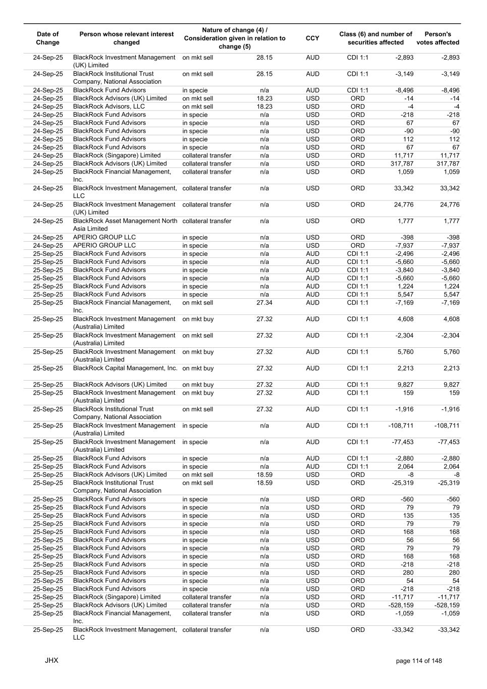 Date of Change Person whose relevant interest changed Nature of change (4) / Consideration given in relation to change (5) Class (6) and number of securities affected Person's votes affected CCY 19-Sep-25 BlackRock Asset Management North Asia Limited collateral transfer n/a USD ORD -1,595 -1,595 19-Sep-25 BlackRock Institutional Trust Company, National Association collateral transfer n/a USD ORD -475,412 -475,412 19-Sep-25 BlackRock Investment Management (UK) Limited in specie n/a AUD CDI 1:1 11,783 11,783 19-Sep-25 APERIO GROUP LLC in specie n/a USD ORD -329 -329 19-Sep-25 APERIO GROUP LLC in specie n/a USD ORD -6,179 -6,179 21-Sep-25 BlackRock Advisors (UK) Limited collateral transfer n/a USD ORD -73,772 -73,772 21-Sep-25 BlackRock Investment Management (UK) Limited collateral transfer n/a USD ORD -62,543 -62,543 22-Sep-25 BlackRock Fund Advisors in specie n/a AUD CDI 1:1 -2,768 -2,768 22-Sep-25 BlackRock Fund Advisors in specie n/a AUD CDI 1:1 -11,072 -11,072 22-Sep-25 BlackRock Fund Advisors in specie n/a AUD CDI 1:1 1,384 1,384 22-Sep-25 BlackRock Fund Advisors in specie n/a AUD CDI 1:1 1,038 1,038 22-Sep-25 BlackRock Investment Management (UK) Limited on mkt buy 29.30 AUD CDI 1:1 1,975 1,975 22-Sep-25 BlackRock Investment Management (Australia) Limited on mkt buy 29.37 AUD CDI 1:1 1,032 1,032 22-Sep-25 BlackRock Investment Management (Australia) Limited on mkt buy 29.37 AUD CDI 1:1 4,032 4,032 22-Sep-25 BlackRock Capital Management, Inc. on mkt buy 29.37 AUD CDI 1:1 121 121 22-Sep-25 BlackRock Financial Management, Inc. on mkt sell 29.37 AUD CDI 1:1 -5,332 -5,332 22-Sep-25 BlackRock Fund Advisors on mkt buy 29.37 AUD CDI 1:1 5,903 5,903 22-Sep-25 BlackRock Investment Management (Australia) Limited on mkt buy 29.37 AUD CDI 1:1 2,181 2,181 22-Sep-25 BlackRock Fund Advisors in specie n/a USD ORD 1,350 1,350 22-Sep-25 BlackRock Fund Advisors in specie n/a USD ORD -36 -36 22-Sep-25 BlackRock Fund Advisors in specie n/a USD ORD 218 218 22-Sep-25 BlackRock Fund Advisors in specie n/a USD ORD -134 -134 22-Sep-25 BlackRock Fund Advisors in specie n/a USD ORD -152 -152 22-Sep-25 BlackRock Fund Advisors in specie n/a USD ORD 360 360 22-Sep-25 BlackRock Fund Advisors in specie n/a USD ORD 603 603 22-Sep-25 BlackRock Fund Advisors in specie n/a USD ORD 79 79 22-Sep-25 BlackRock Fund Advisors in specie n/a USD ORD 436 436 22-Sep-25 BlackRock Japan Co., Ltd. collateral transfer n/a USD ORD 129,800 129,800 22-Sep-25 BlackRock Advisors (UK) Limited collateral transfer n/a USD ORD 1,018,489 1,018,489 22-Sep-25 BlackRock Institutional Trust Company, National Association collateral transfer n/a USD ORD 722,237 722,237 22-Sep-25 APERIO GROUP LLC in specie n/a USD ORD -154 -154 22-Sep-25 APERIO GROUP LLC in specie n/a USD ORD -4,451 -4,451 23-Sep-25 BlackRock Fund Advisors in specie n/a AUD CDI 1:1 -2,160 -2,160 23-Sep-25 BlackRock Advisors (UK) Limited on mkt buy 29.56 AUD CDI 1:1 36 36 23-Sep-25 BlackRock Advisors (UK) Limited on mkt sell 29.56 AUD CDI 1:1 -10,764 -10,764 23-Sep-25 BlackRock Investment Management (UK) Limited on mkt sell 29.56 AUD CDI 1:1 -891 -891 23-Sep-25 BlackRock Advisors (UK) Limited on mkt buy 29.56 AUD CDI 1:1 359 359 23-Sep-25 BlackRock Fund Advisors in specie n/a AUD CDI 1:1 -2,700 -2,700 23-Sep-25 BlackRock Fund Advisors in specie n/a USD ORD 335 335 23-Sep-25 BlackRock Fund Advisors in specie n/a USD ORD -162 -162 23-Sep-25 BlackRock Fund Advisors in specie n/a USD ORD 168 168 23-Sep-25 BlackRock Fund Advisors in specie n/a USD ORD -67 -67 23-Sep-25 BlackRock Fund Advisors in specie n/a USD ORD -90 -90 23-Sep-25 BlackRock Fund Advisors in specie n/a USD ORD -616 -616 23-Sep-25 BlackRock Fund Advisors in specie n/a USD ORD -1,314 -1,314 23-Sep-25 BlackRock Fund Advisors in specie n/a USD ORD -2,479 -2,479 23-Sep-25 BlackRock Fund Advisors in specie n/a USD ORD -335 -335 23-Sep-25 BlackRock Japan Co., Ltd. collateral transfer n/a USD ORD -129,800 -129,800 23-Sep-25 BlackRock Advisors (UK) Limited collateral transfer n/a USD ORD 1,961 1,961 23-Sep-25 BlackRock Institutional Trust Company, National Association collateral transfer n/a USD ORD -722,237 -722,237 23-Sep-25 APERIO GROUP LLC in specie n/a USD ORD -395 -395 23-Sep-25 APERIO GROUP LLC in specie n/a USD ORD -6,923 -6,923 24-Sep-25 BlackRock Fund Advisors in specie n/a AUD CDI 1:1 2,574 2,574 24-Sep-25 BlackRock Investment Management (Australia) Limited on mkt sell 28.14 AUD CDI 1:1 -2,188 -2,188 24-Sep-25 BlackRock Investment Management (Australia) Limited on mkt sell 28.14 AUD CDI 1:1 -2,678 -2,678 24-Sep-25 BlackRock Investment Management (Australia) Limited on mkt sell 28.14 AUD CDI 1:1 -1,713 -1,713 24-Sep-25 BlackRock Advisors (UK) Limited on mkt buy 28.15 AUD CDI 1:1 474 474 JHX page 113 of 148