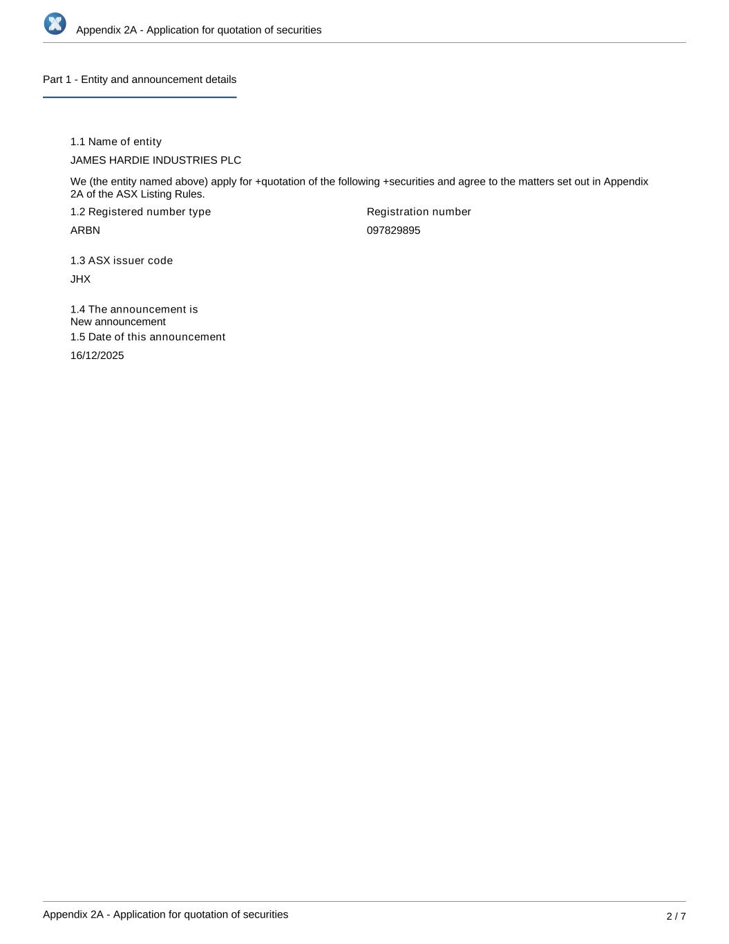 Appendix 2A - Application for quotation of securities Appendix 2A - Application for quotation of securities 2 / 7 Part 1 - Entity and announcement details 1.1 Name of entity JAMES HARDIE INDUSTRIES PLC We (the entity named above) apply for +quotation of the following +securities and agree to the matters set out in Appendix 2A of the ASX Listing Rules. 1.2 Registered number type ARBN Registration number 097829895 1.3 ASX issuer code JHX 1.4 The announcement is 1.5 Date of this announcement 16/12/2025 New announcement