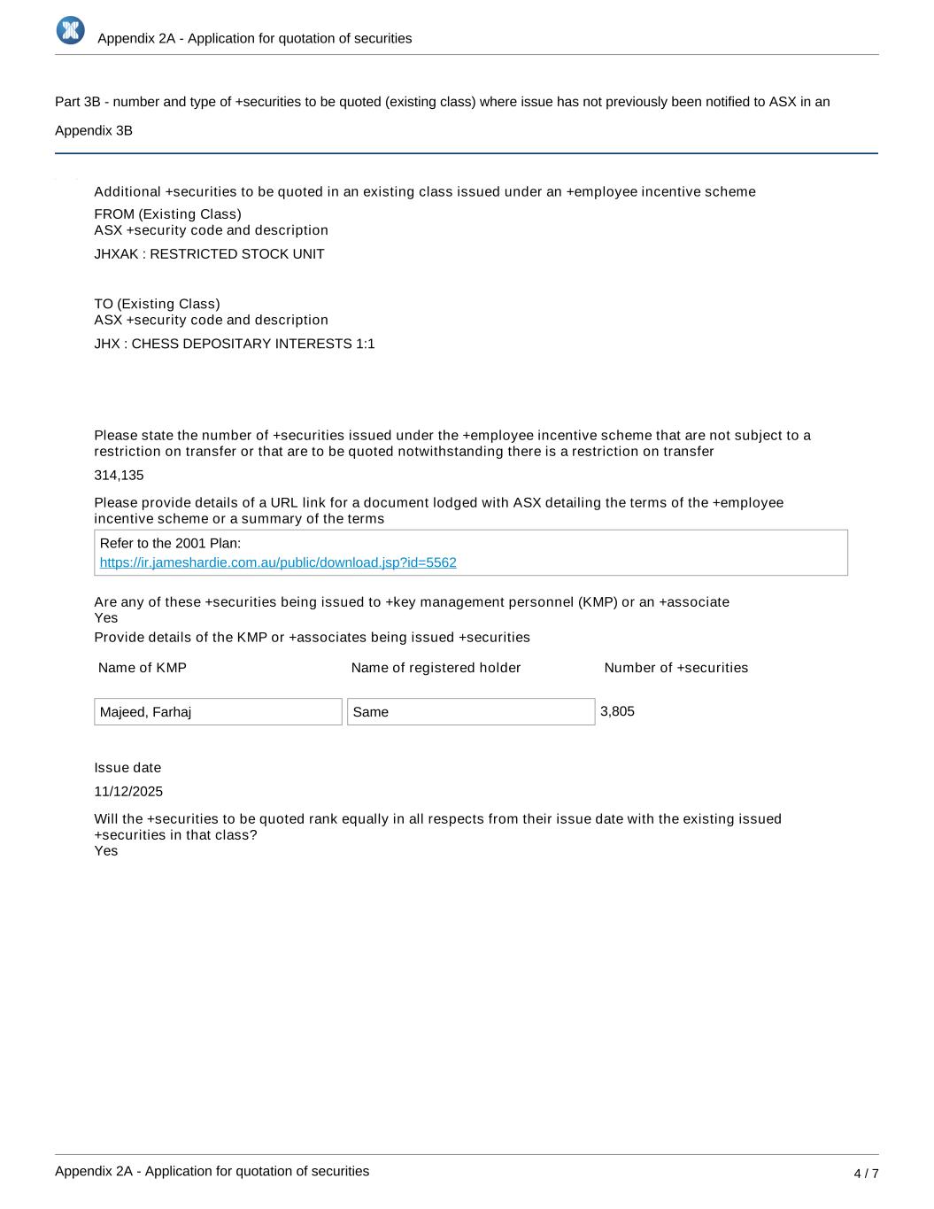 Appendix 2A - Application for quotation of securities Appendix 2A - Application for quotation of securities 4 / 7 Part 3B - number and type of +securities to be quoted (existing class) where issue has not previously been notified to ASX in an Appendix 3B Additional +securities to be quoted in an existing class issued under an +employee incentive scheme FROM (Existing Class) ASX +security code and description JHXAK : RESTRICTED STOCK UNIT TO (Existing Class) ASX +security code and description JHX : CHESS DEPOSITARY INTERESTS 1:1 Please state the number of +securities issued under the +employee incentive scheme that are not subject to a restriction on transfer or that are to be quoted notwithstanding there is a restriction on transfer 314,135 Please provide details of a URL link for a document lodged with ASX detailing the terms of the +employee incentive scheme or a summary of the terms Refer to the 2001 Plan: https://ir.jameshardie.com.au/public/download.jsp?id=5562 Are any of these +securities being issued to +key management personnel (KMP) or an +associate Provide details of the KMP or +associates being issued +securities Name of KMP Name of registered holder Number of +securities Majeed, Farhaj Same 3,805 Issue date 11/12/2025 Will the +securities to be quoted rank equally in all respects from their issue date with the existing issued +securities in that class? Yes Yes