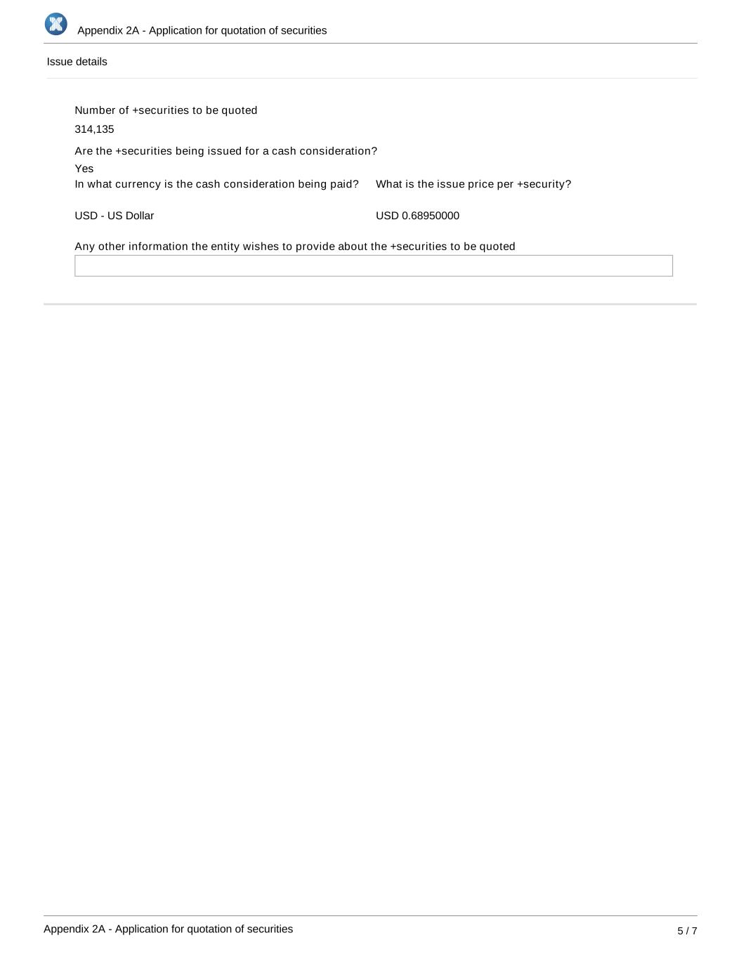 Appendix 2A - Application for quotation of securities Appendix 2A - Application for quotation of securities 5 / 7 Issue details Number of +securities to be quoted 314,135 Are the +securities being issued for a cash consideration? In what currency is the cash consideration being paid? USD - US Dollar What is the issue price per +security? USD 0.68950000 Any other information the entity wishes to provide about the +securities to be quoted Yes